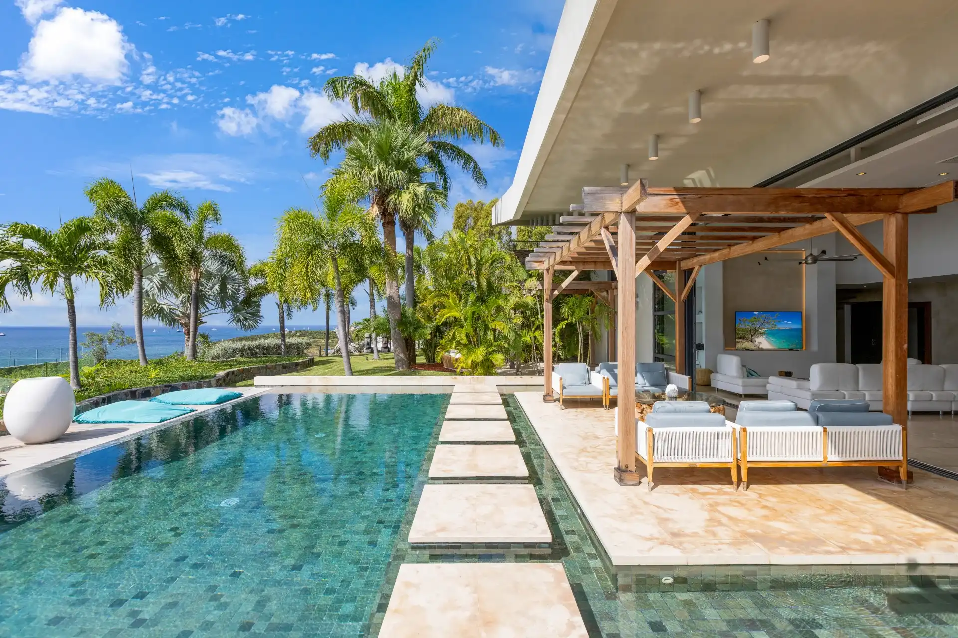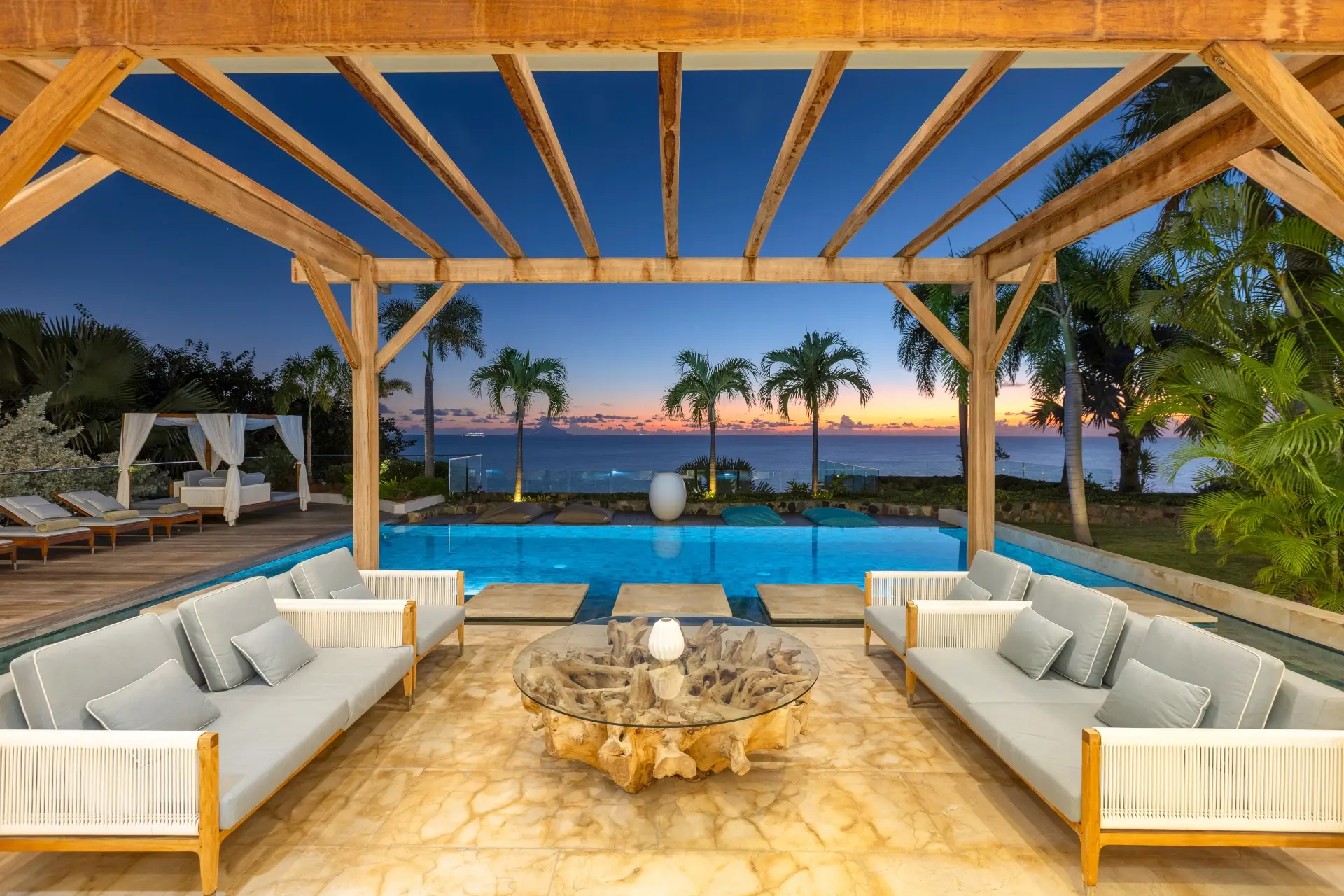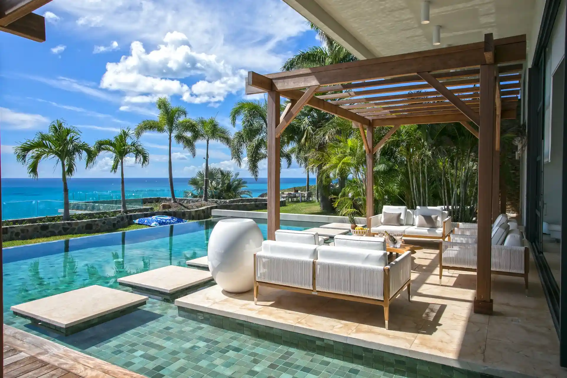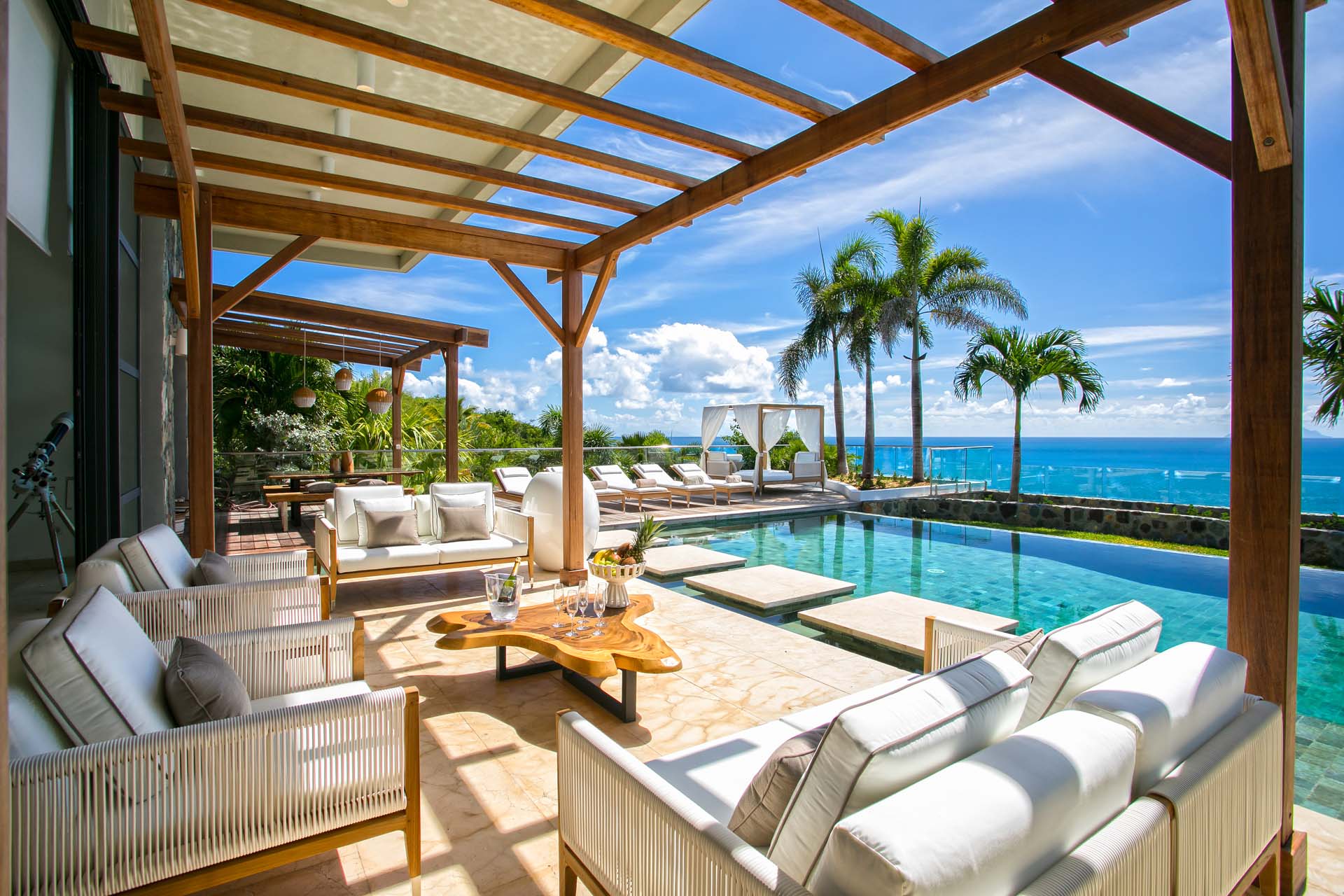 The villa has gorgeous outdoor spaces to enjoy the Caribbean tropical climate. A large shaded living space is just steps from both the pool. This beautiful infinity pool includes built in steps from the outdoor living room to the dining space. Another terrace features daybeds for a sunny spot to lounge by the pool and enjoy the views.