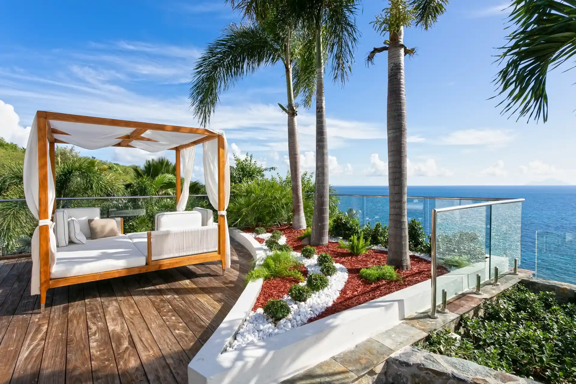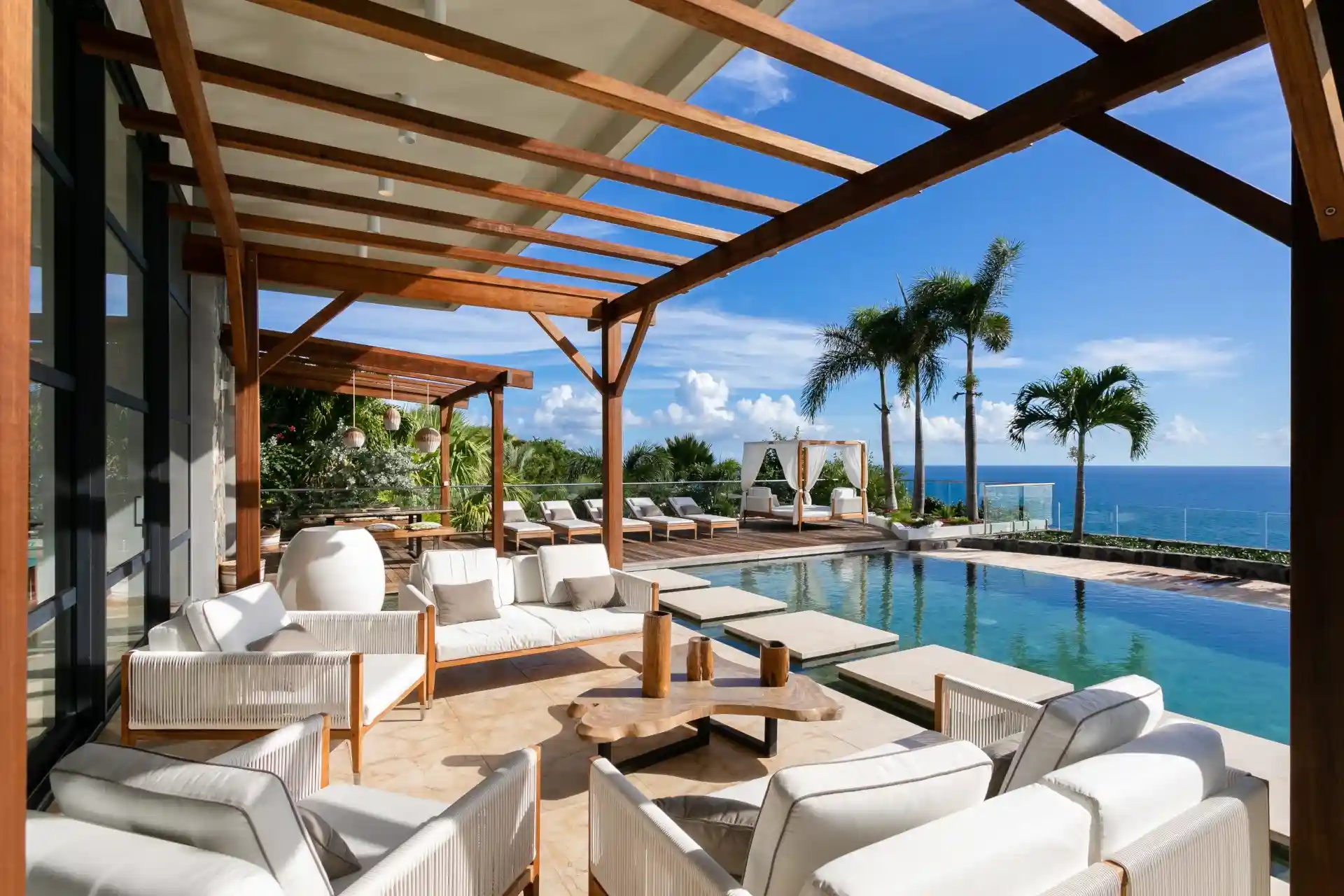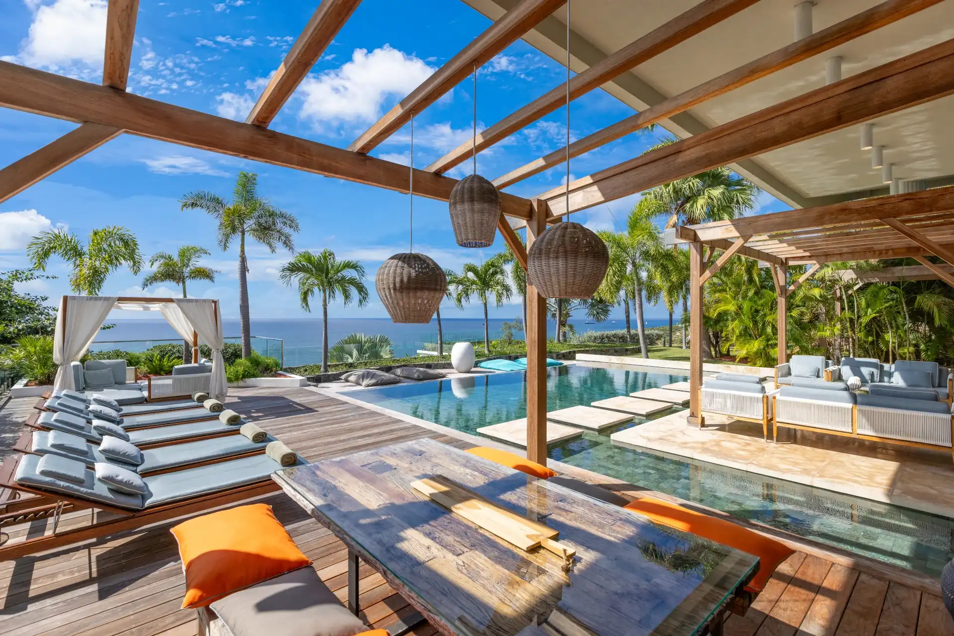 The villa has gorgeous outdoor spaces to enjoy the Caribbean tropical climate. A large shaded living space is just steps from both the pool. This beautiful infinity pool includes built in steps from the outdoor living room to the dining space. Another terrace features daybeds for a sunny spot to lounge by the pool and enjoy the views.