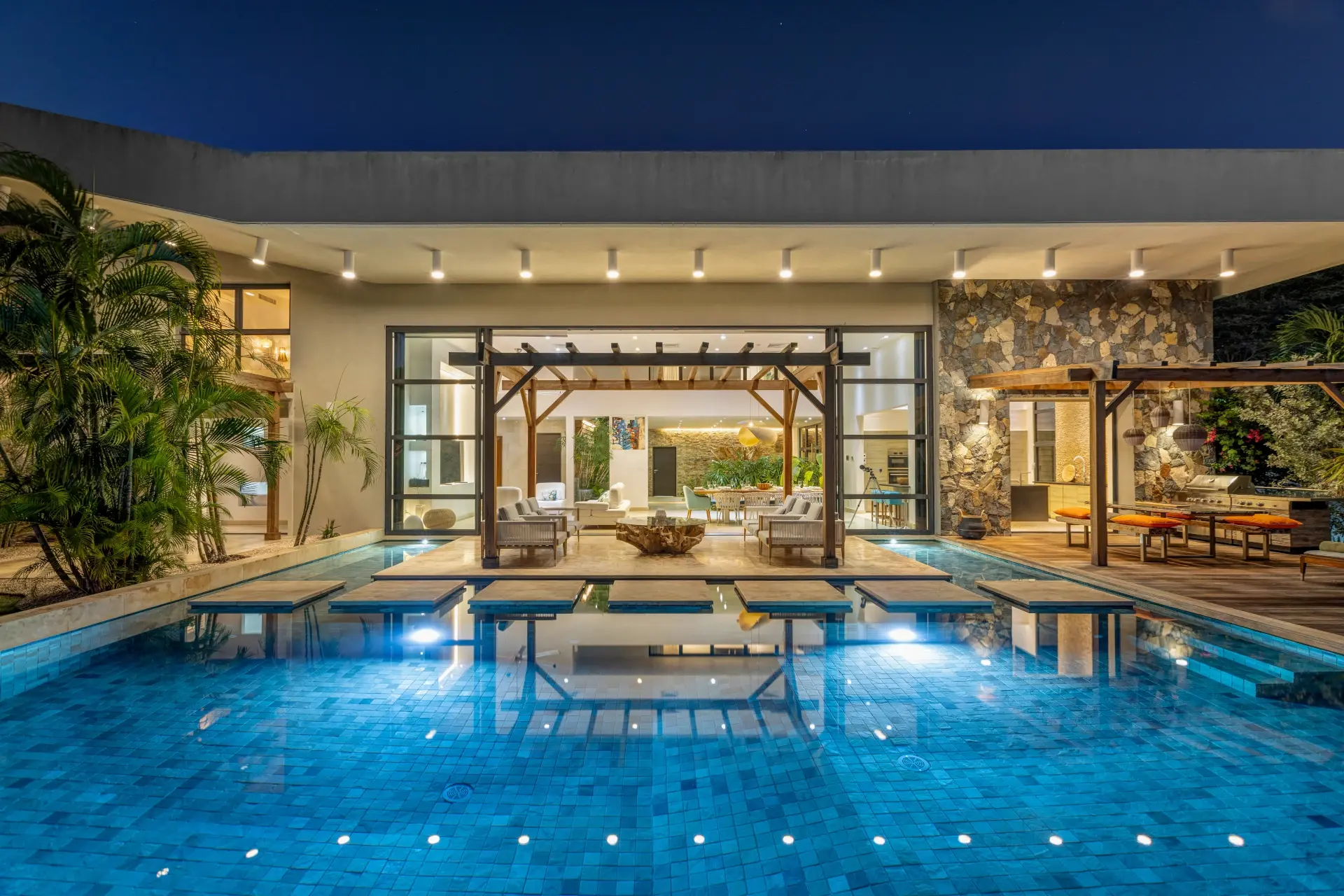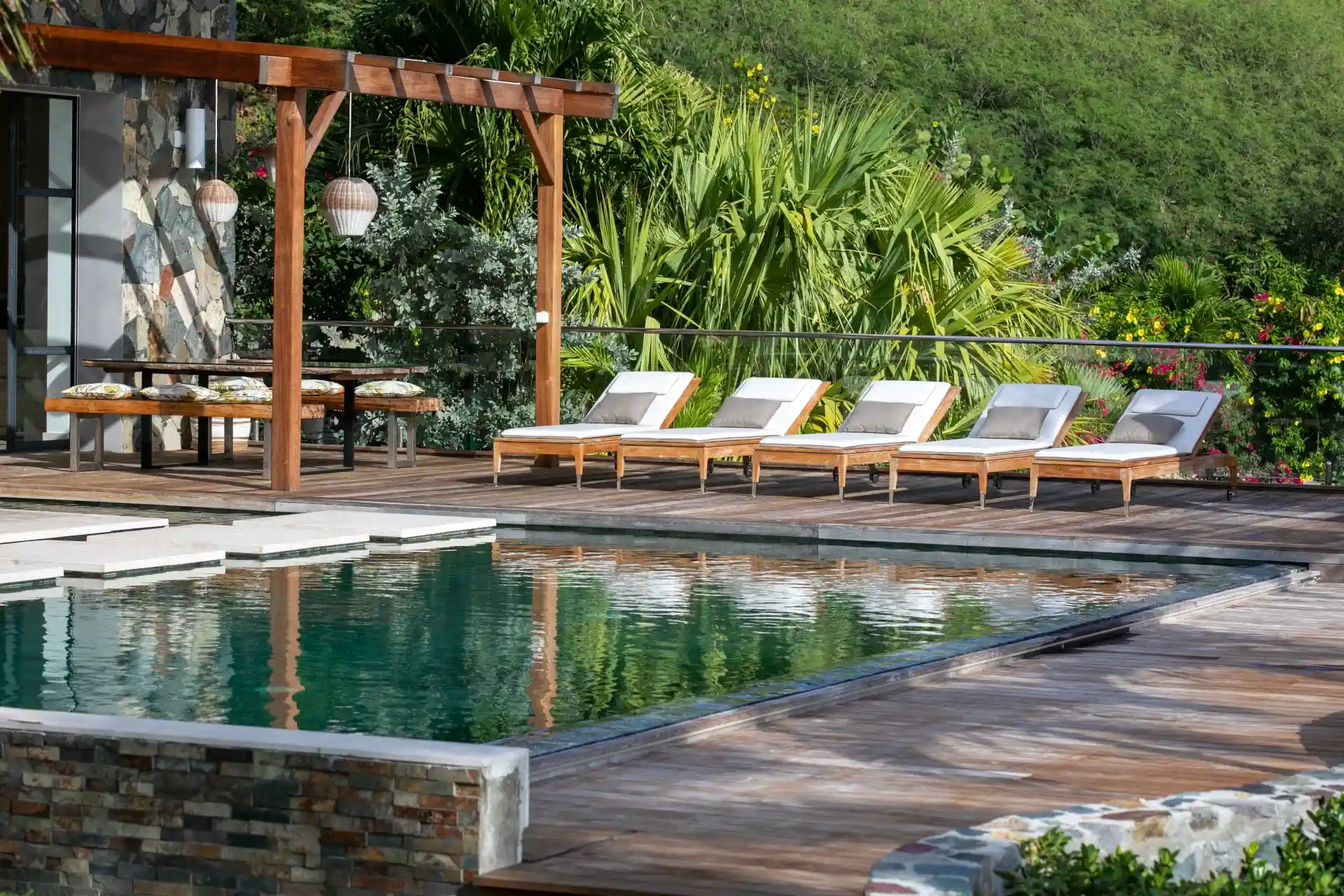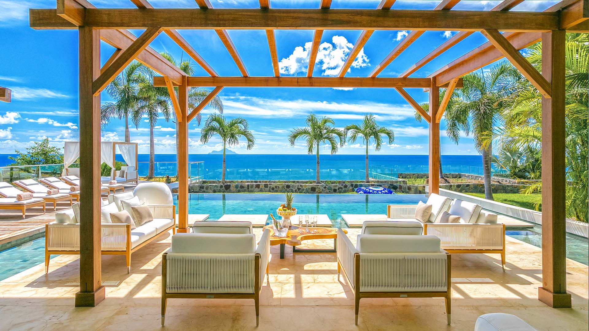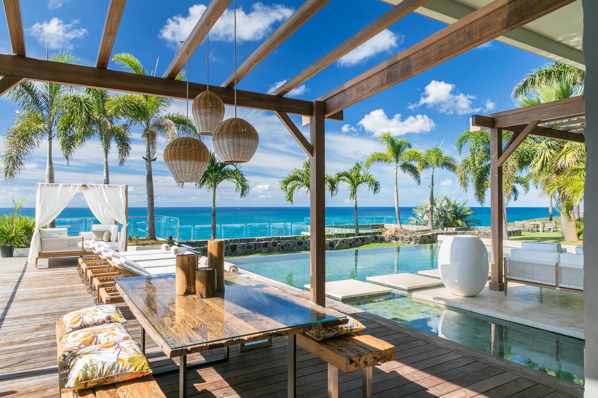 The villa has gorgeous outdoor spaces to enjoy the Caribbean tropical climate. A large shaded living space is just steps from both the pool. This beautiful infinity pool includes built in steps from the outdoor living room to the dining space. Another terrace features daybeds for a sunny spot to lounge by the pool and enjoy the views.
