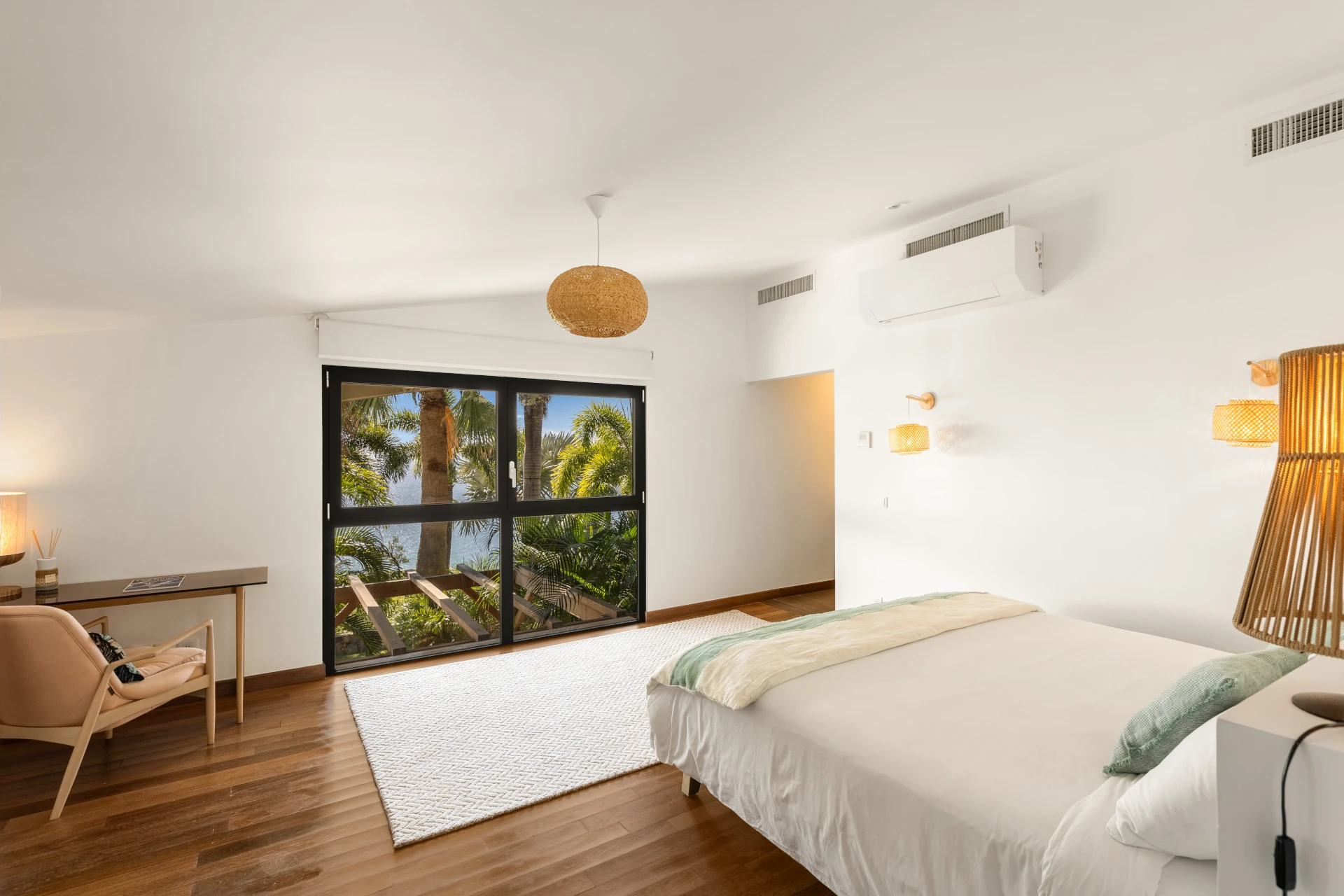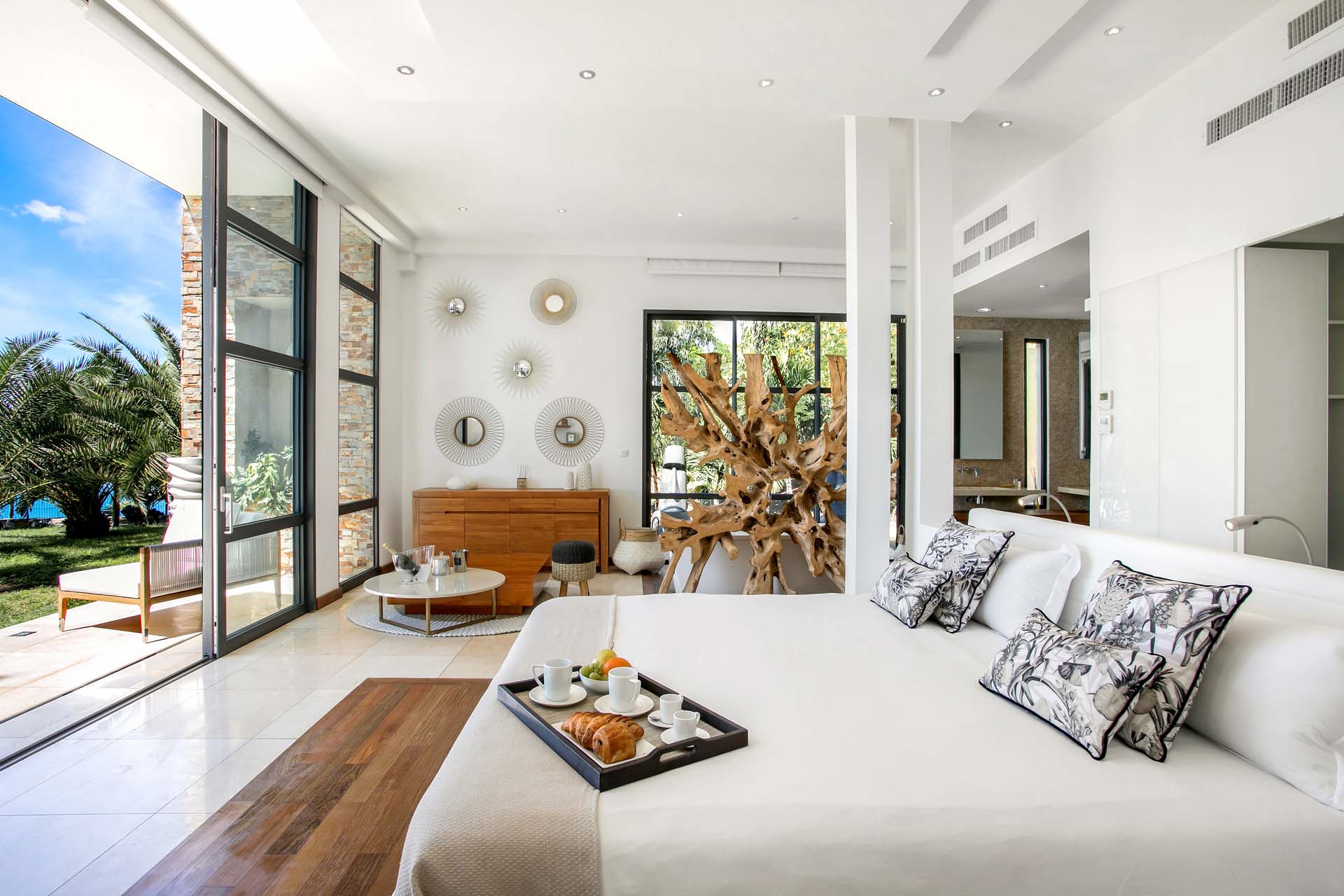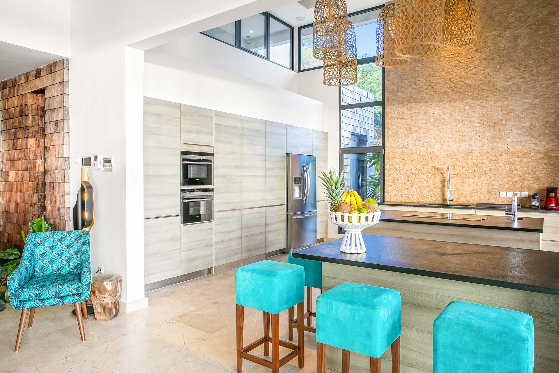 Find the magic of Villa Emeraude upon entering, when you discover several indoor ponds filled with beautiful colorful fish creating a decorative and soothing water garden. This amazing entrance leads to a beautiful interior living space with high ceilings facing the swimming pool and the azur sea. An elegant yet comfortable living room blends with the outdoor ocean colors while the large solid wood dining table joins the space to the fully-equipped kitchen. Special to the kitchen is the hidden pantry. Meals can also be taken outside at the table near the pool.