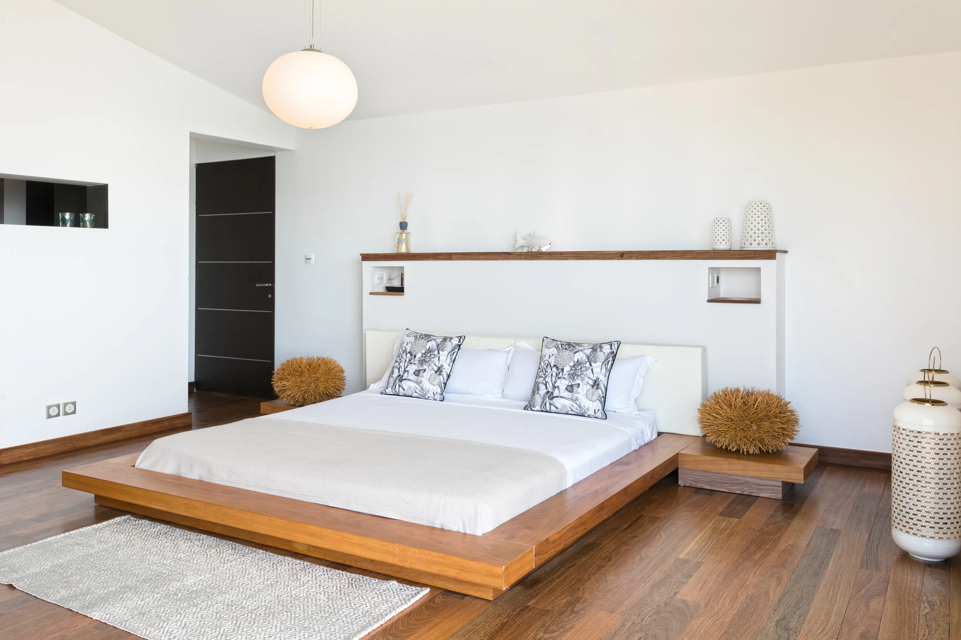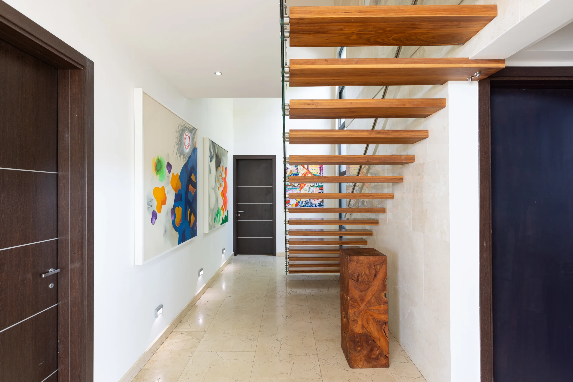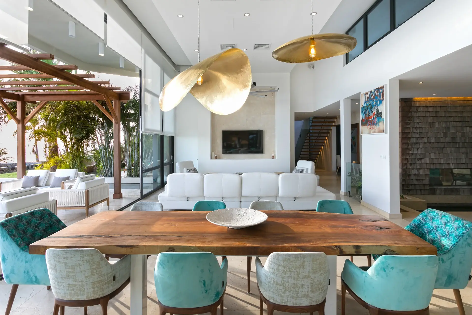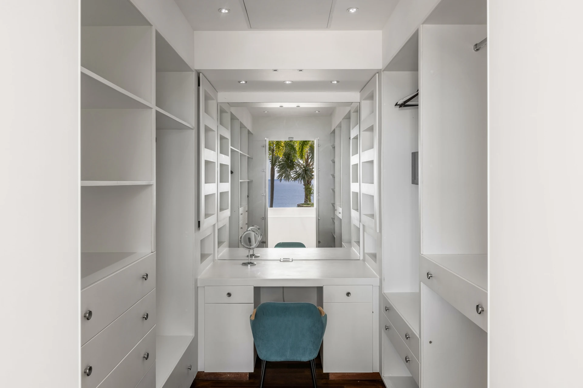 Find the magic of Villa Emeraude upon entering, when you discover several indoor ponds filled with beautiful colorful fish creating a decorative and soothing water garden. This amazing entrance leads to a beautiful interior living space with high ceilings facing the swimming pool and the azur sea. An elegant yet comfortable living room blends with the outdoor ocean colors while the large solid wood dining table joins the space to the fully-equipped kitchen. Special to the kitchen is the hidden pantry. Meals can also be taken outside at the table near the pool.