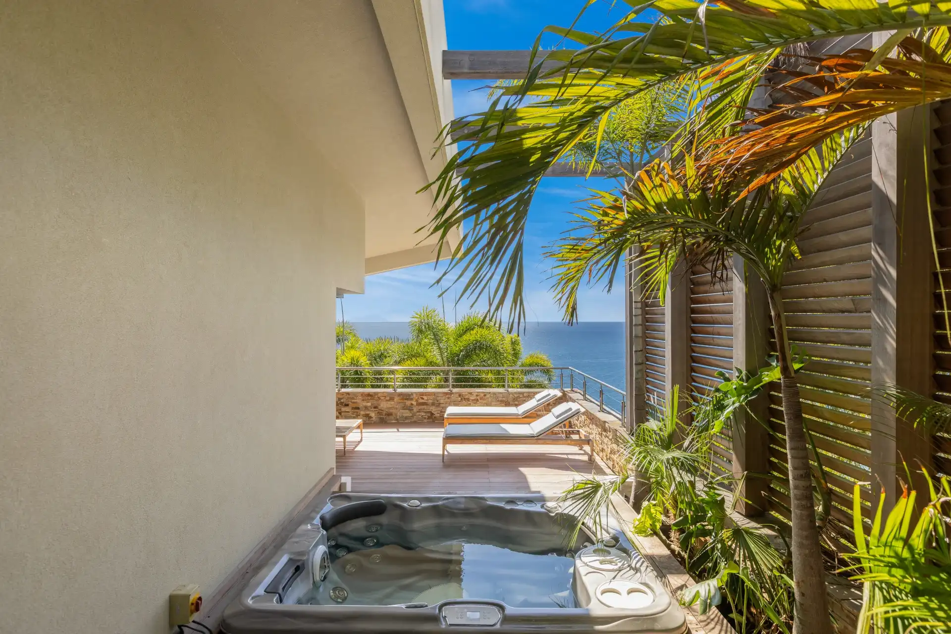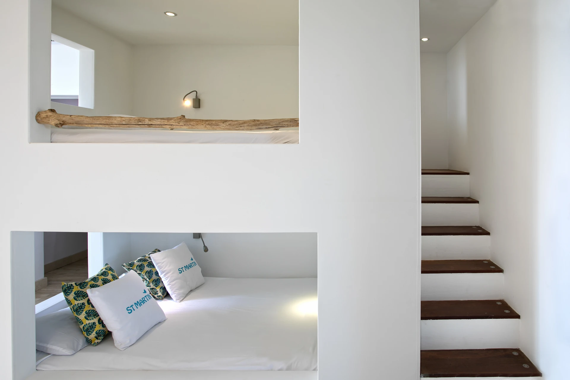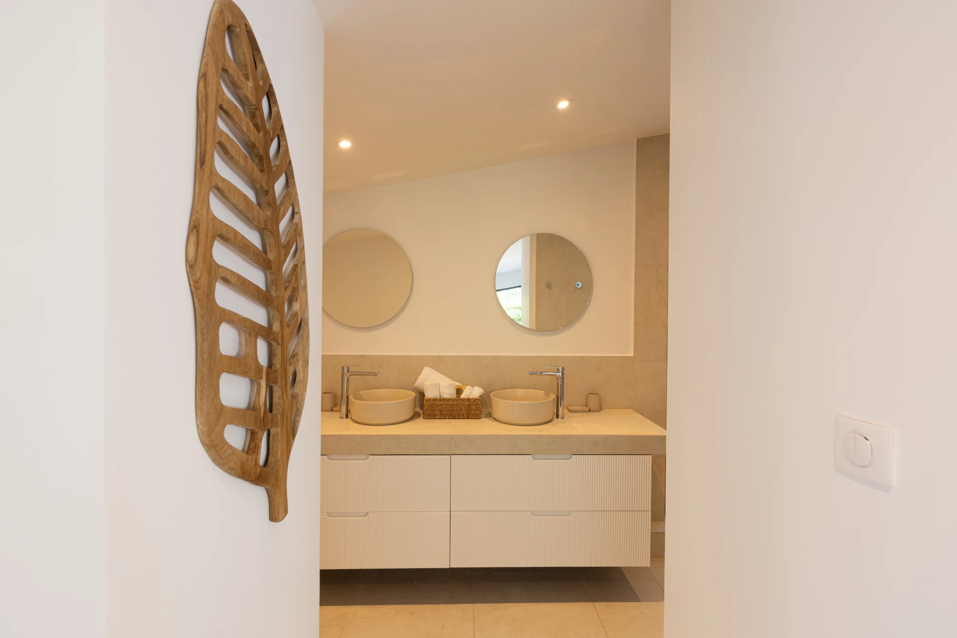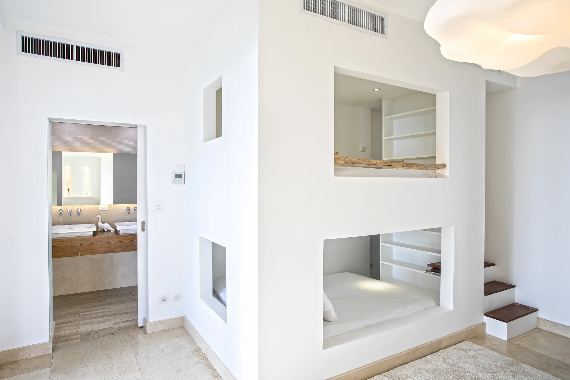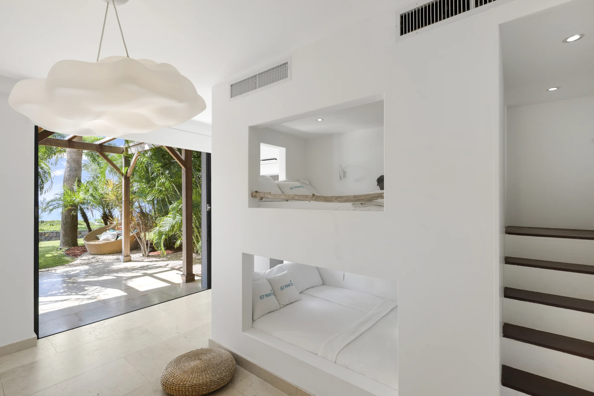 Each bedroom at Villa Emeraude has its own private bathroom with stylish, modern amenities, ensuring every guest enjoys privacy and comfort throughout their stay. The first three bedrooms are located on the main level, including the master suite, which opens directly onto the tropical garden, offering a refreshing and exotic start to each morning. One of the other two rooms features two large bunk beds, providing the ideal setup for children and close proximity to the master bedroom. The remaining two bedrooms are located upstairs. One of them features its own private terrace with a jacuzzi, creating a secluded space for relaxation. Each of these rooms has its own ensuite bathroom.