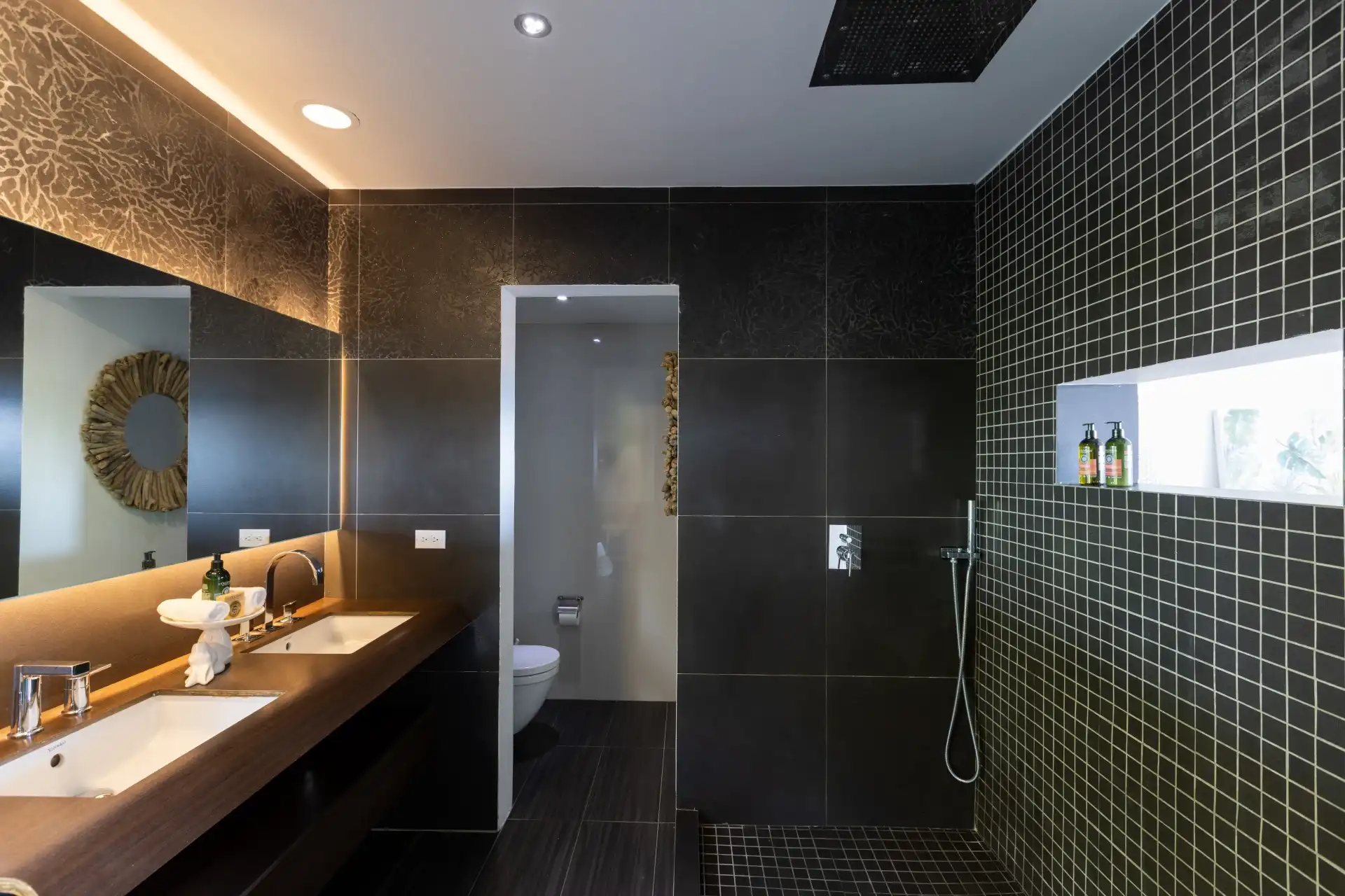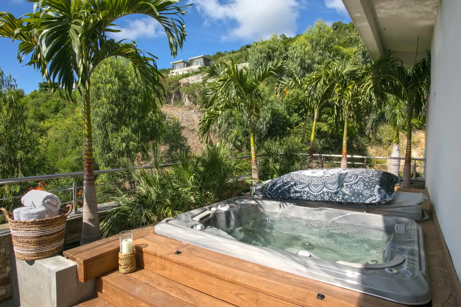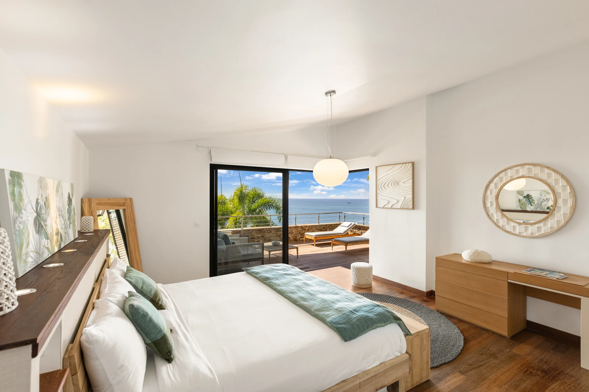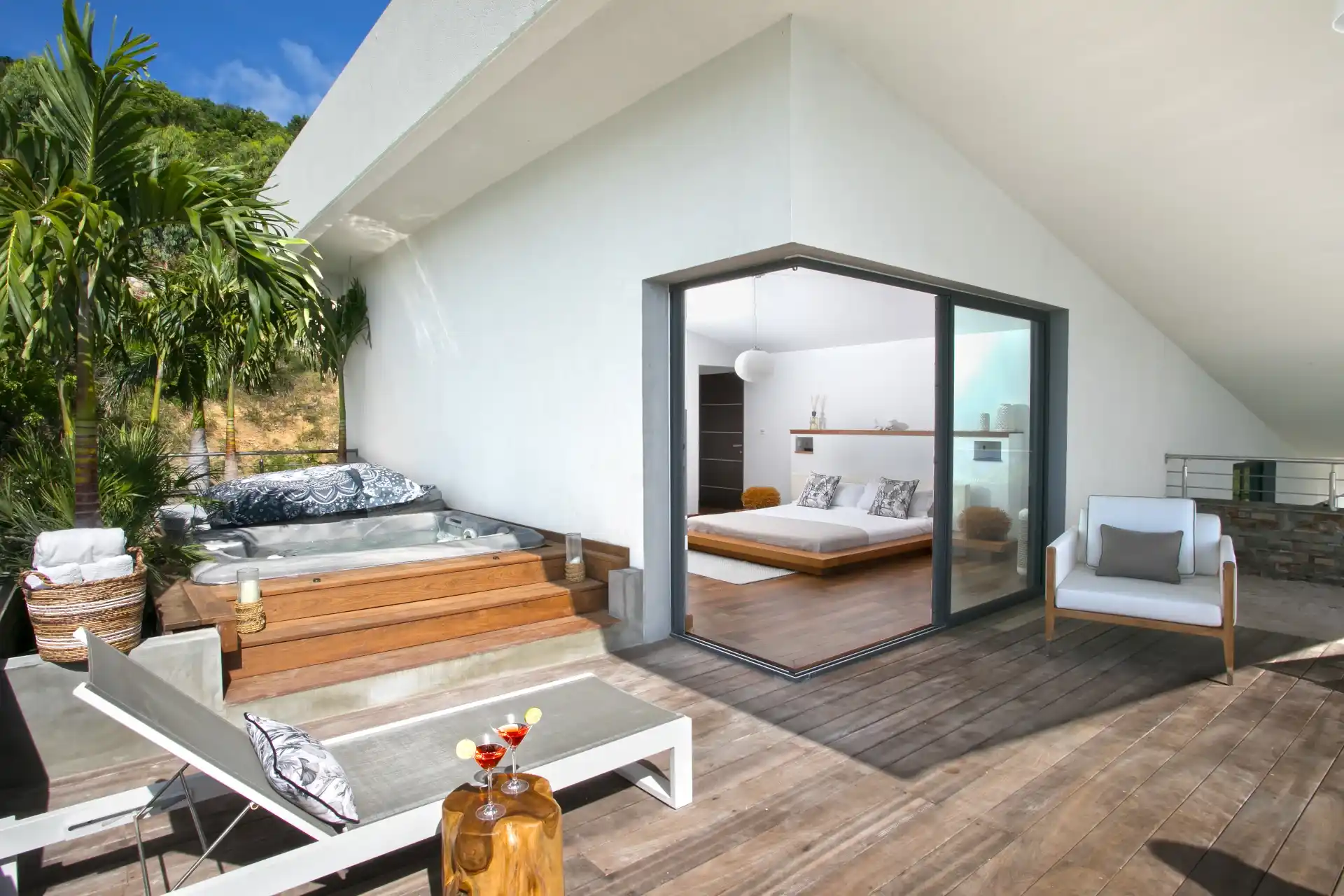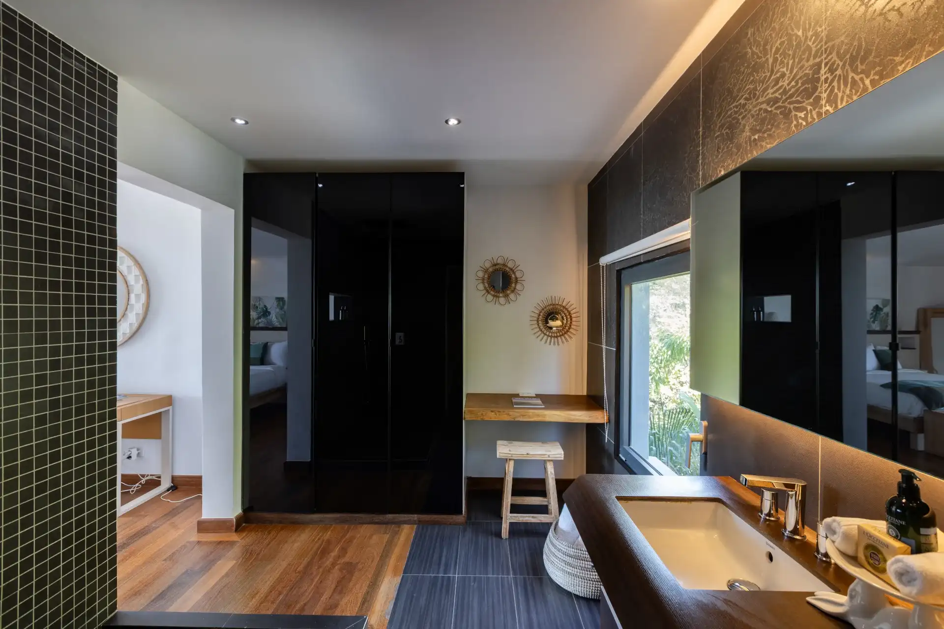 Each bedroom at Villa Emeraude has its own private bathroom with stylish, modern amenities, ensuring every guest enjoys privacy and comfort throughout their stay. The first three bedrooms are located on the main level, including the master suite, which opens directly onto the tropical garden, offering a refreshing and exotic start to each morning. One of the other two rooms features two large bunk beds, providing the ideal setup for children and close proximity to the master bedroom. The remaining two bedrooms are located upstairs. One of them features its own private terrace with a jacuzzi, creating a secluded space for relaxation. Each of these rooms has its own ensuite bathroom.