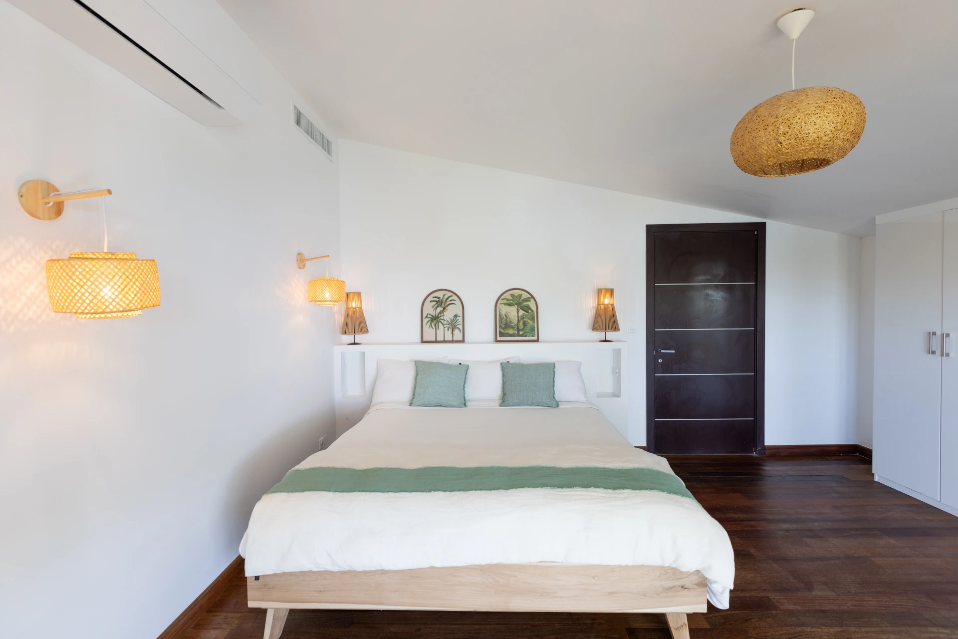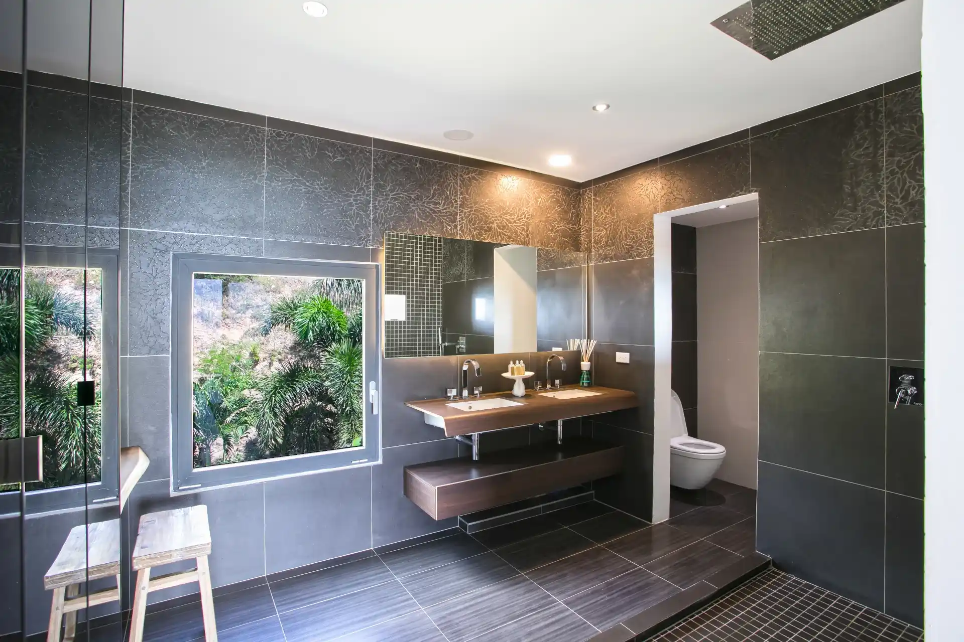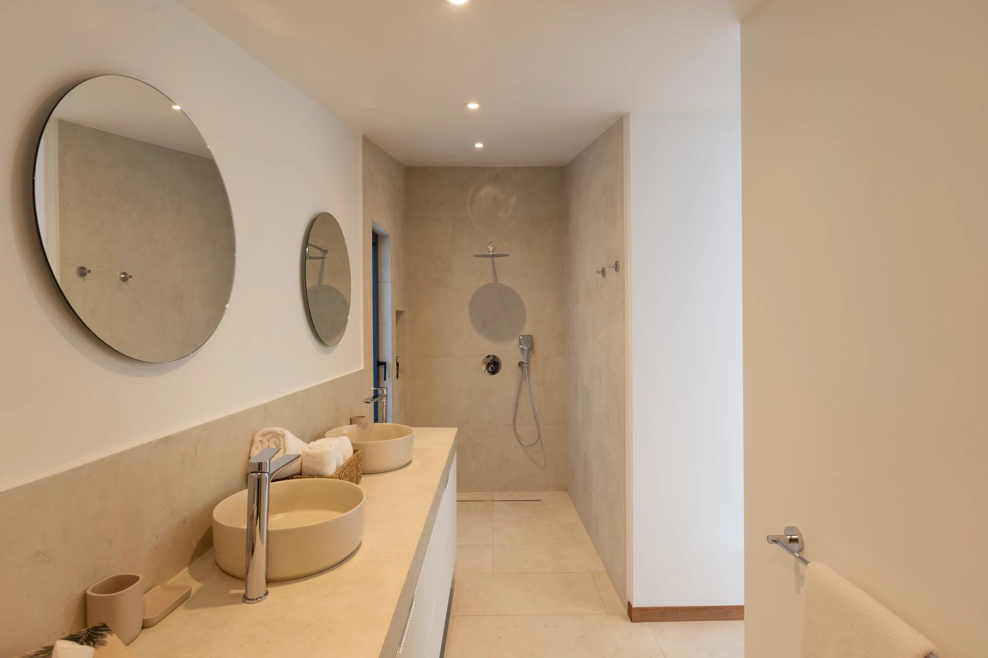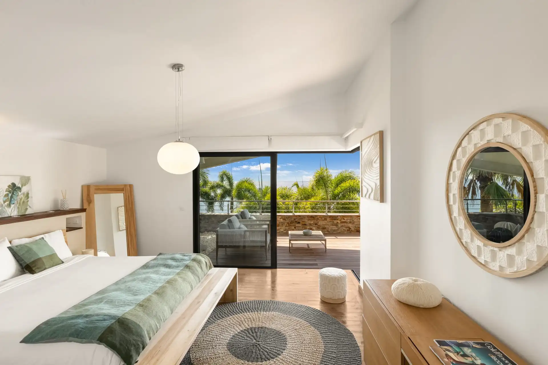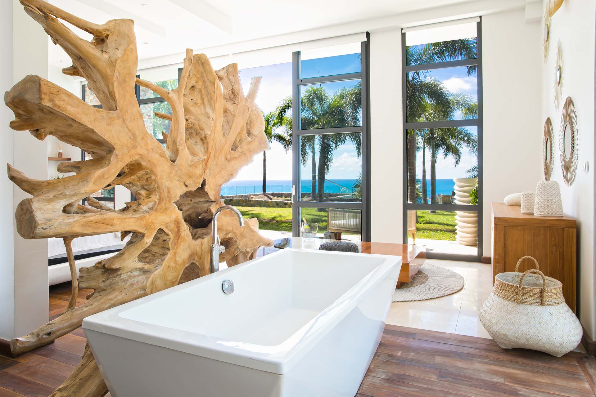 Each bedroom at Villa Emeraude has its own private bathroom with stylish, modern amenities, ensuring every guest enjoys privacy and comfort throughout their stay. The first three bedrooms are located on the main level, including the master suite, which opens directly onto the tropical garden, offering a refreshing and exotic start to each morning. One of the other two rooms features two large bunk beds, providing the ideal setup for children and close proximity to the master bedroom. The remaining two bedrooms are located upstairs. One of them features its own private terrace with a jacuzzi, creating a secluded space for relaxation. Each of these rooms has its own ensuite bathroom.