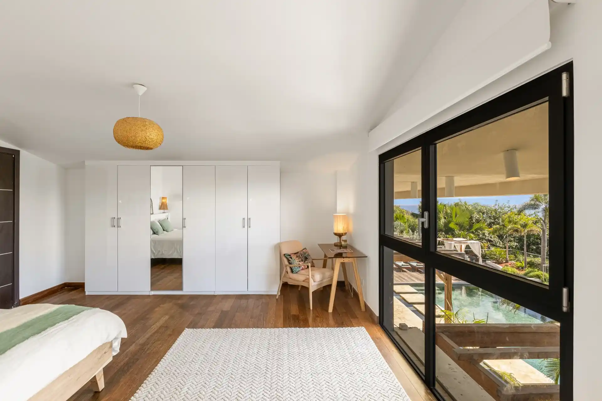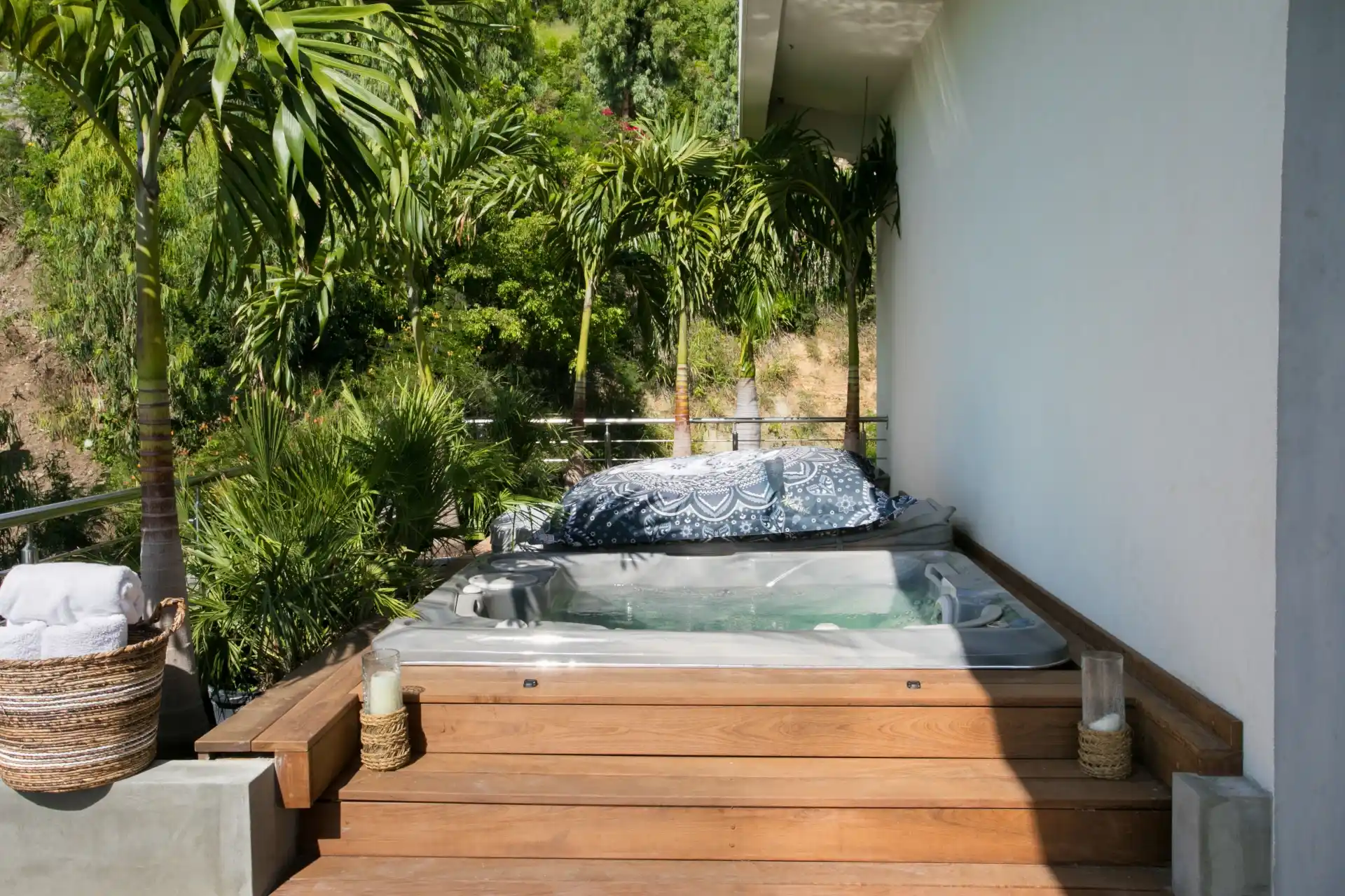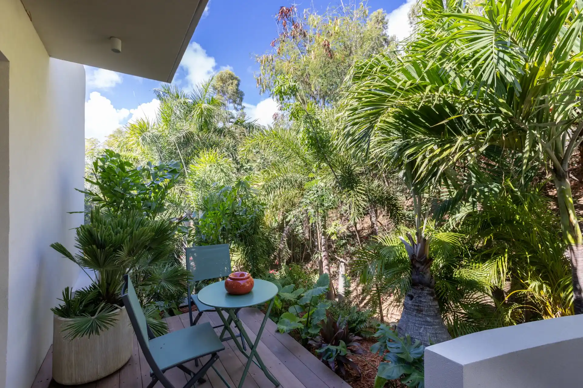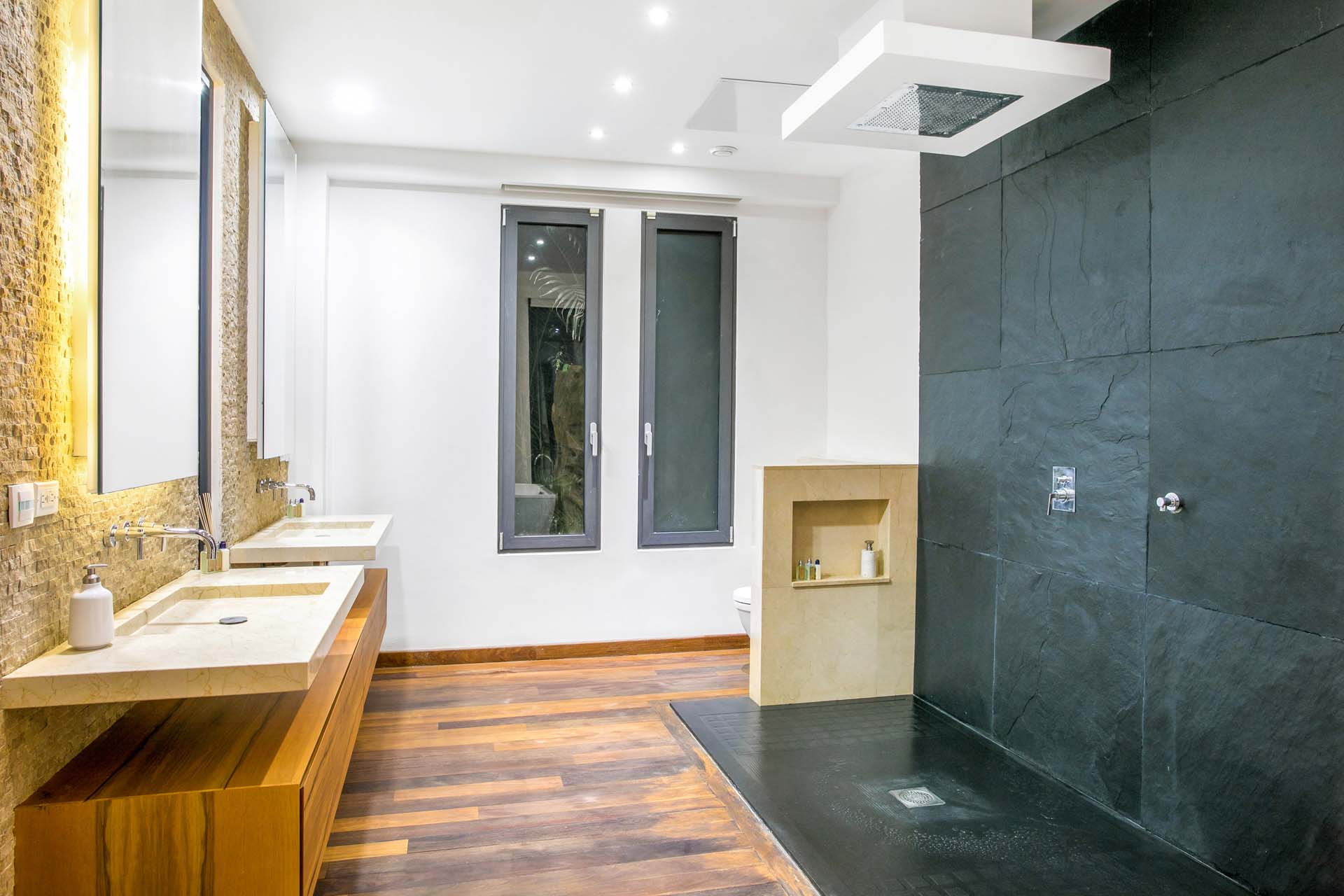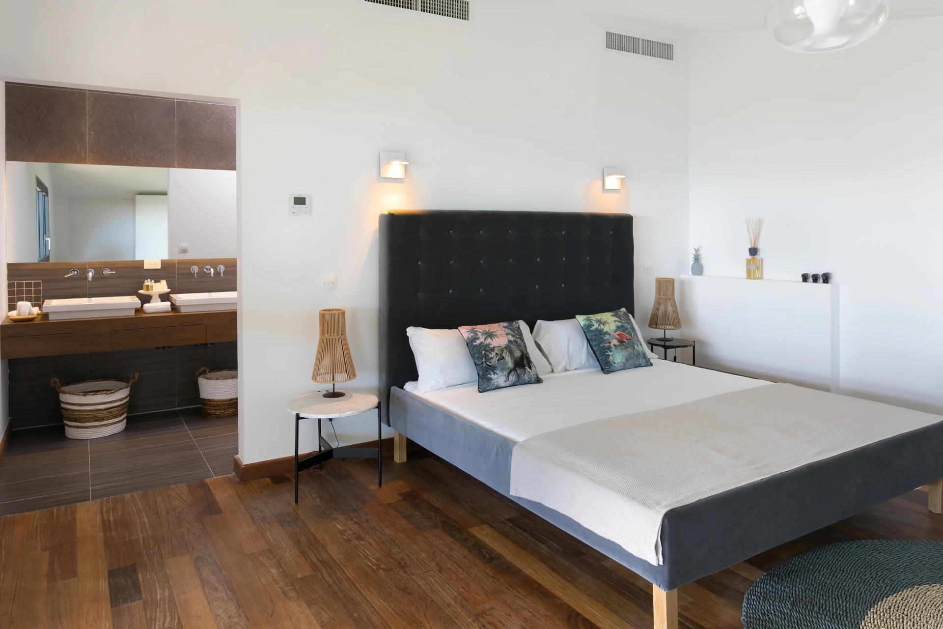 Each bedroom at Villa Emeraude has its own private bathroom with stylish, modern amenities, ensuring every guest enjoys privacy and comfort throughout their stay. The first three bedrooms are located on the main level, including the master suite, which opens directly onto the tropical garden, offering a refreshing and exotic start to each morning. One of the other two rooms features two large bunk beds, providing the ideal setup for children and close proximity to the master bedroom. The remaining two bedrooms are located upstairs. One of them features its own private terrace with a jacuzzi, creating a secluded space for relaxation. Each of these rooms has its own ensuite bathroom.