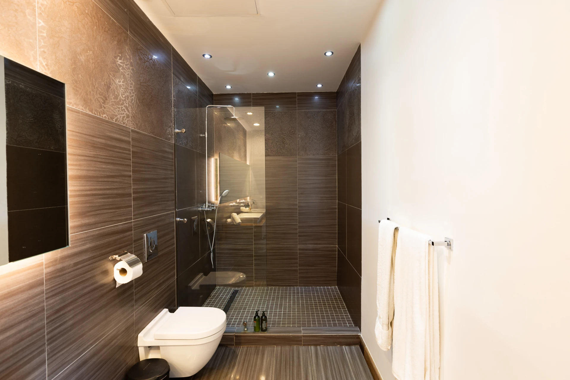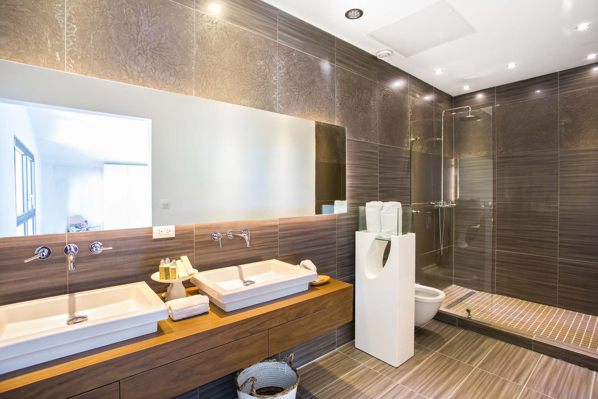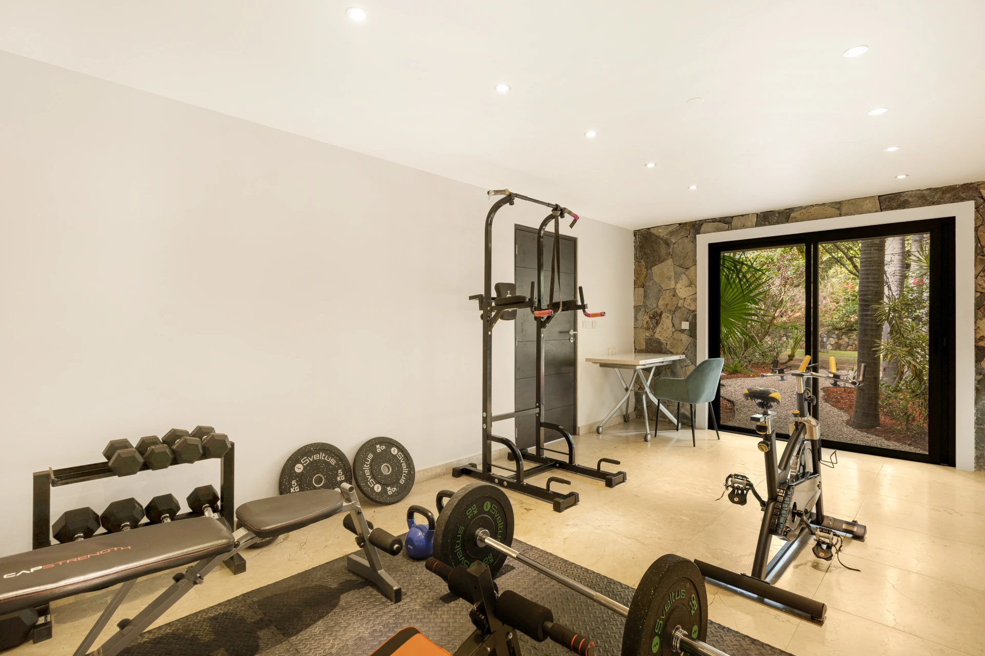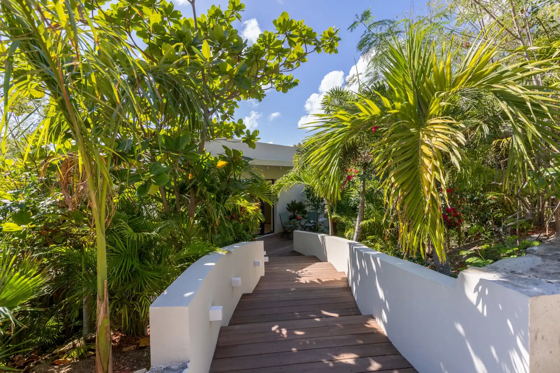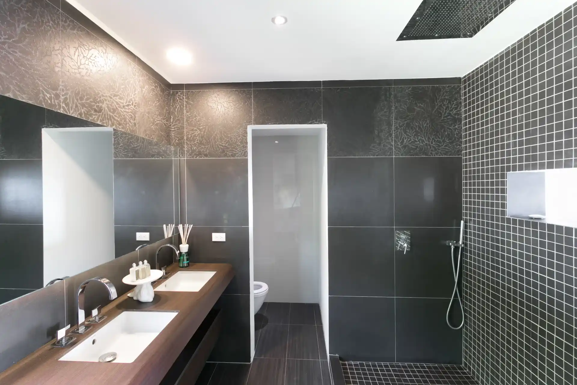 Each bedroom at Villa Emeraude has its own private bathroom with stylish, modern amenities, ensuring every guest enjoys privacy and comfort throughout their stay. The first three bedrooms are located on the main level, including the master suite, which opens directly onto the tropical garden, offering a refreshing and exotic start to each morning. One of the other two rooms features two large bunk beds, providing the ideal setup for children and close proximity to the master bedroom. The remaining two bedrooms are located upstairs. One of them features its own private terrace with a jacuzzi, creating a secluded space for relaxation. Each of these rooms has its own ensuite bathroom.