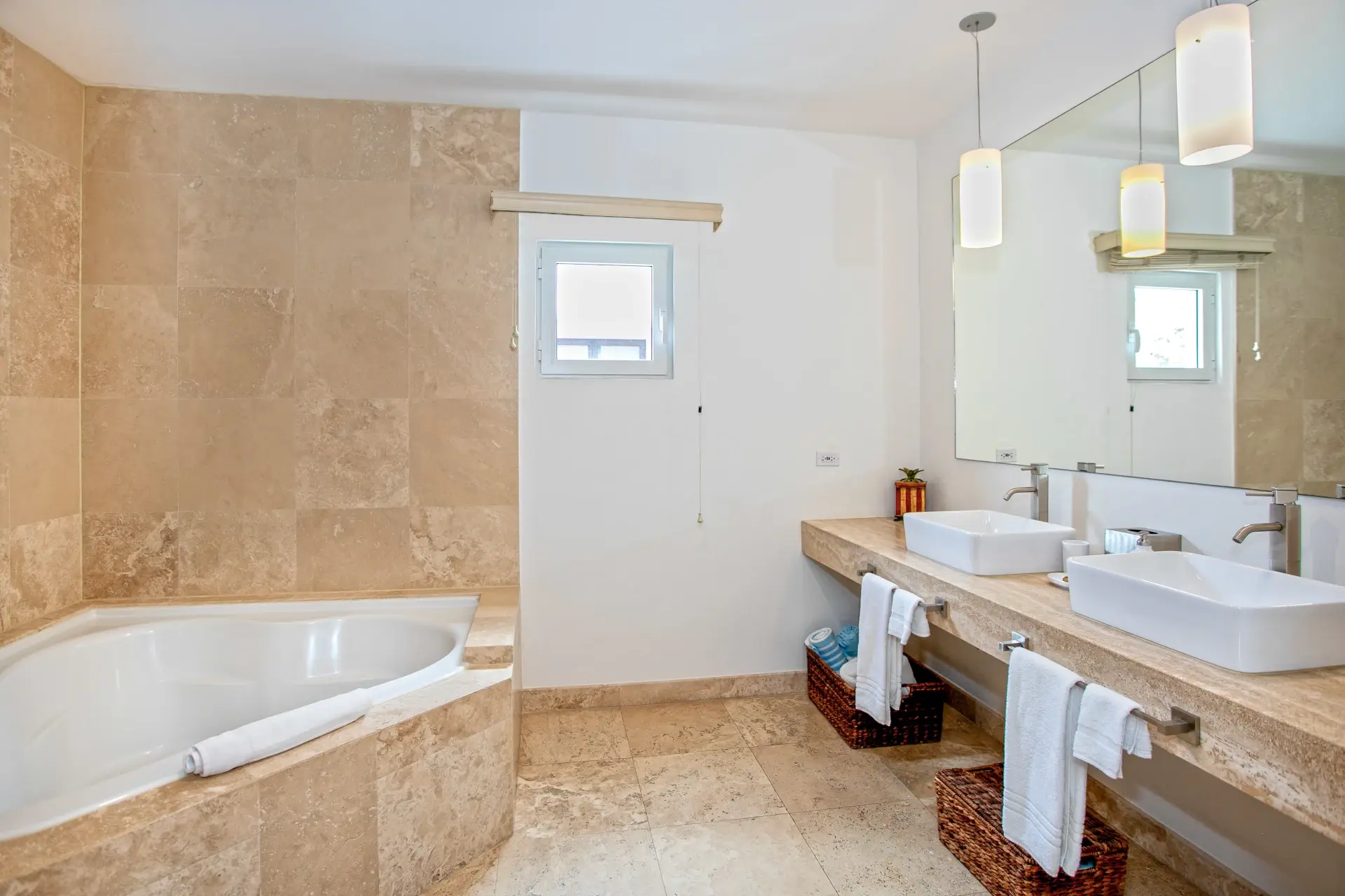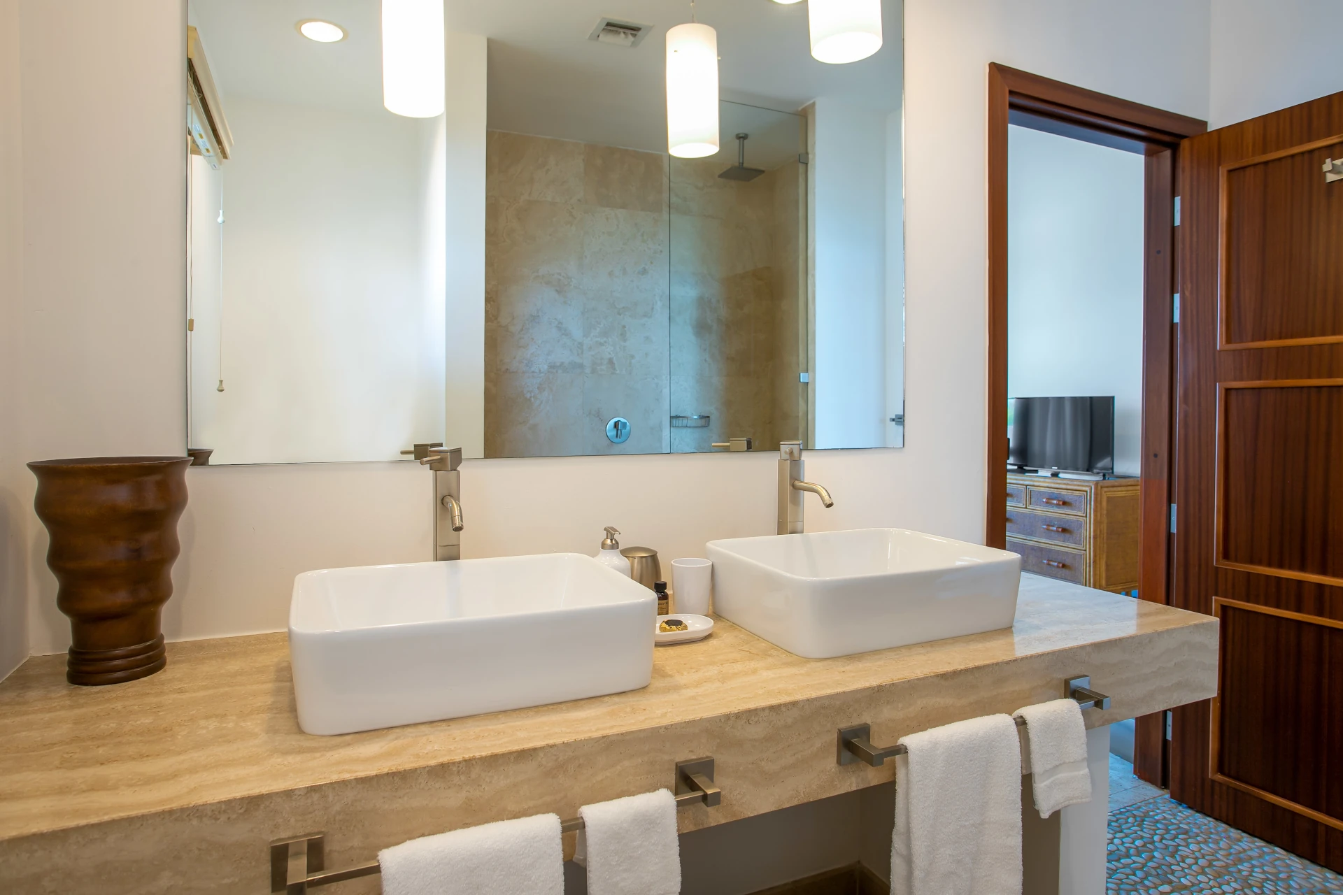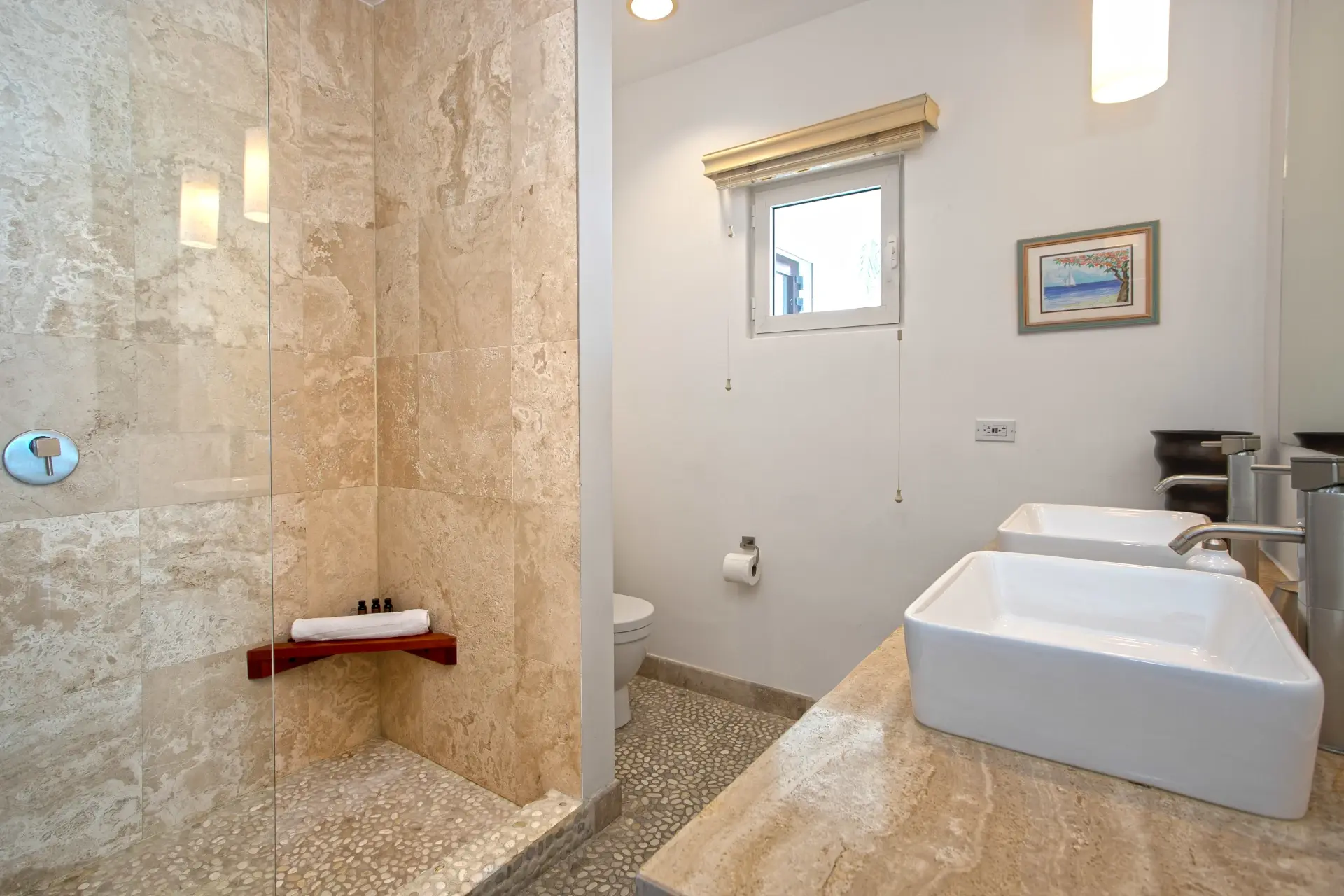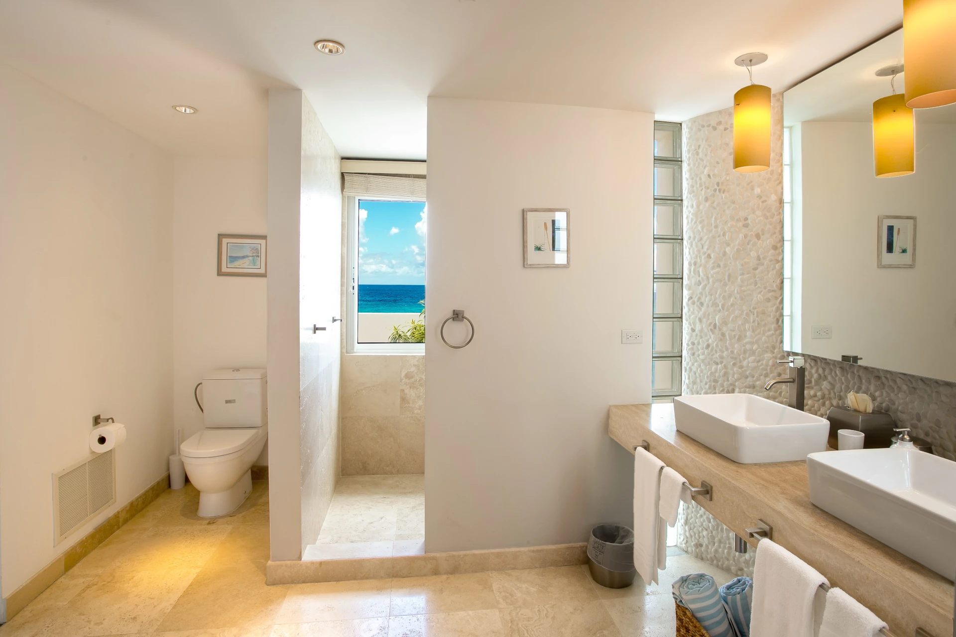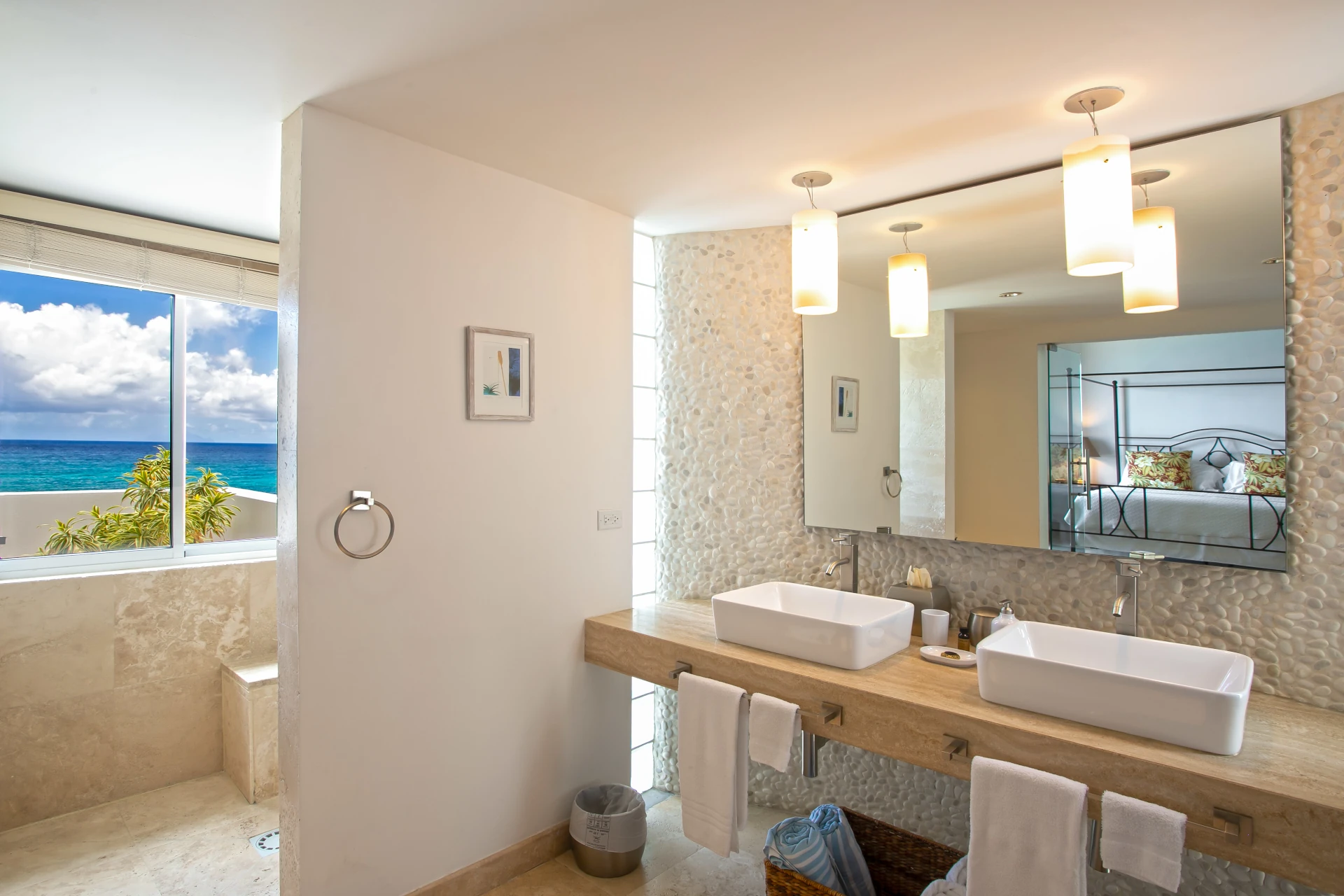 One large bedroom is located on the main level, while the other 3 bedrooms (including the master bedroom) are located on the upper floor. Each bedroom has a king-size bed, private balcony with sea view, TV with dish network, and large modern ensuite bathroom.