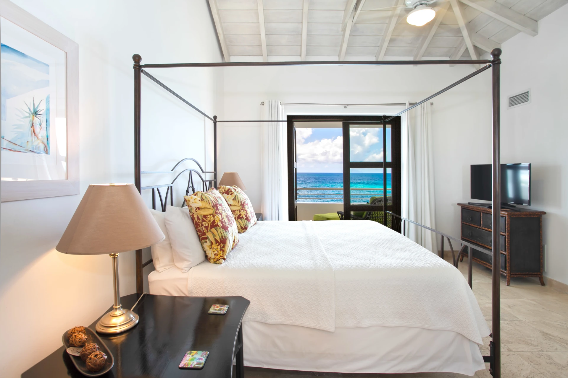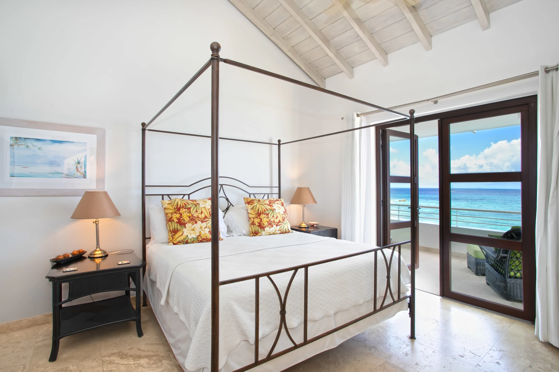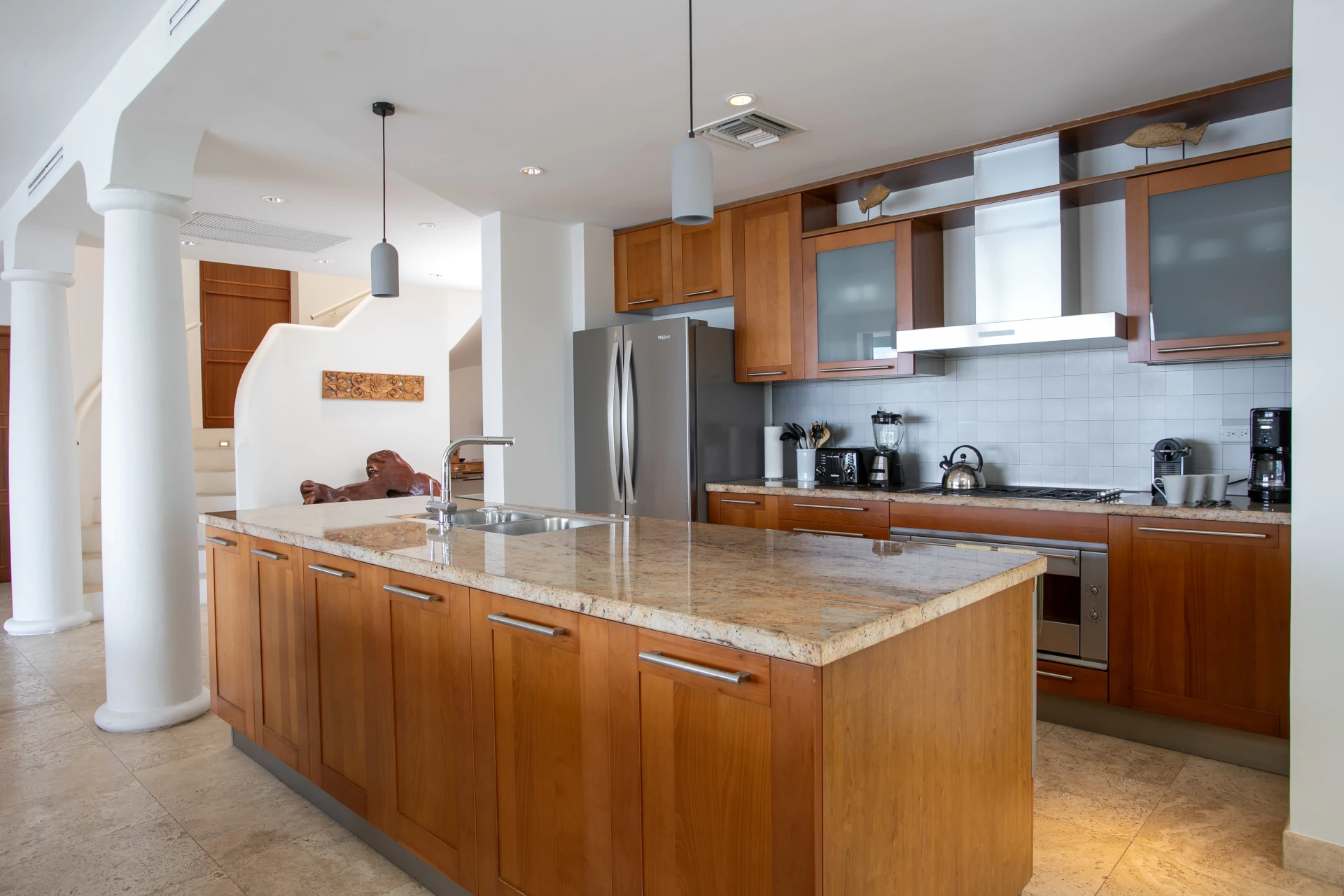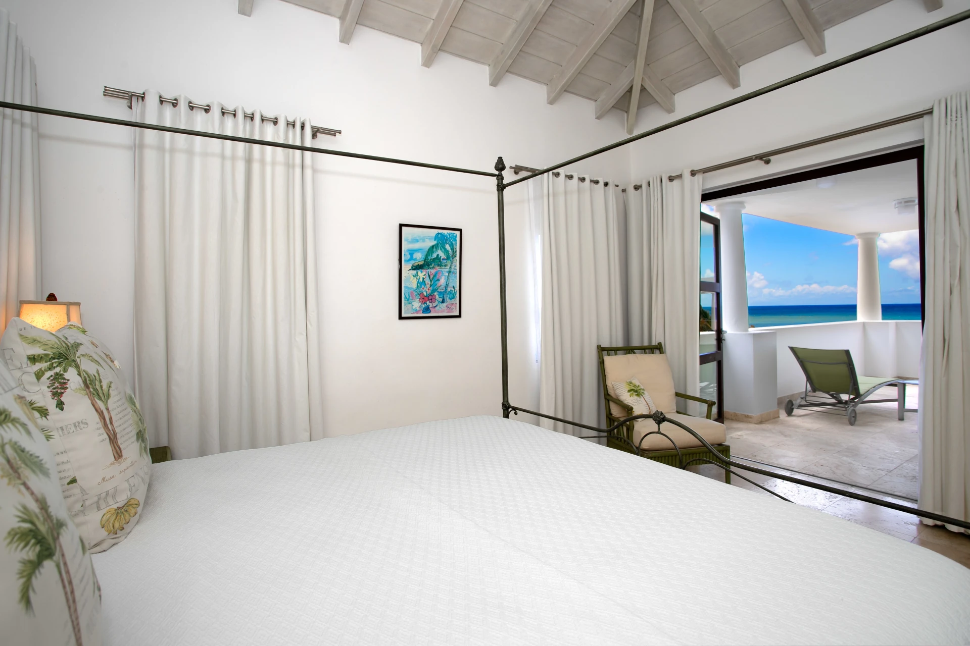 One large bedroom is located on the main level, while the other 3 bedrooms (including the master bedroom) are located on the upper floor. Each bedroom has a king-size bed, private balcony with sea view, TV with dish network, and large modern ensuite bathroom.