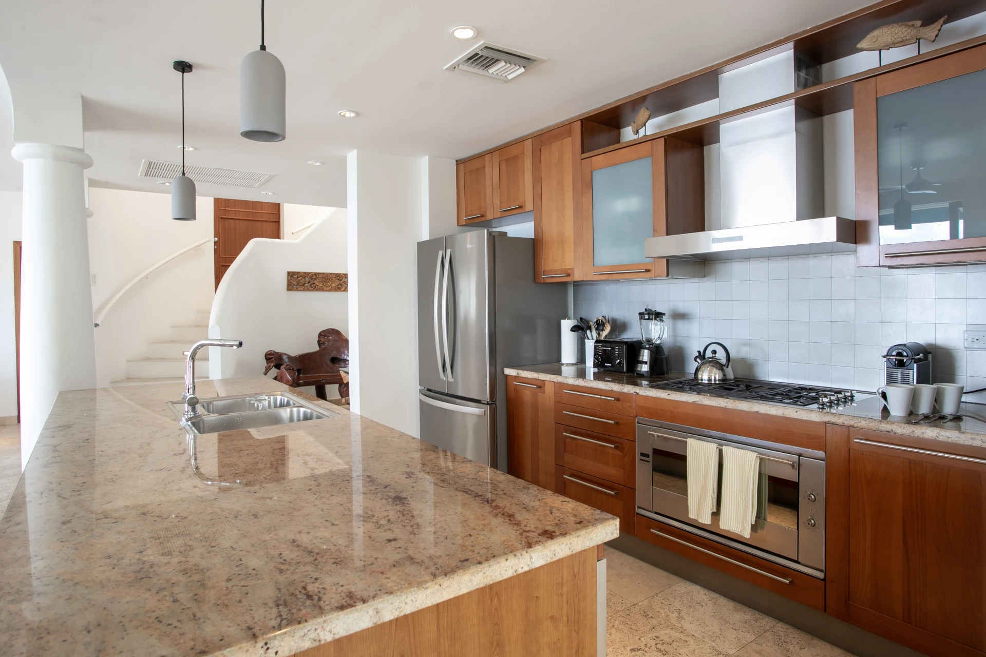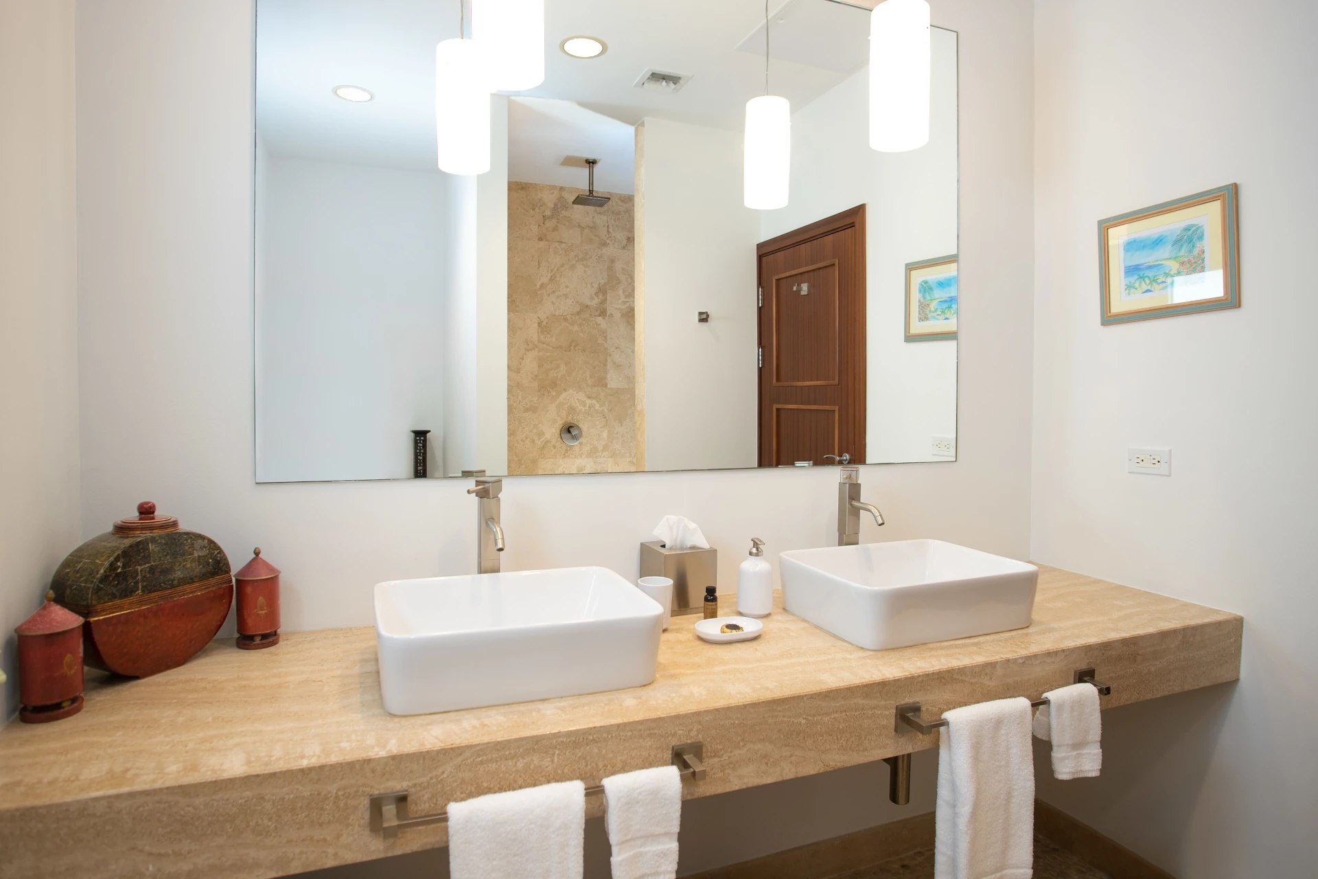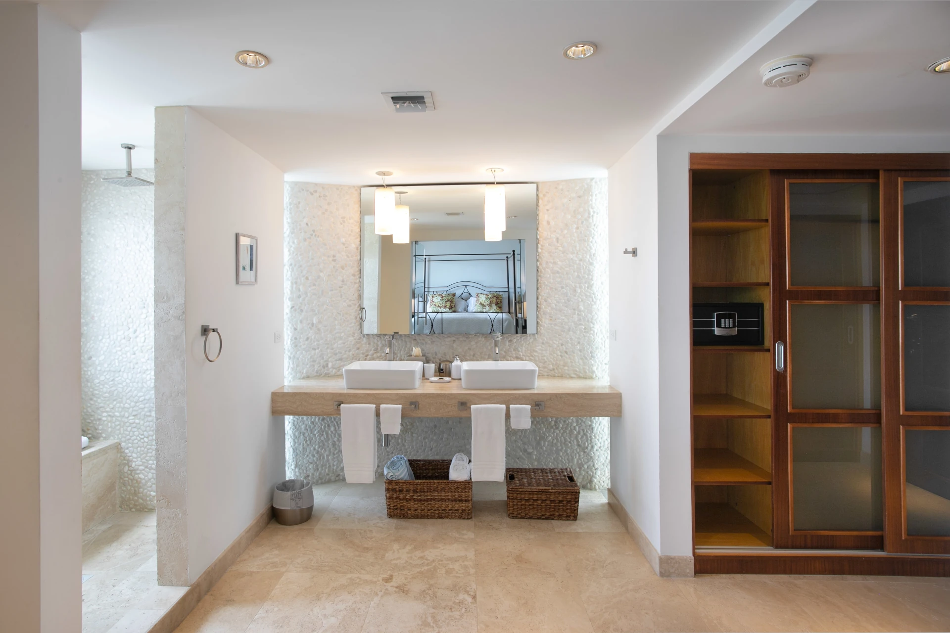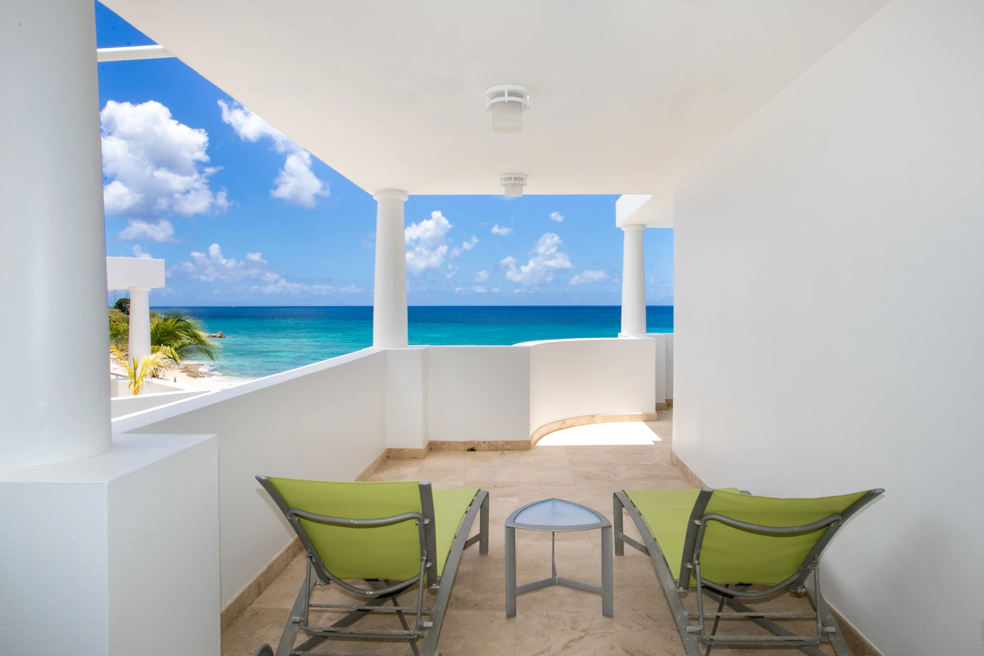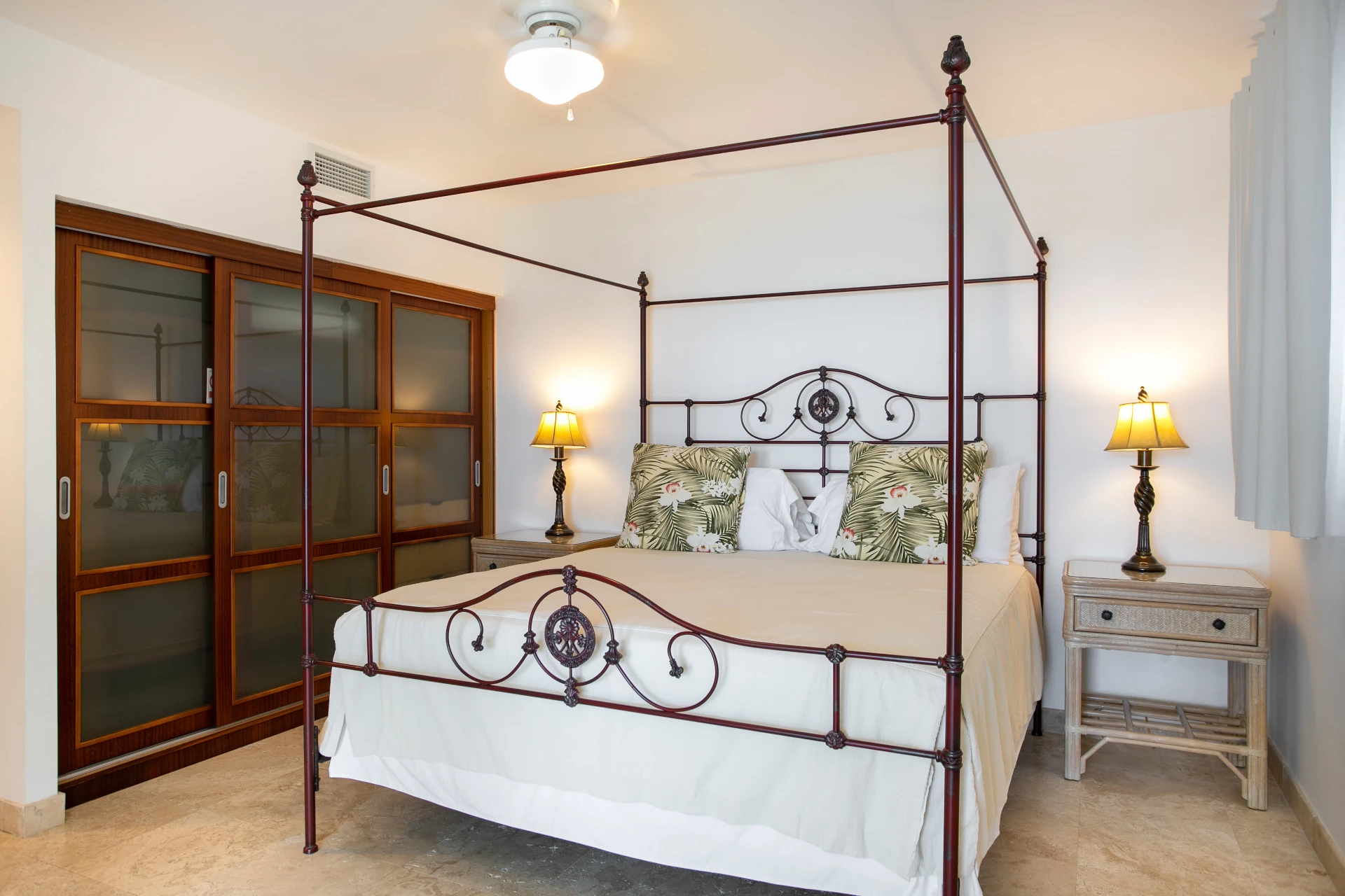 One large bedroom is located on the main level, while the other 3 bedrooms (including the master bedroom) are located on the upper floor. Each bedroom has a king-size bed, private balcony with sea view, TV with dish network, and large modern ensuite bathroom.