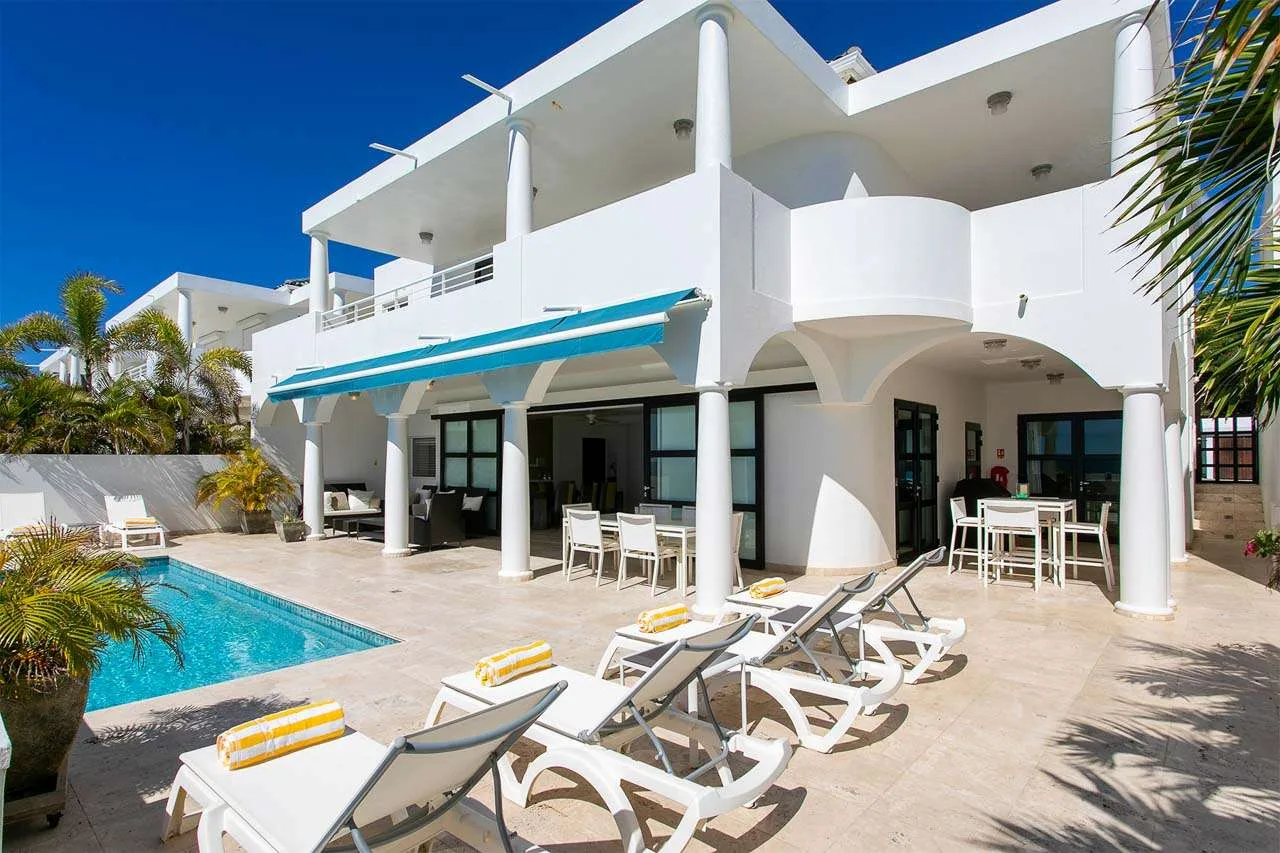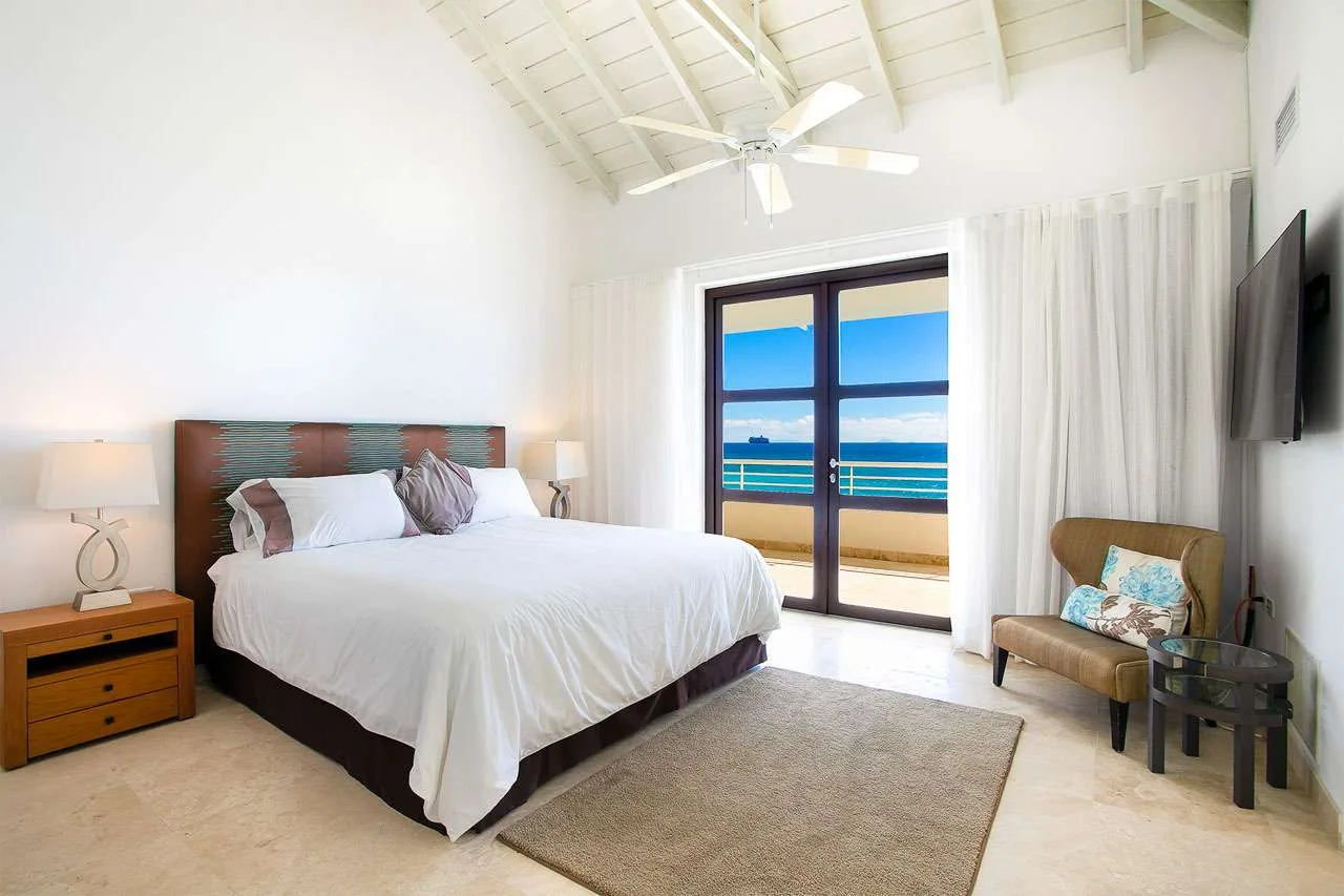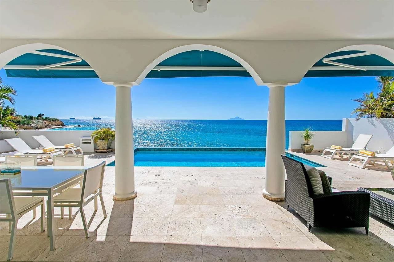 The contemporary interiors flow through stunning glass and wood sliding doors right onto a spacious covered travertine terrace and deck. The wraparound space is perfect for outdoor dining and lounging. Graceful arches and columns draw your eye to the deep blue pool that seems to flow straight to the sea. You share a private entrance to Cupecoy Beach. An awning lowers to provide shade from the late afternoon sun.