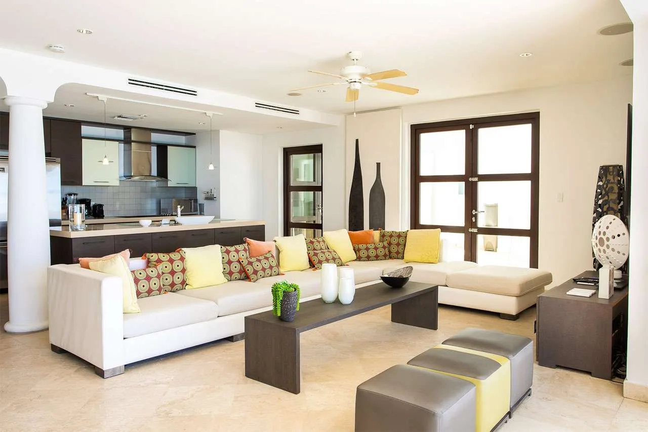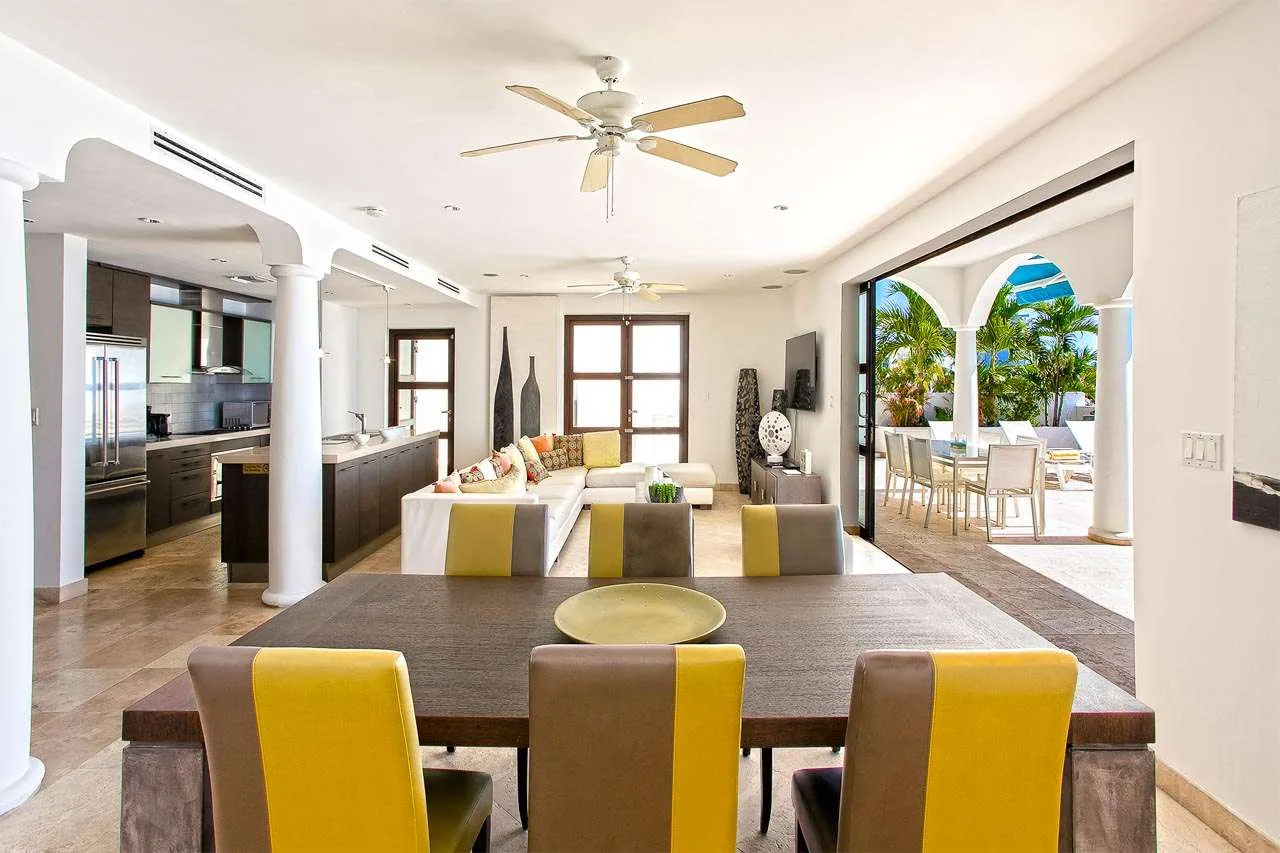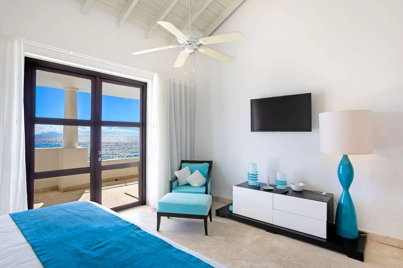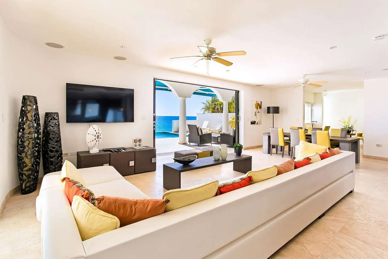 The contemporary interiors flow through stunning glass and wood sliding doors right onto a spacious covered travertine terrace and deck. The wraparound space is perfect for outdoor dining and lounging. Graceful arches and columns draw your eye to the deep blue pool that seems to flow straight to the sea. You share a private entrance to Cupecoy Beach. An awning lowers to provide shade from the late afternoon sun.