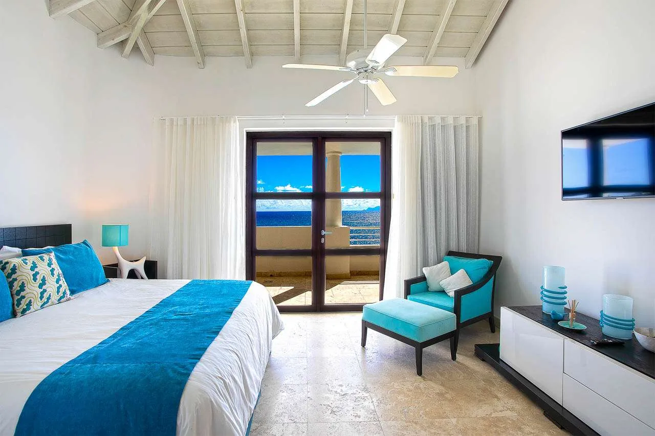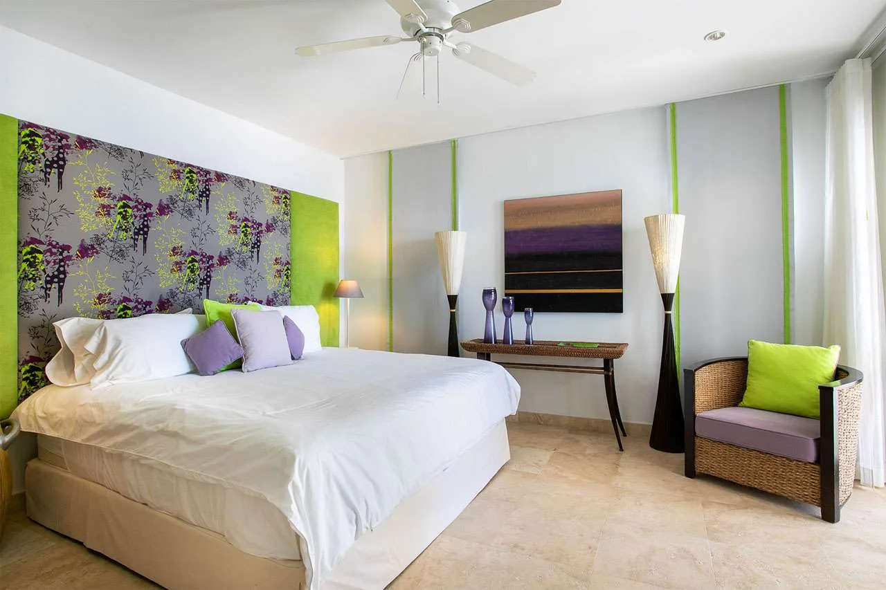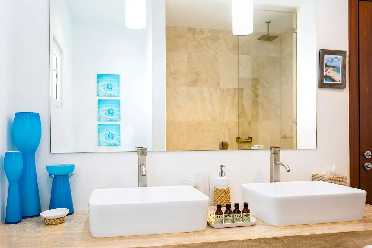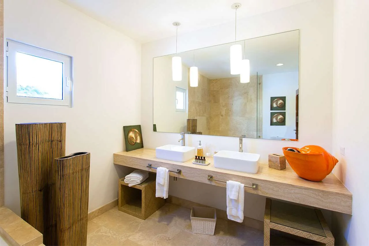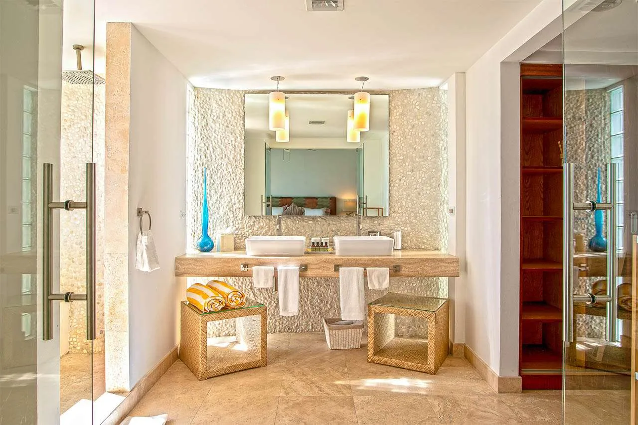 The four equal size bedrooms have king size beds, sea views, private outdoor seating areas and beautiful ensuite bathrooms. One bedroom is on the main level while the 3 others are up a curved staircase. Each room has a distinctive color theme mixing lime, grey, teal, brown, mango and cream. Interesting objects d’art are scattered through the villa. The spa style bathrooms have walk in showers; one has a soaking tub. The décor combines woods, glass, travertine tiles and river stones with sleek brushed chrome fixtures.