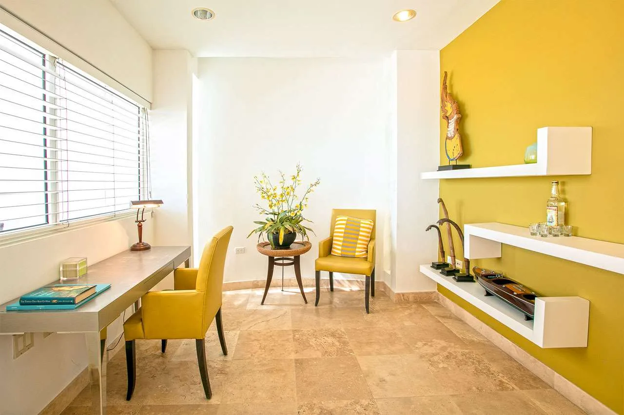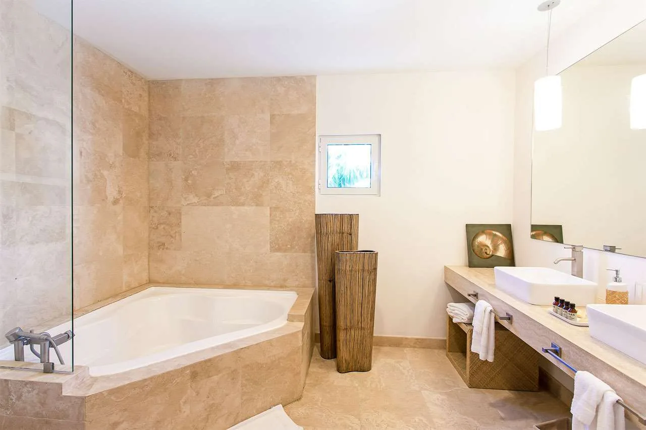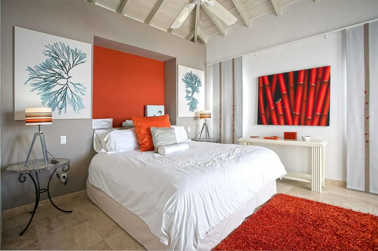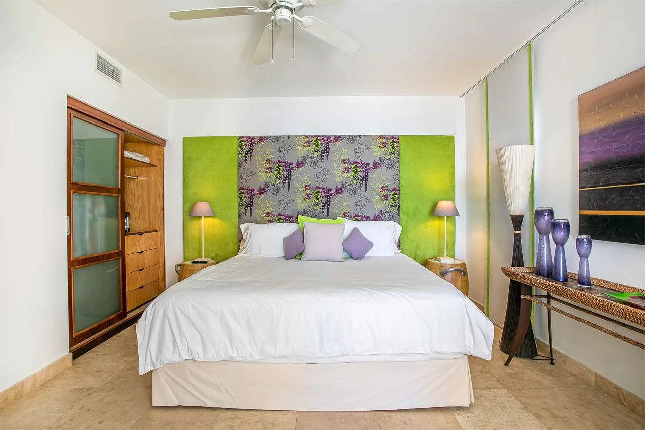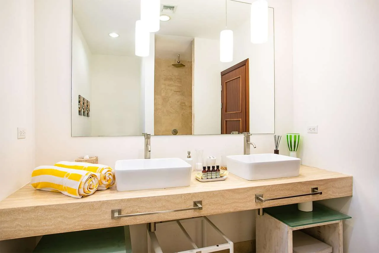 The four equal size bedrooms have king size beds, sea views, private outdoor seating areas and beautiful ensuite bathrooms. One bedroom is on the main level while the 3 others are up a curved staircase. Each room has a distinctive color theme mixing lime, grey, teal, brown, mango and cream. Interesting objects d’art are scattered through the villa. The spa style bathrooms have walk in showers; one has a soaking tub. The décor combines woods, glass, travertine tiles and river stones with sleek brushed chrome fixtures.