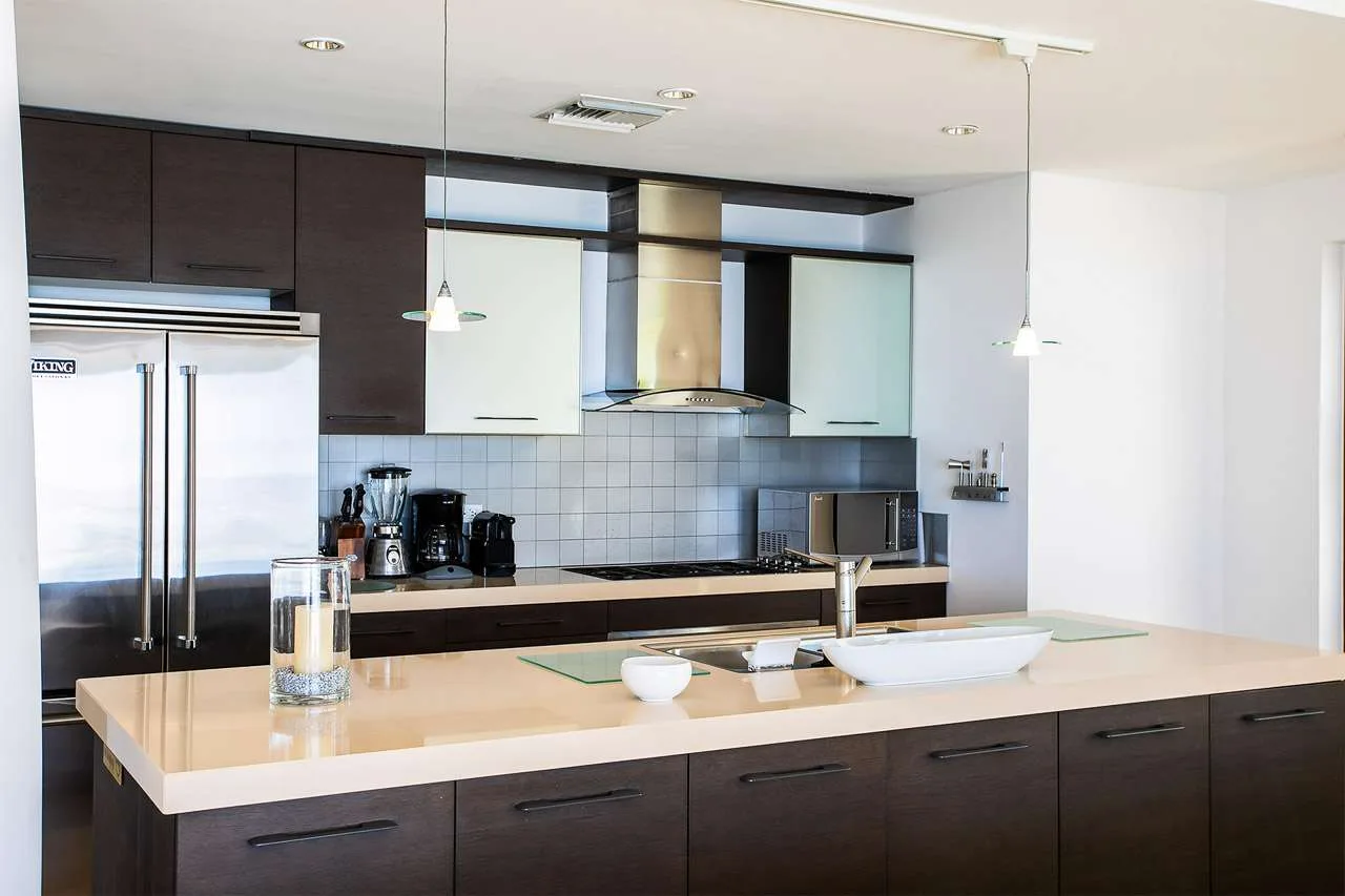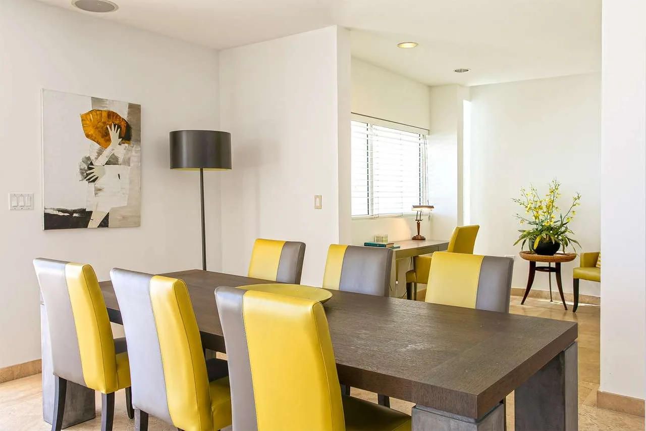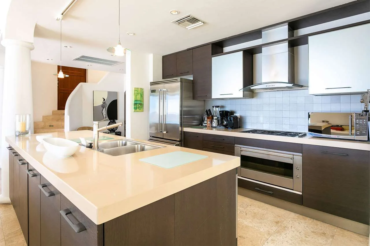 The interior has a contemporary French vibe; elegant, interesting and comfortable. Dark woods blend with cream, taupe, grey and lime fabrics and leather. The open plan living area features a high-end kitchen with luxury stainless steel appliances. The large main living area combines lounging, dining and media spaces with a spacious office nook. A powder room is conveniently located on the first floor.