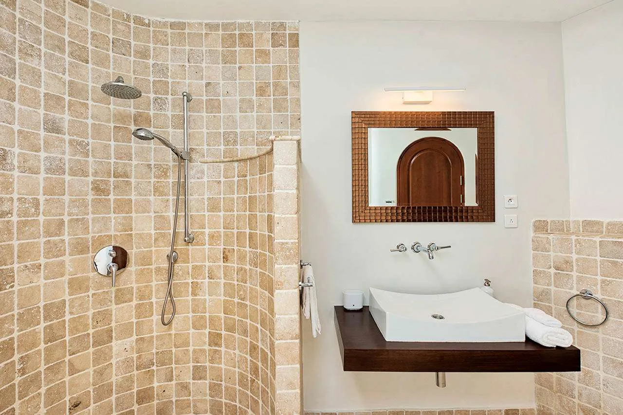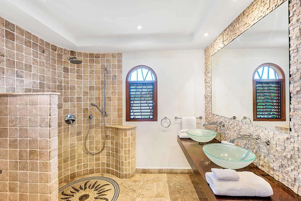 Each spacious bedroom has ocean views through large French windows, which open out to the pool terrace. Each bedroom also has a king-size bed, ceiling fan, and ensuite bathroom with shower.