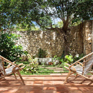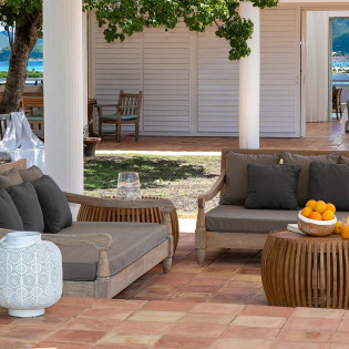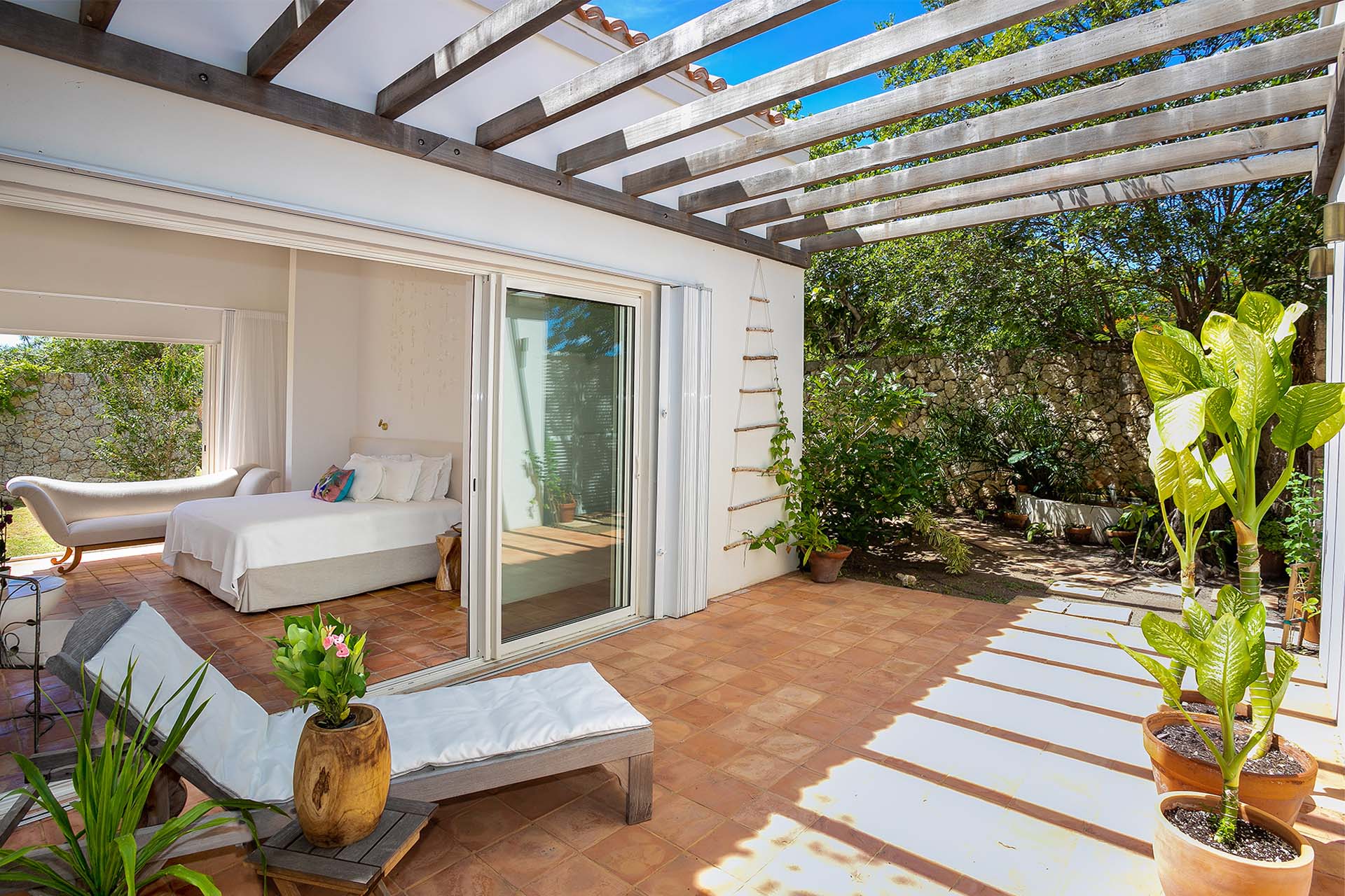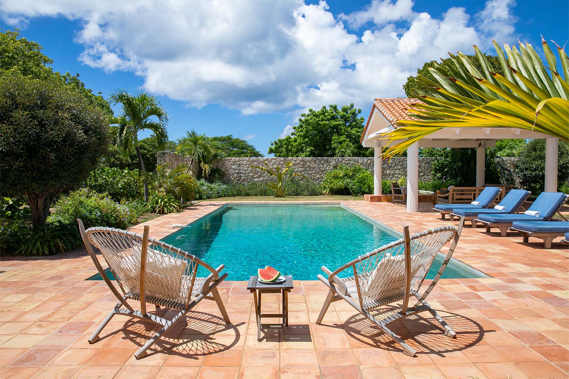 Architectural lines and natural stone walls throughout the property create captivating perspectives, guiding the eye to breathtaking vistas. A veranda frames the blue water view, while a serene walled garden encloses a deep pool and sunlit terrace. The home is naturally cooled by trade winds, complemented by adjustable louvers and glass doors that can be closed during windy weather.