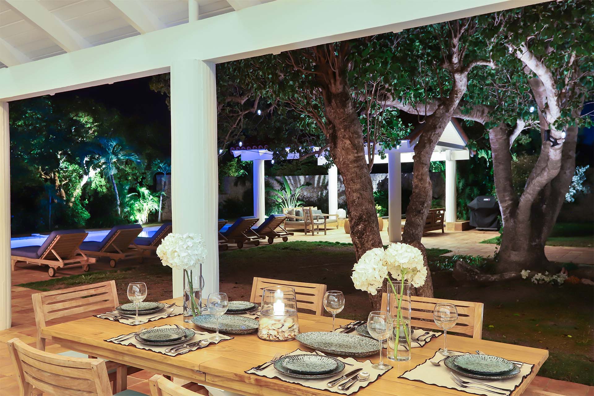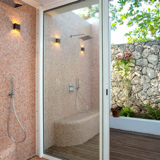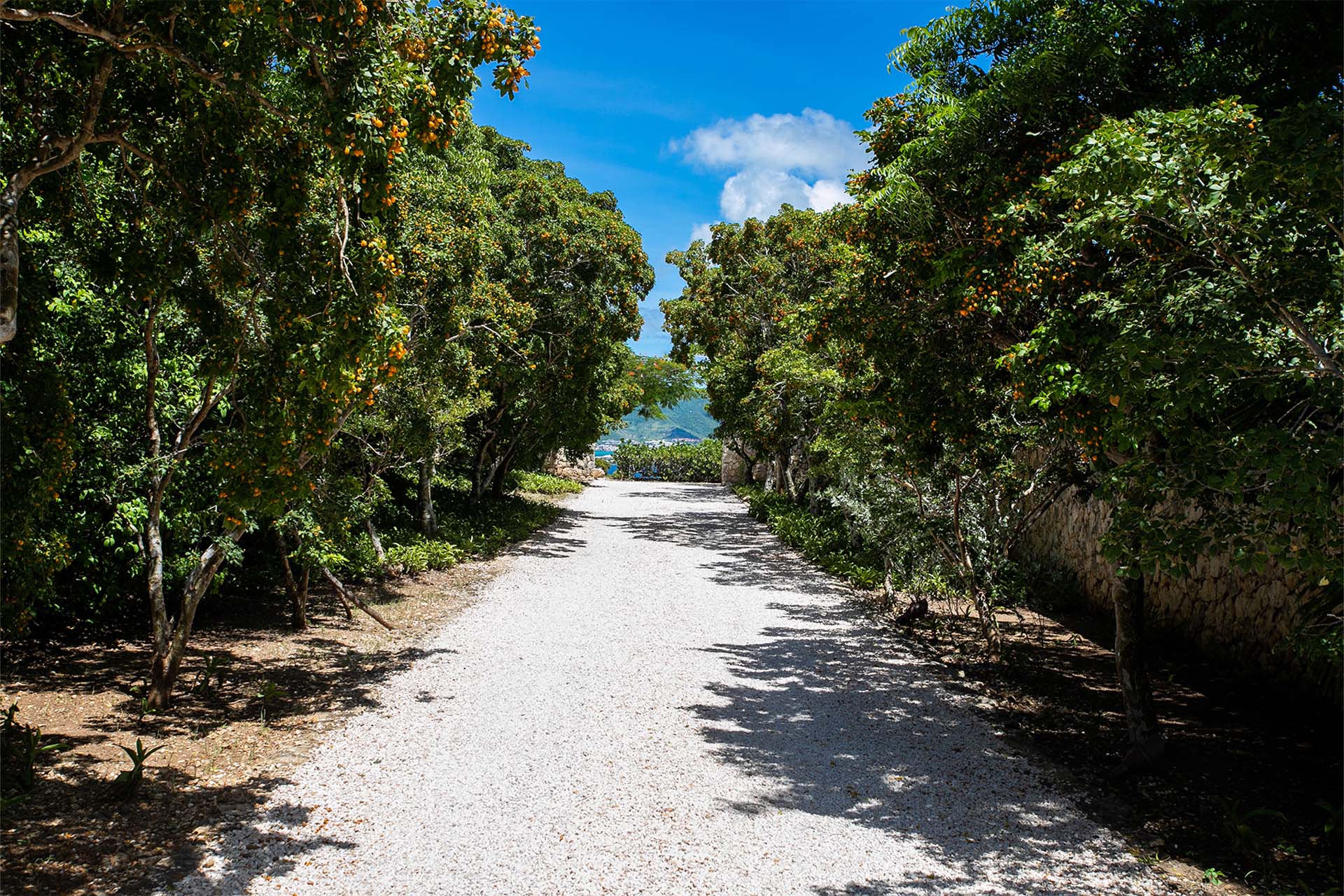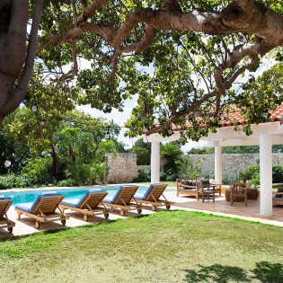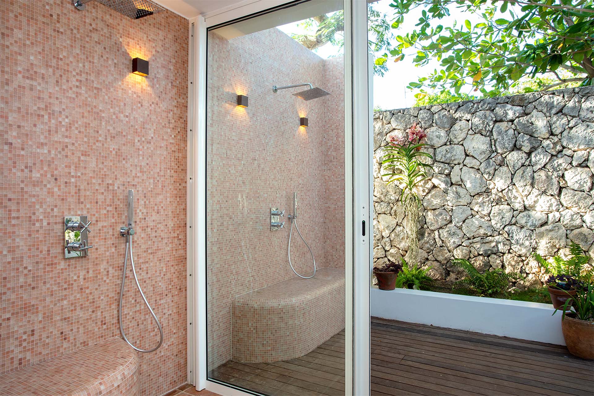 Architectural lines and natural stone walls throughout the property create captivating perspectives, guiding the eye to breathtaking vistas. A veranda frames the blue water view, while a serene walled garden encloses a deep pool and sunlit terrace. The home is naturally cooled by trade winds, complemented by adjustable louvers and glass doors that can be closed during windy weather.