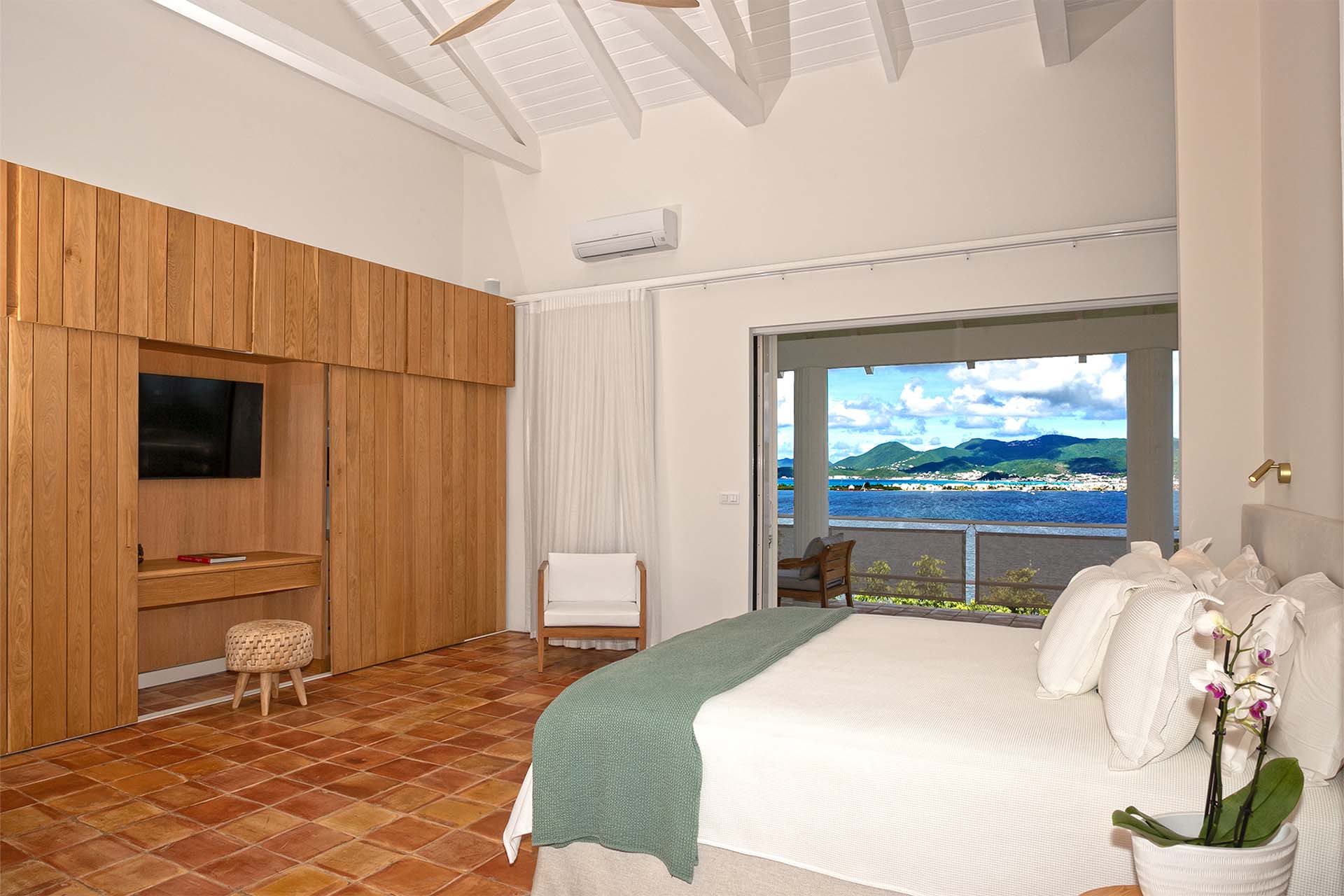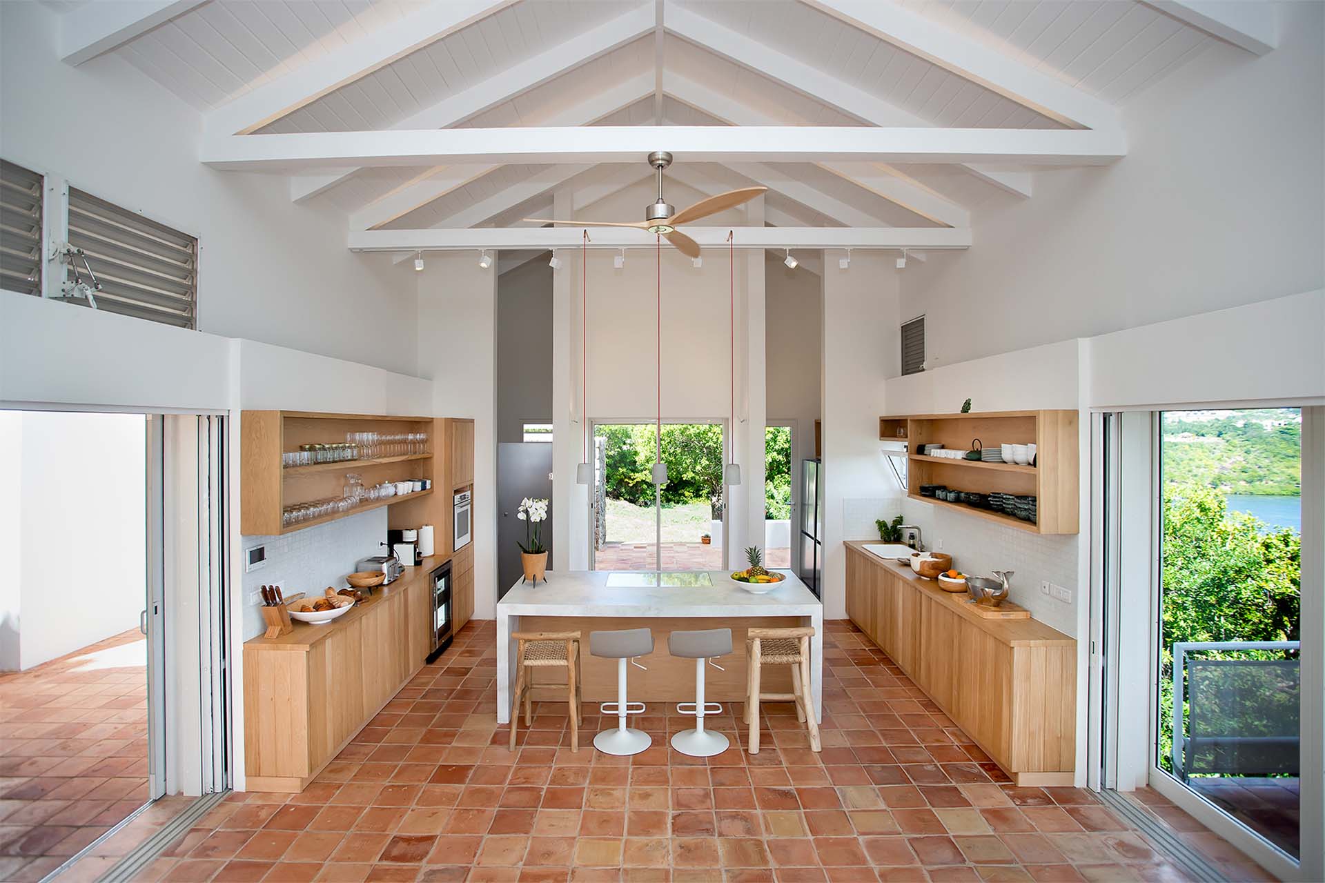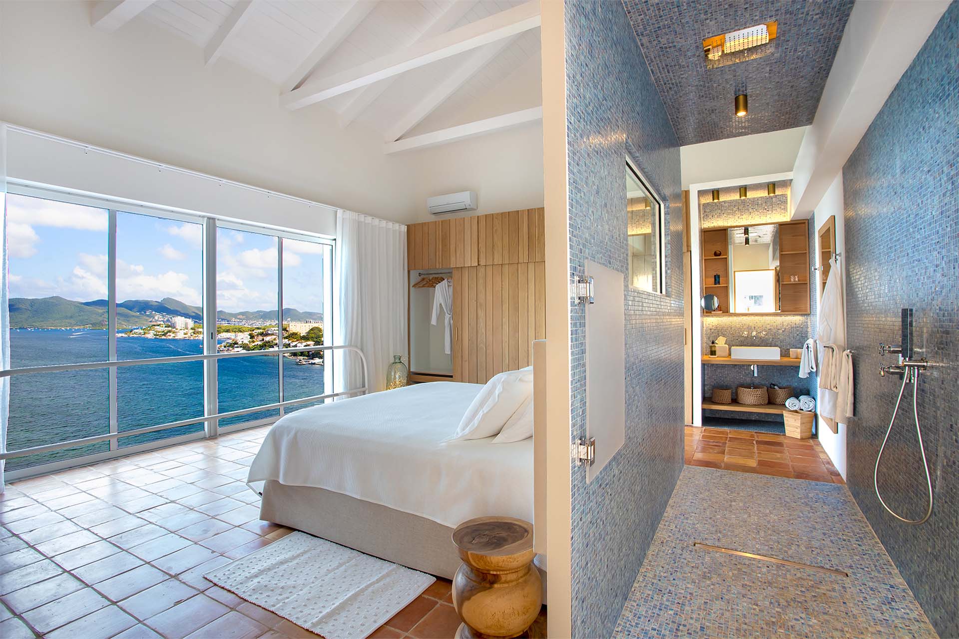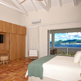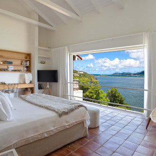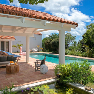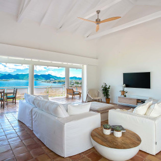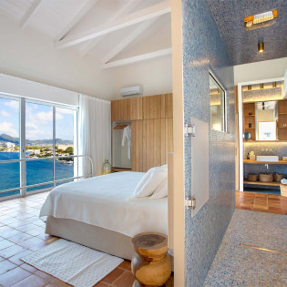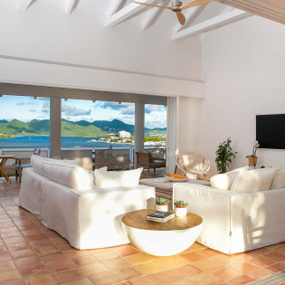 Situated on the border between French and Dutch St. Martin in Terres Basses, it rests high on a hillside, offering panoramic water views of Simpson Bay Lagoon. Immersed in nature, the house seamlessly blends with lush surroundings, its white walls harmonizing with abundant vegetation, and terracotta accents contrasting the water and sky.