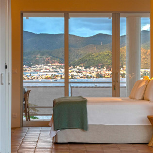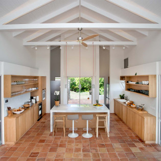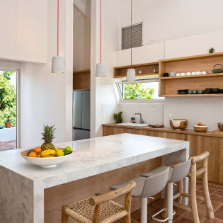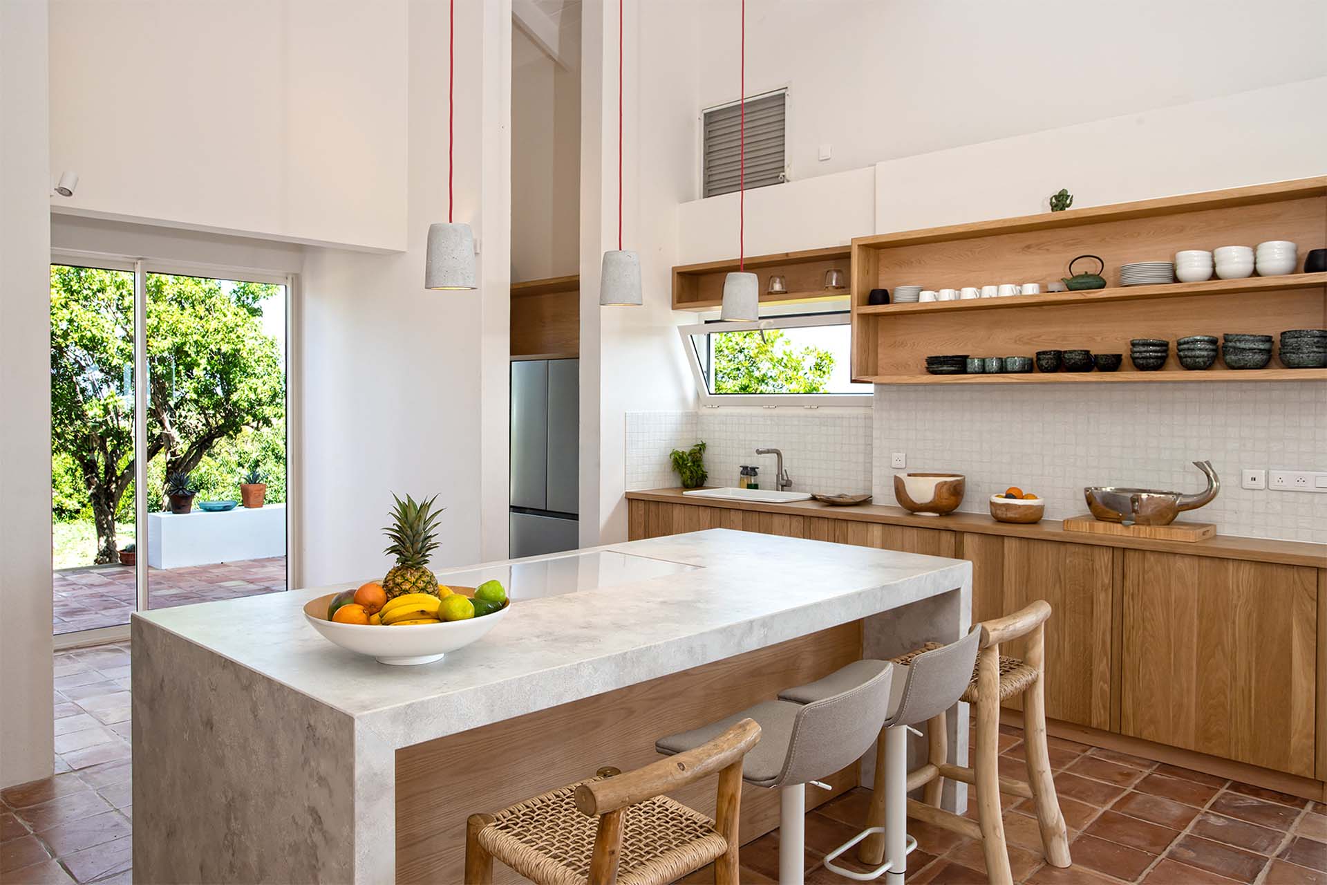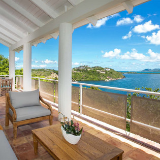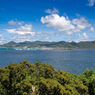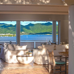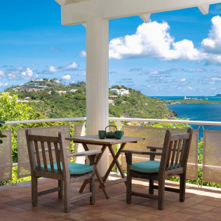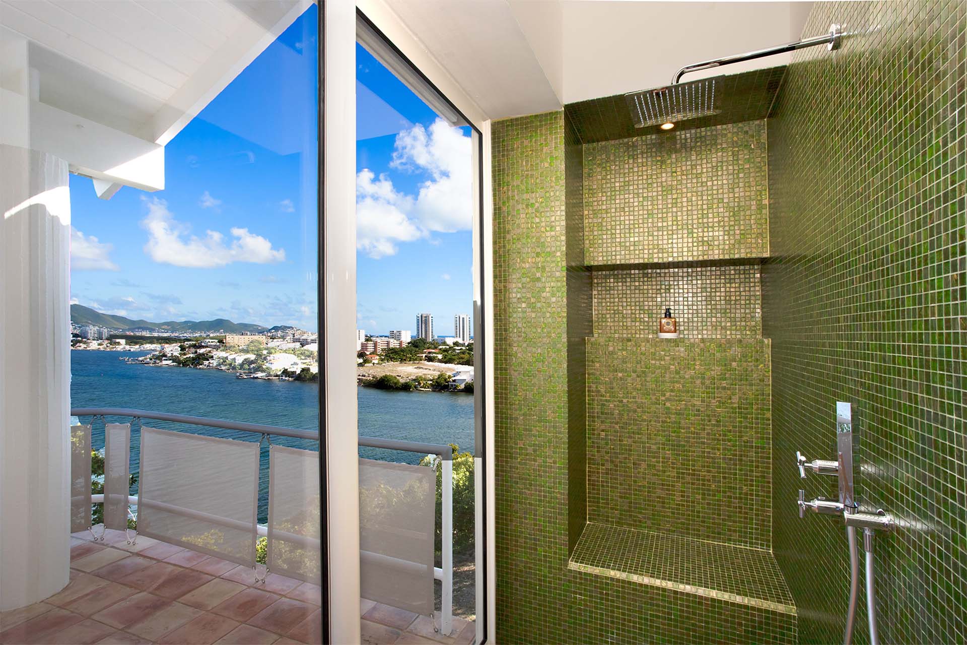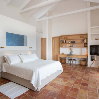 Situated on the border between French and Dutch St. Martin in Terres Basses, it rests high on a hillside, offering panoramic water views of Simpson Bay Lagoon. Immersed in nature, the house seamlessly blends with lush surroundings, its white walls harmonizing with abundant vegetation, and terracotta accents contrasting the water and sky.