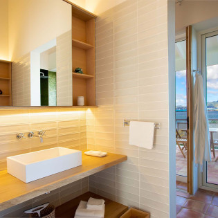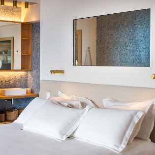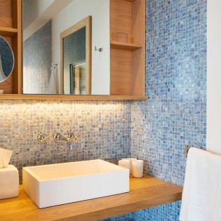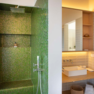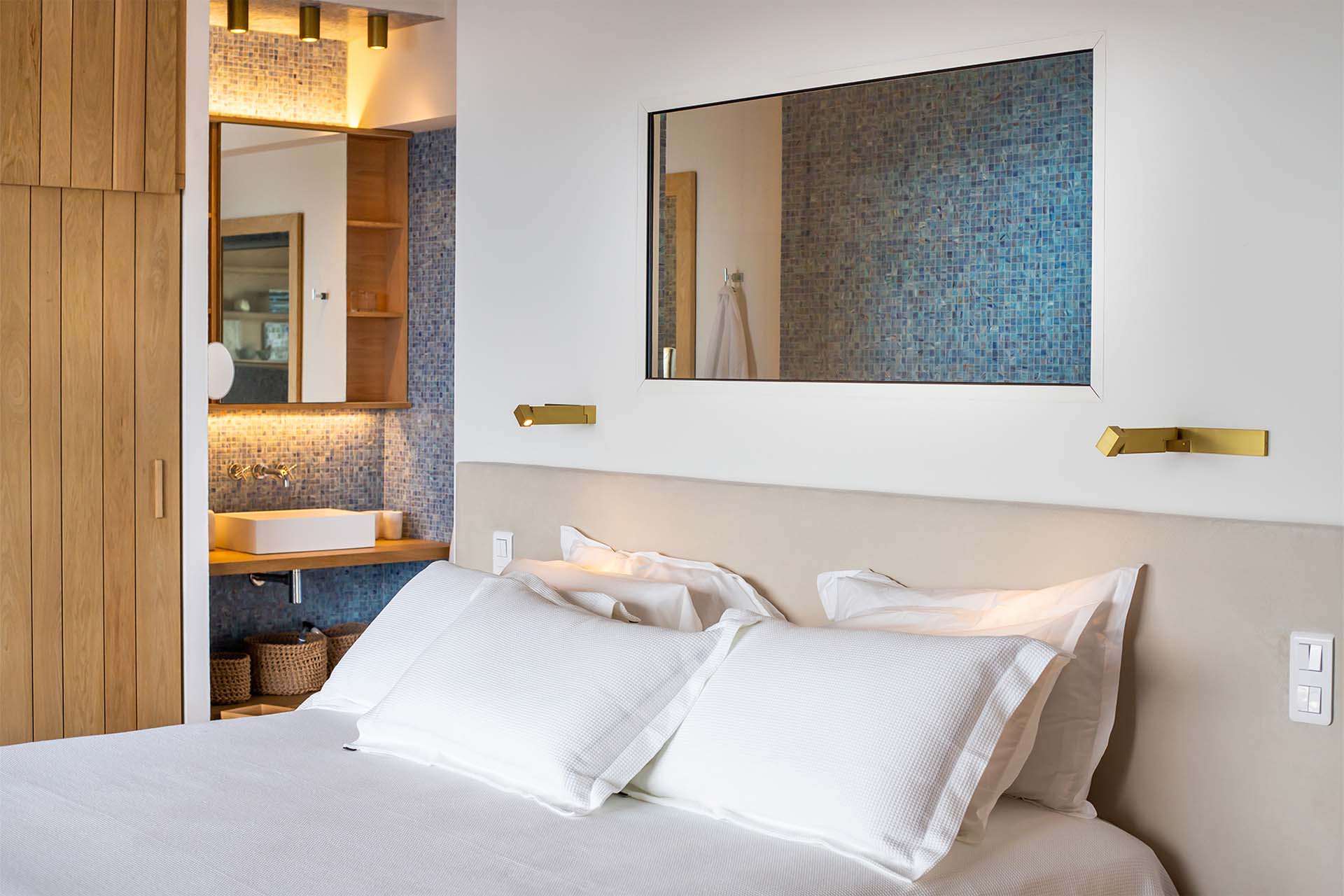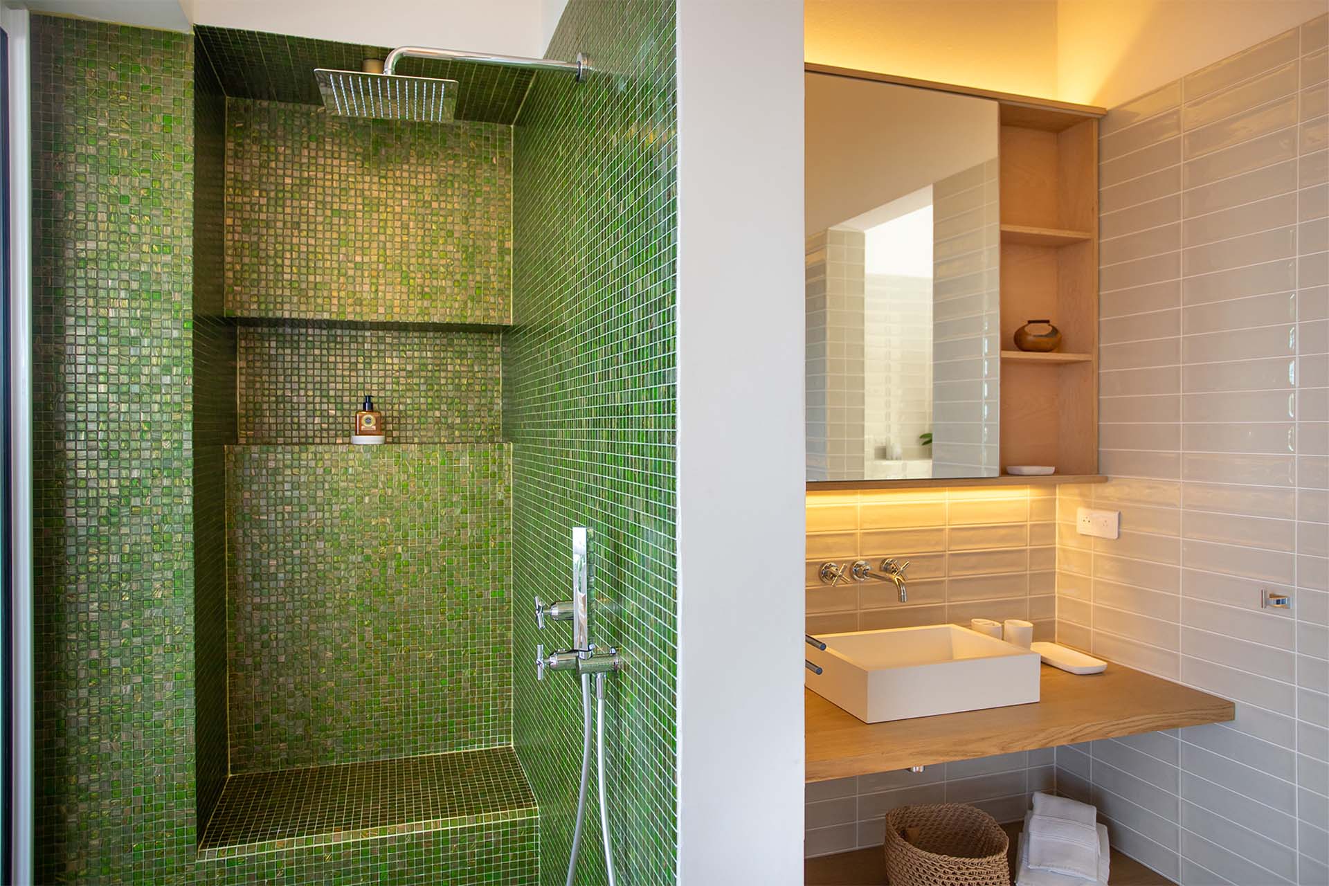 Inside, the luminous interior boasts a high ceiling and expansive glass doors, flooding the room with the 180-degree water view. A TV area and bespoke light oak kitchen, equipped with modern appliances, create a convivial atmosphere. Three bedrooms complete the space: two with water views and vibrant mosaic-tiled bathrooms, and a third accessed from a garden oasis with its own ensuite bathroom.
