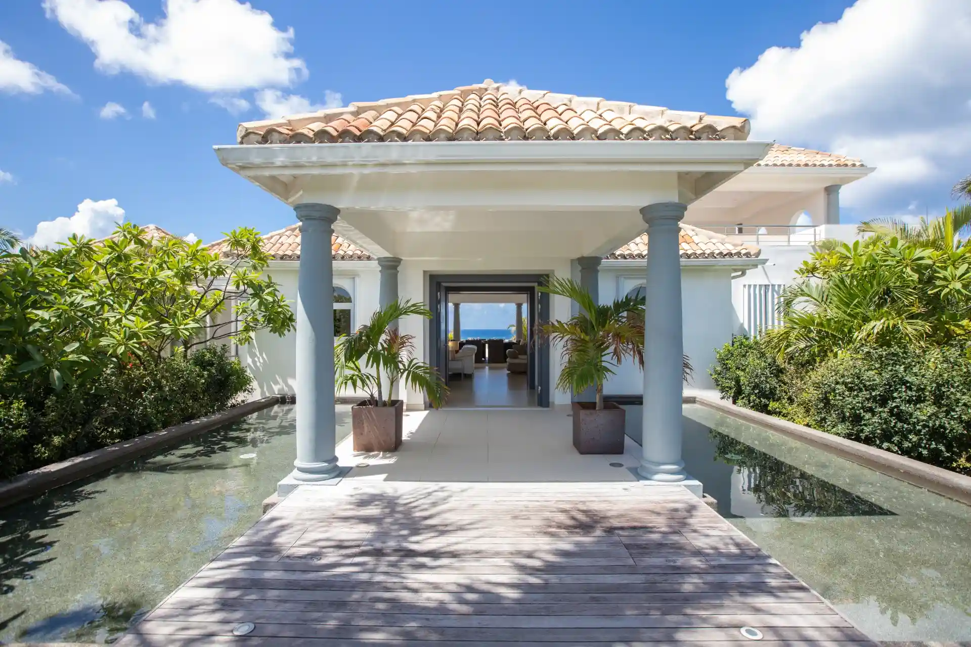 Large silver gates lead to a winding driveway and the main entrance, where 2 water features flank a walkway bridge. Double doors open to the living room, which enjoys a view of the pool and sea. Contemporary furniture and pop art adorn the rooms.