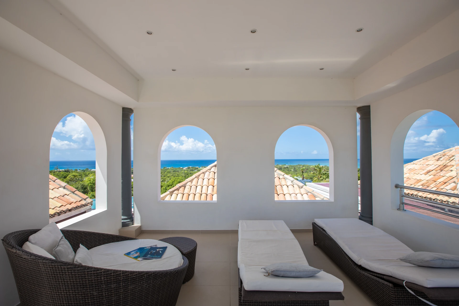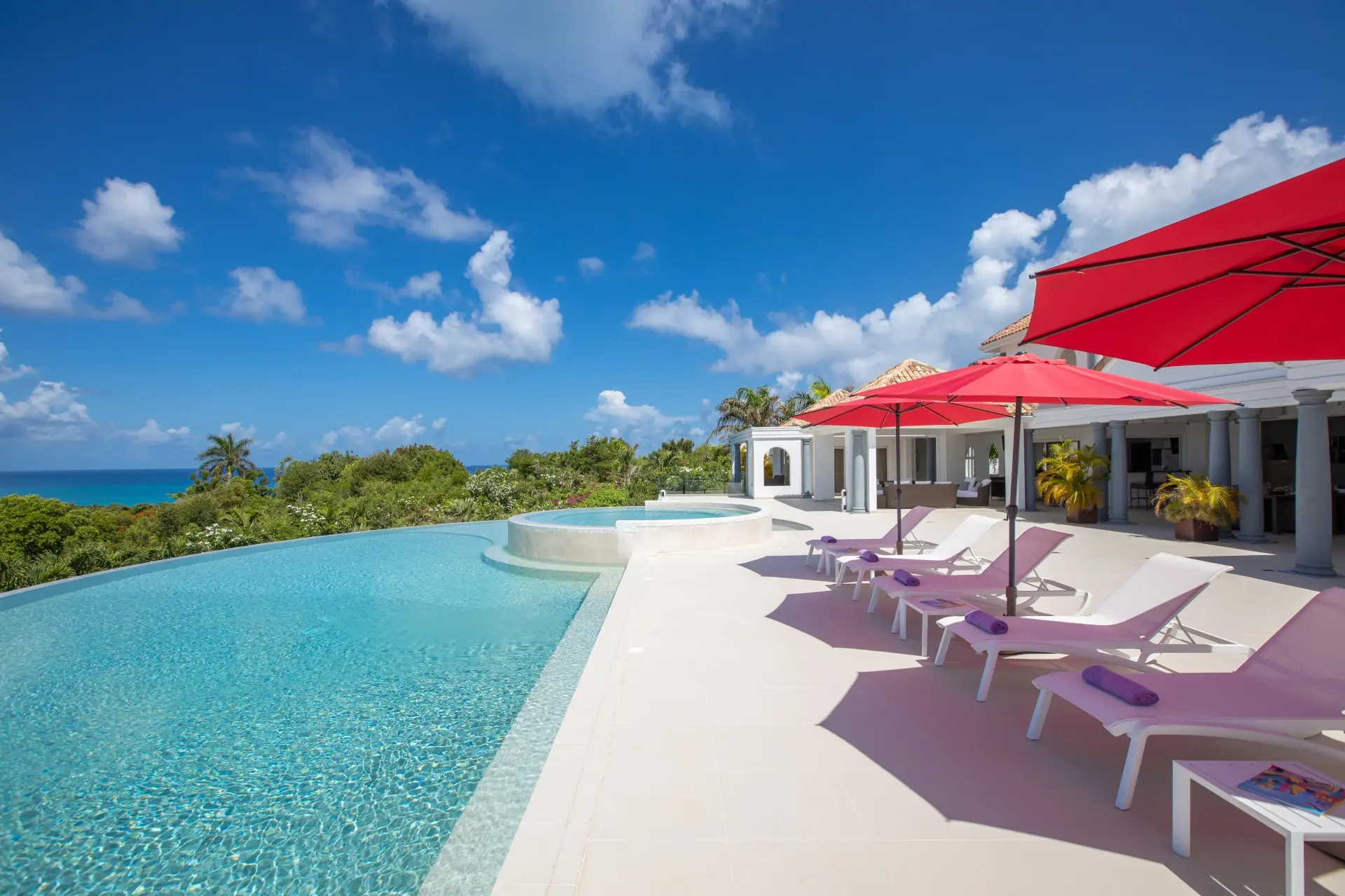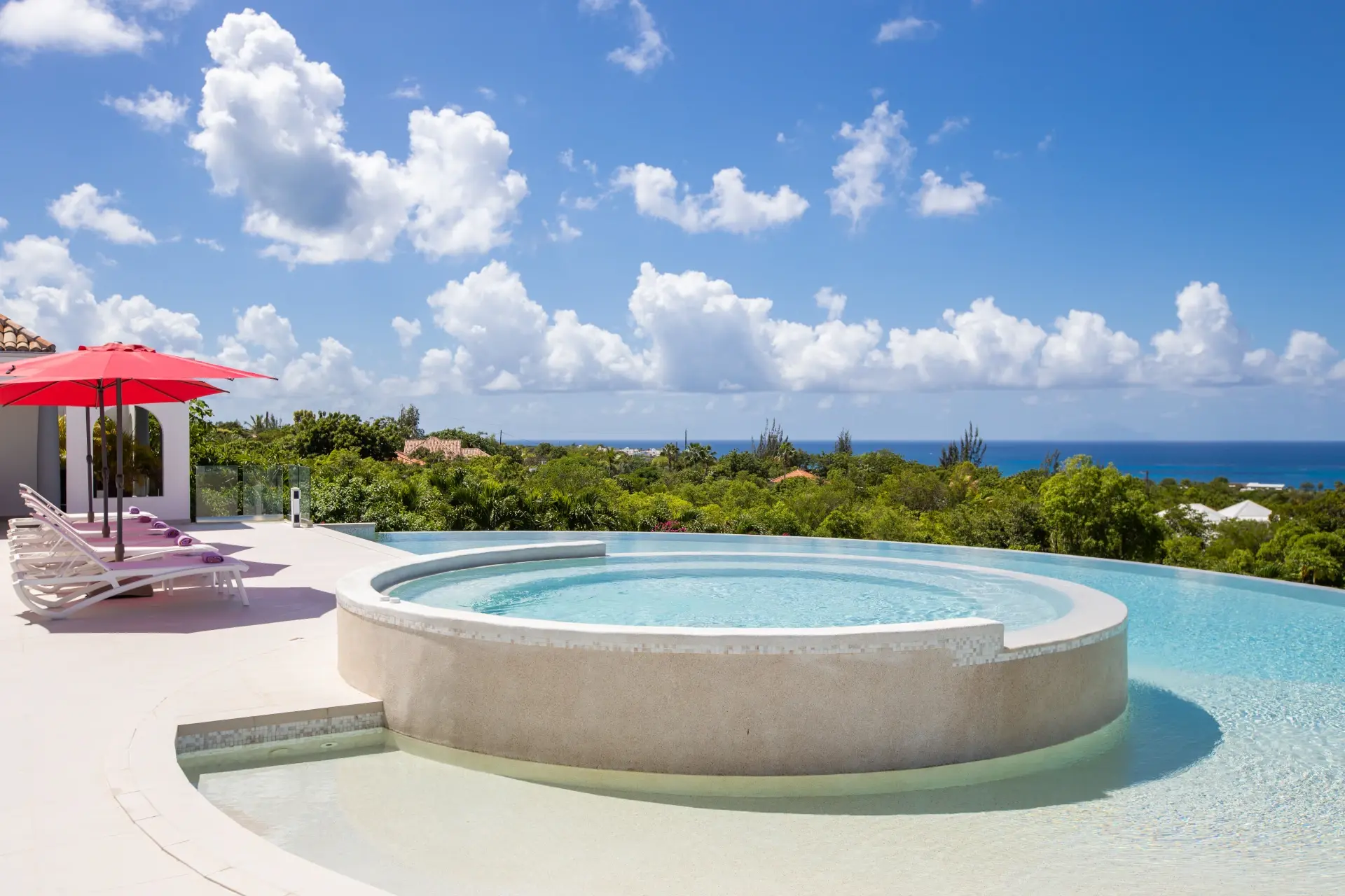 The expansive pool deck is equipped with comfortable chaises lounges, umbrellas, and side tables. Part of the terrace is covered (ideal for reading poolside). The deck surrounds an extra-large jet tub and infinity pool, which has a gradual entry.