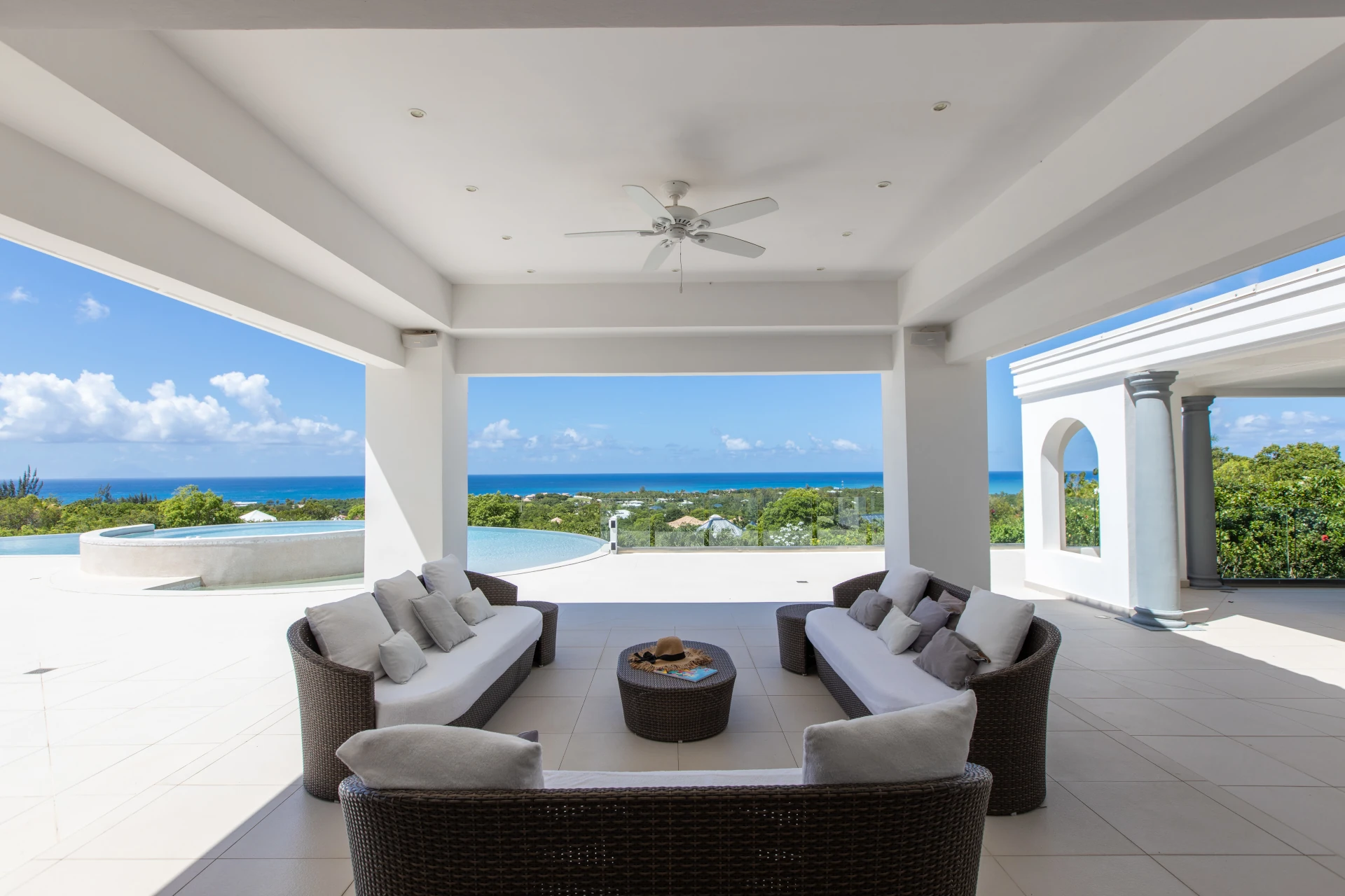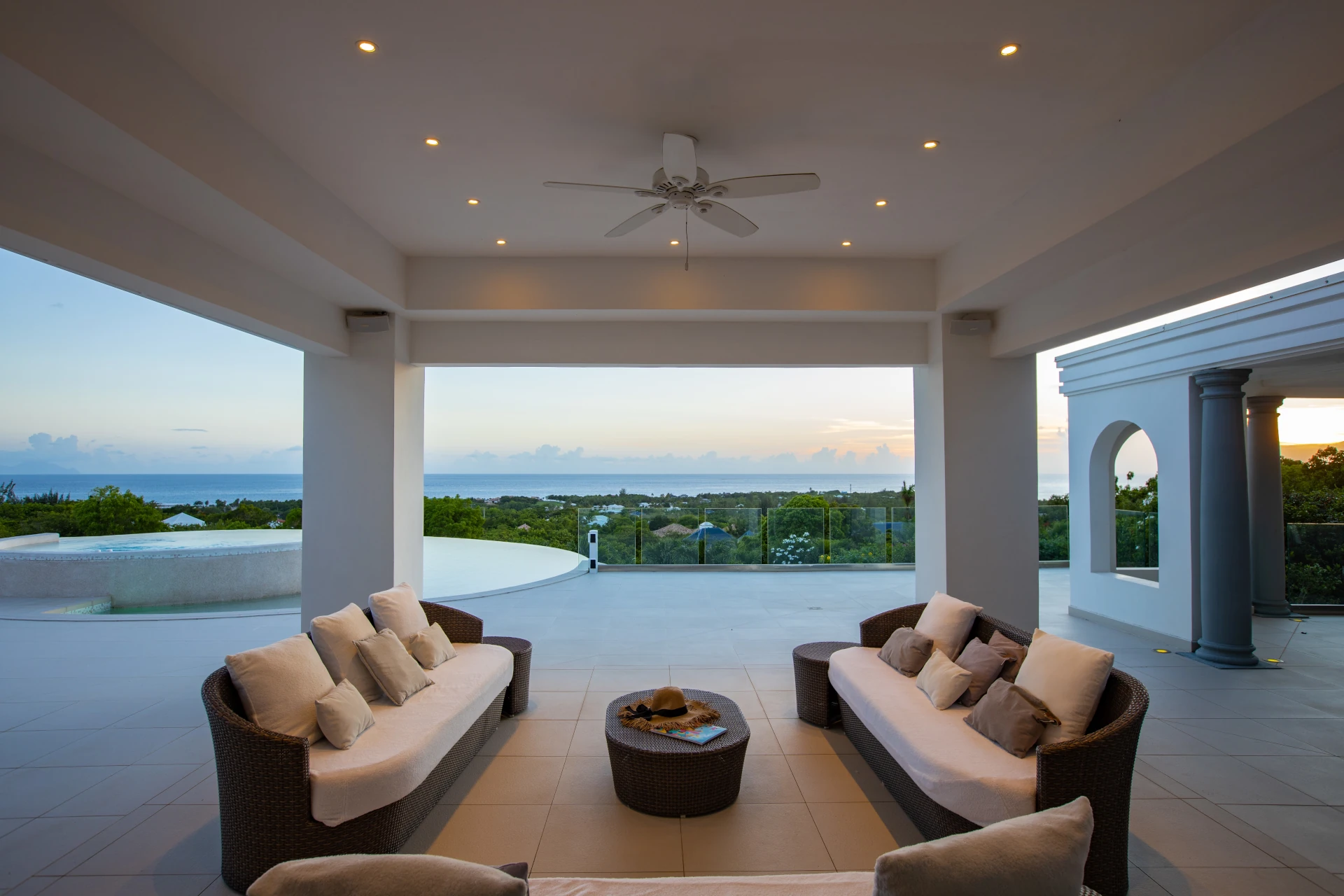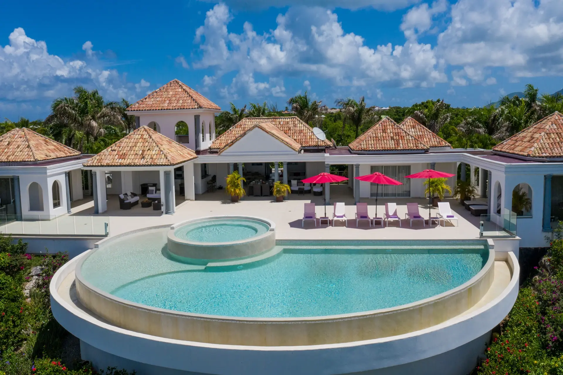 The expansive pool deck is equipped with comfortable chaises lounges, umbrellas, and side tables. Part of the terrace is covered (ideal for reading poolside). The deck surrounds an extra-large jet tub and infinity pool, which has a gradual entry.