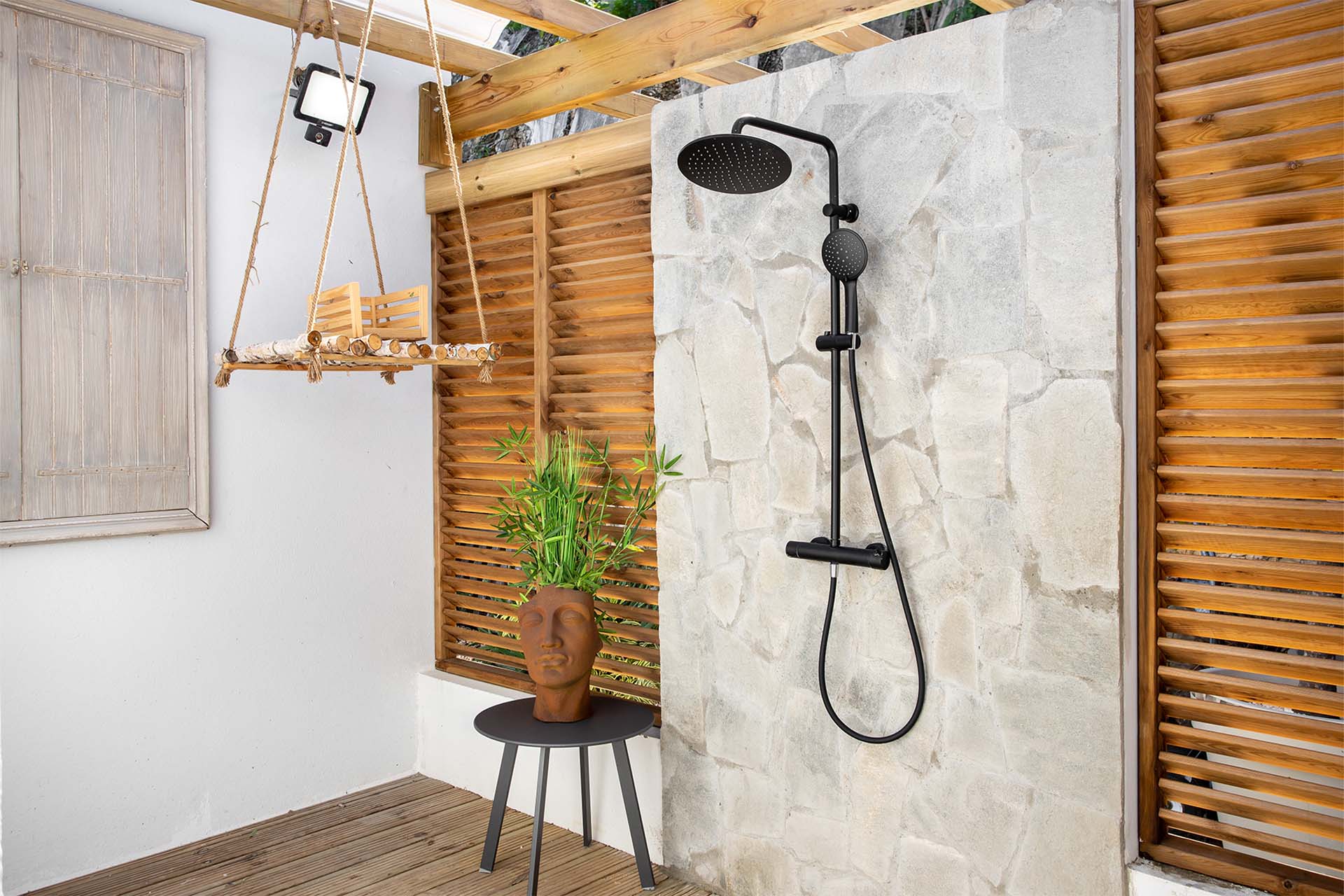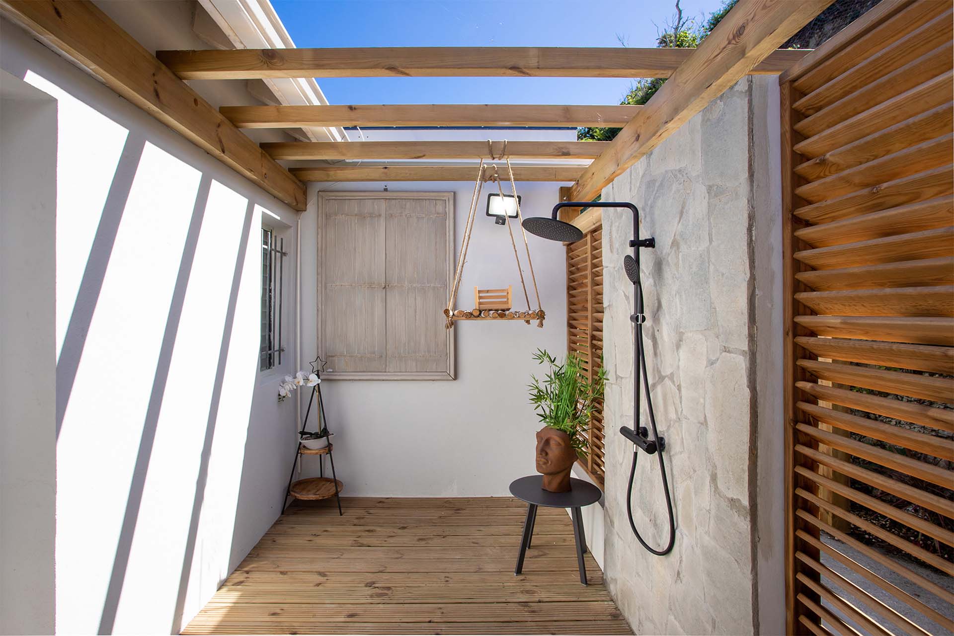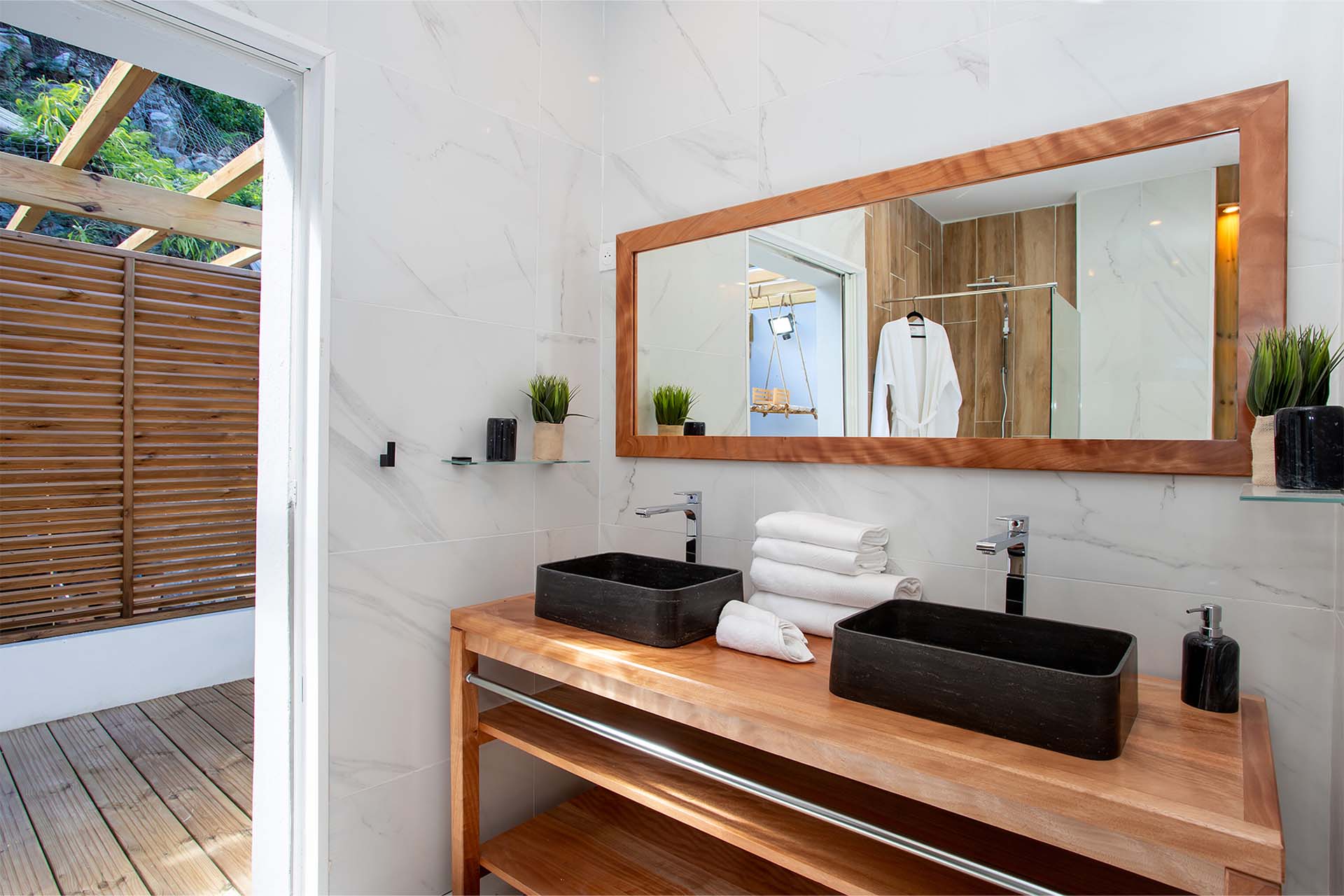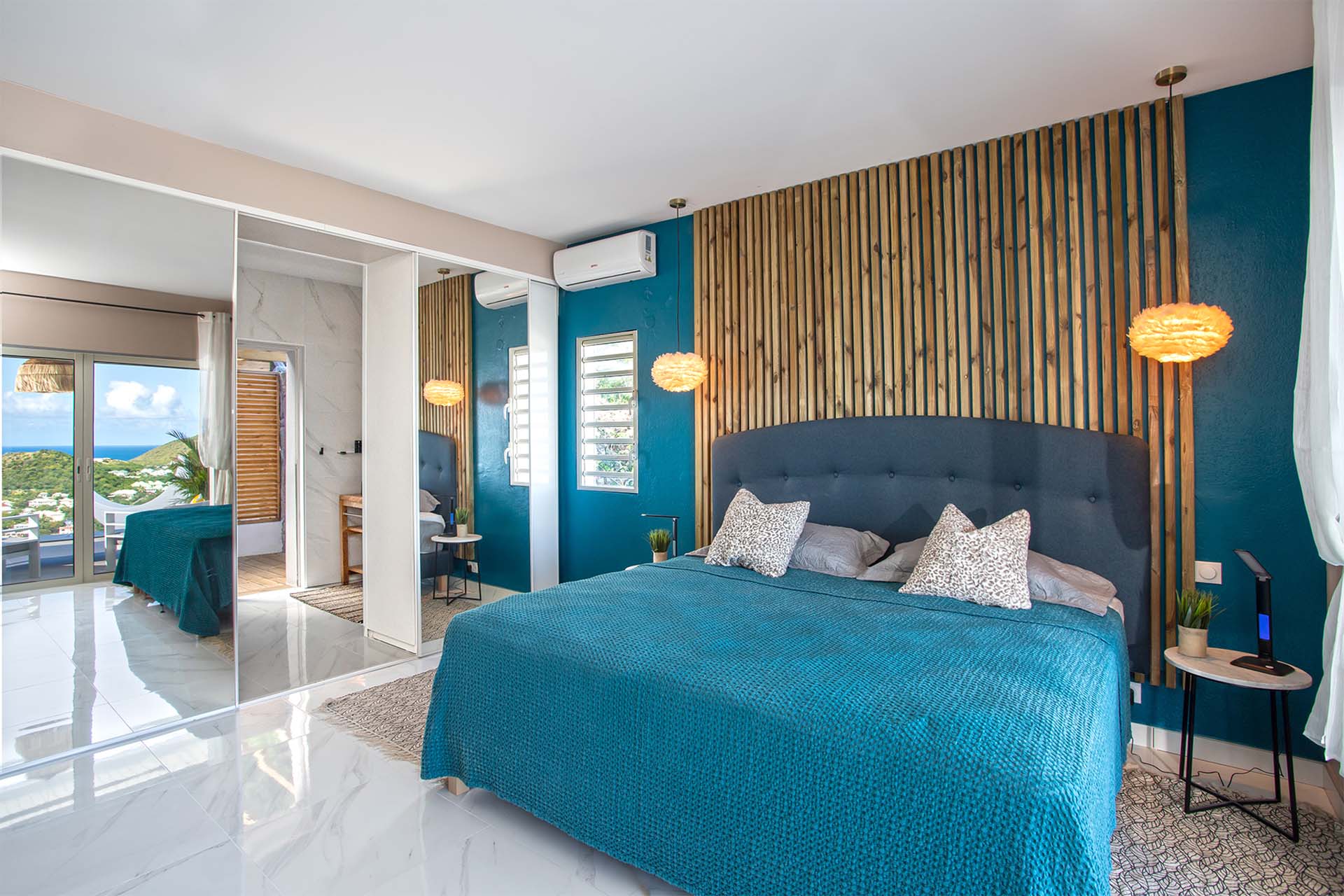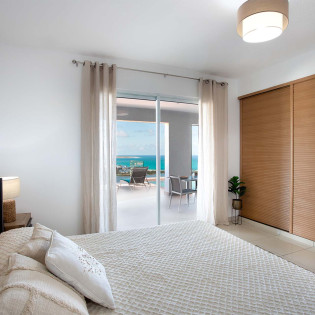 The four bedrooms, each with a king-size bed, have sliding doors that lead to the terrace with ocean views. All rooms have exterior and interior entrances. Two of the bedrooms have ensuite bathrooms with double vanities and showers. The main bedroom has the bonus of a relaxing outdoor shower area.