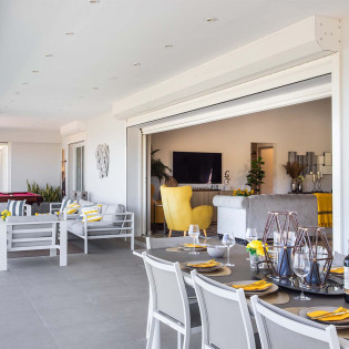 The terrace which is framed by glass railings, is perfect for cooling off in the pool, sunbathing on the pool lounge chairs, or relaxing at one of the tall tables surrounding the space. The covered dining area is ideal for a luxurious meal with stunning views.