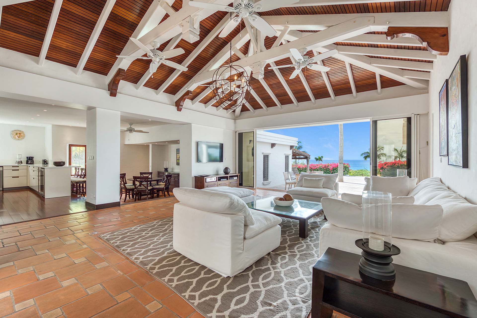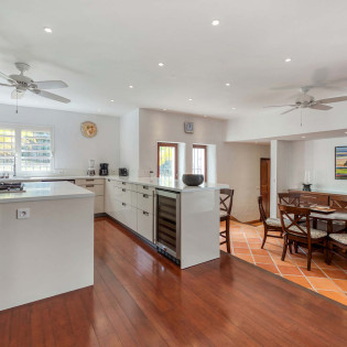 The interior has an island-style design with beautiful contemporary furnishings. The spacious living room with satellite TV opens to the deck. A second furnished living area is located outside underneath a large gazebo. The spacious, well-equipped kitchen has a breakfast bar with stools and a center island.
