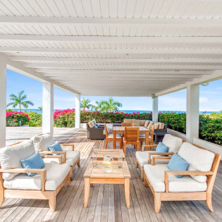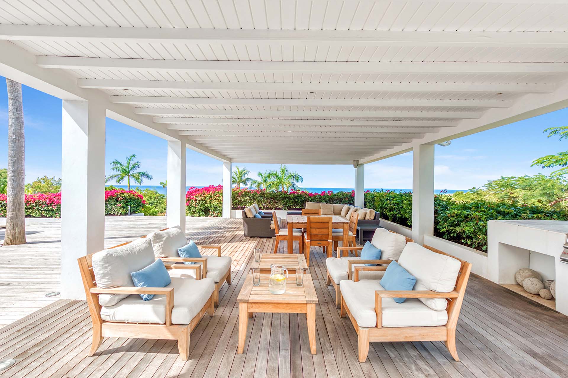 The spacious deck has sun-drenched and covered lounge areas around the pool, making this an ideal spot for sunbathing or reading in the shade. Adjacent to the pool is an outdoor dining area.