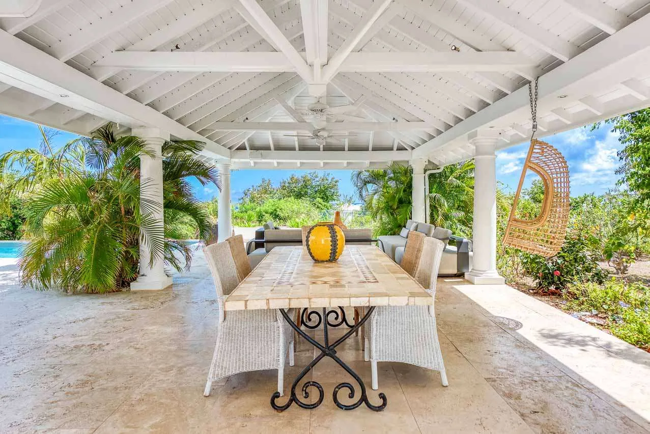 The comfortable living room with Rattan furnishings has blue and yellow doors, which open to the terrace. Located nearby is the covered terrace with a dining area that comfortably seats up to 8 guests and a second living area with overstuffed white Rattan sofas.