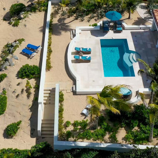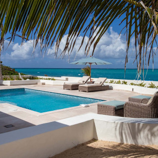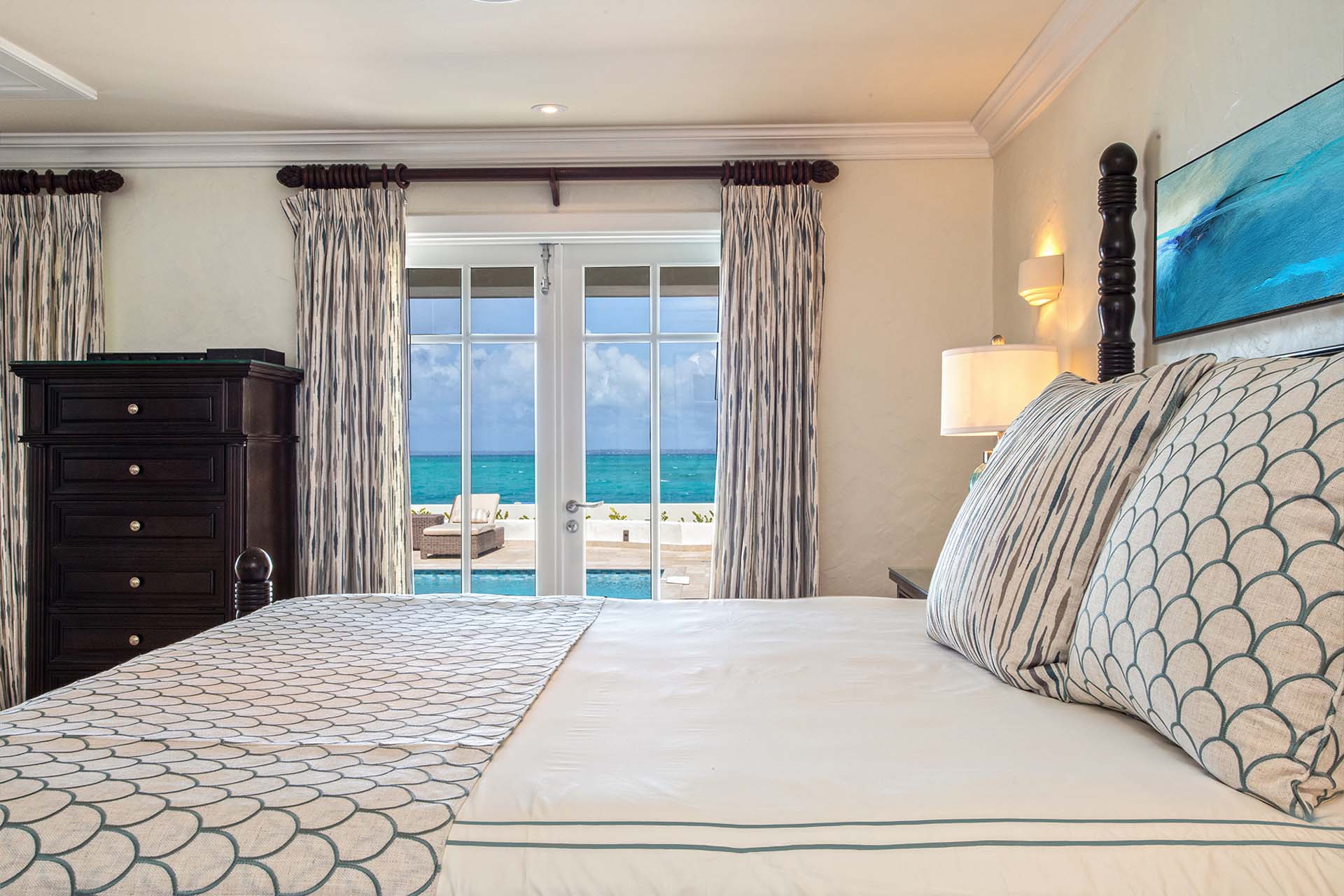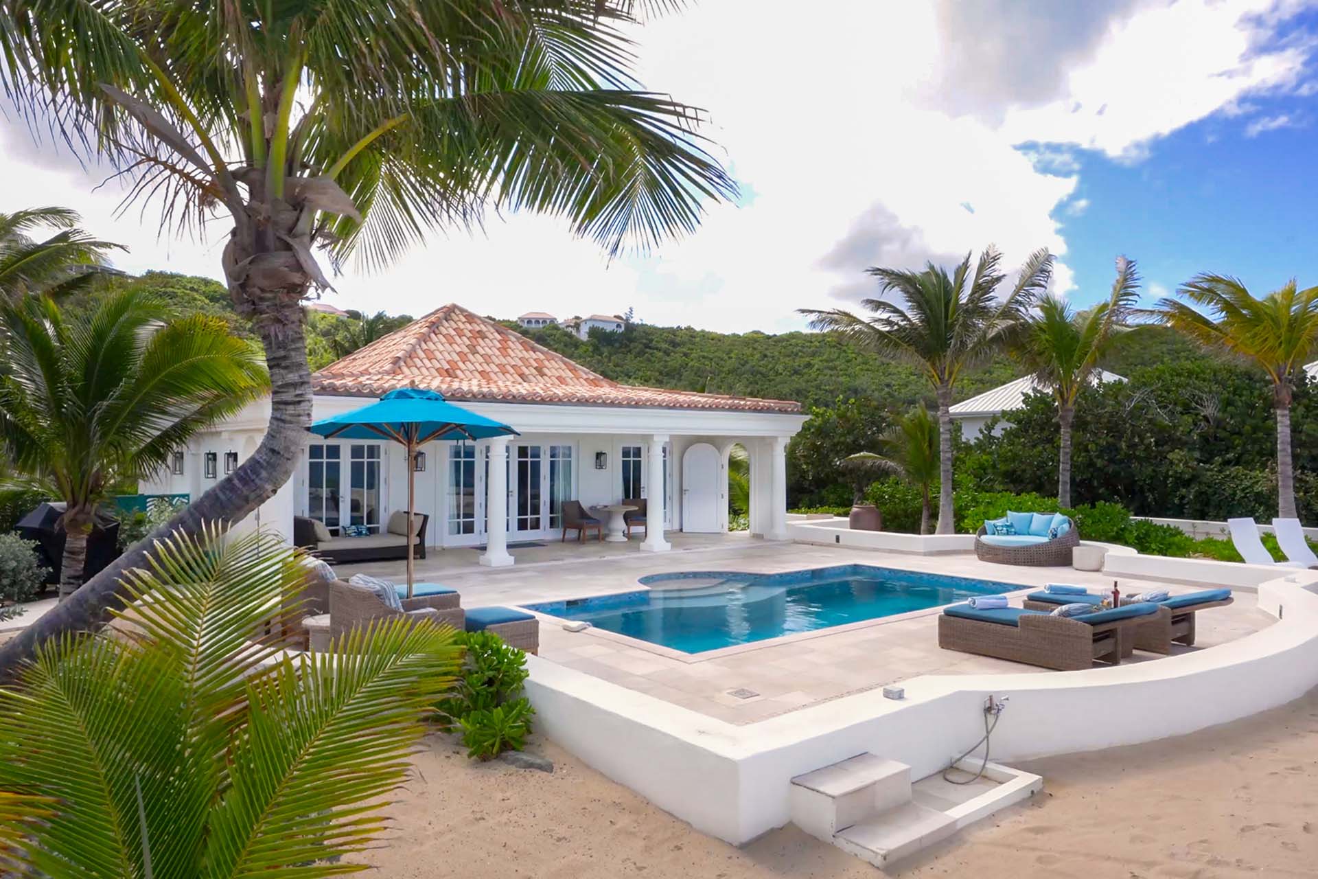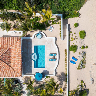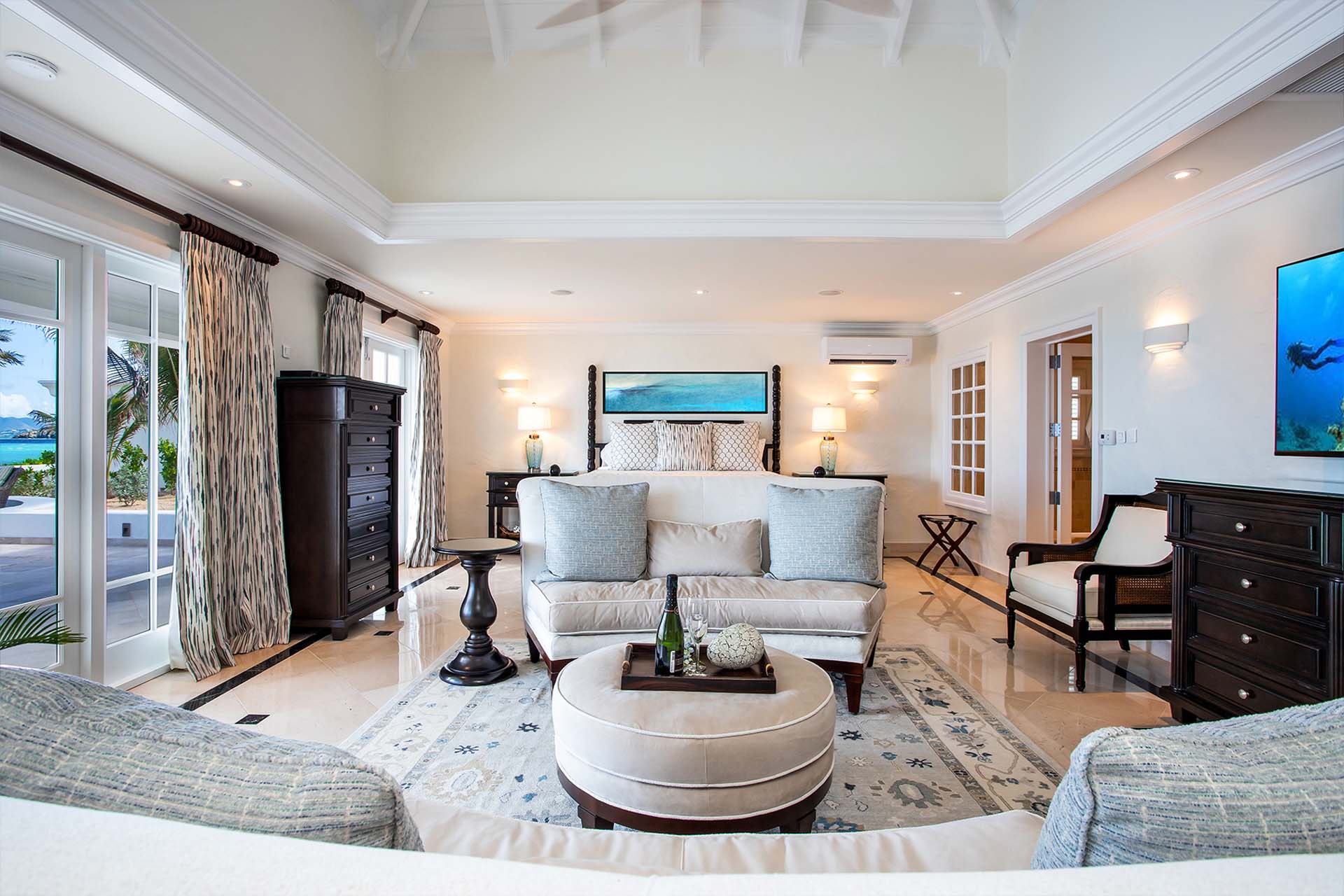 During the day, enjoy the changing ocean hues from the terrace, dip in the mosaic glass-trimmed pool, or relax on loungers by the beach. As the sun sets, unwind on the daybed with cocktails, enjoying the Caribbean's vibrant sunset colors. For meals, use the well-equipped kitchen, BBQ area, or opt for a private chef to prepare romantic dinners by the sea.