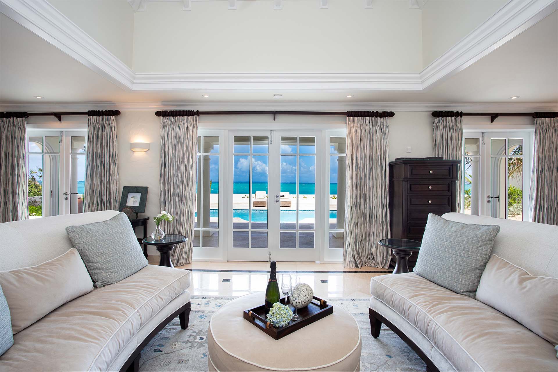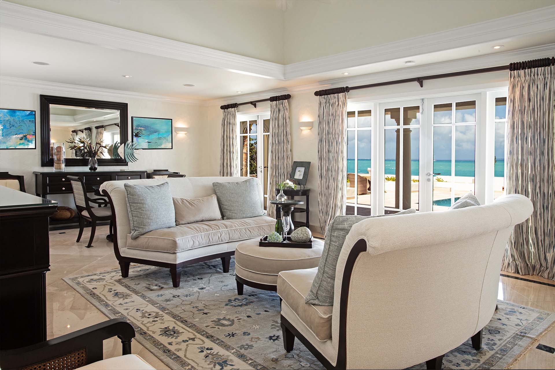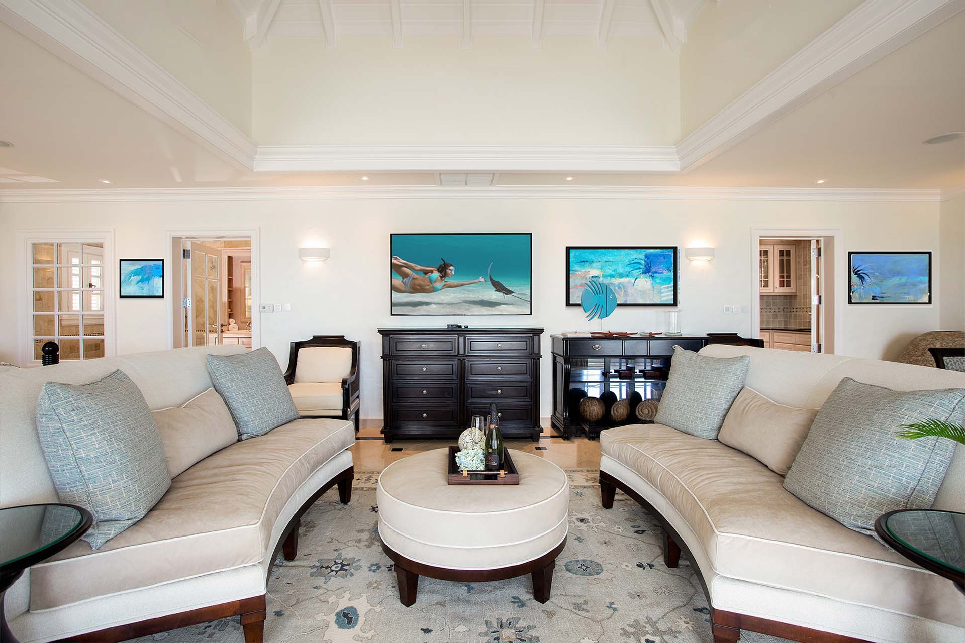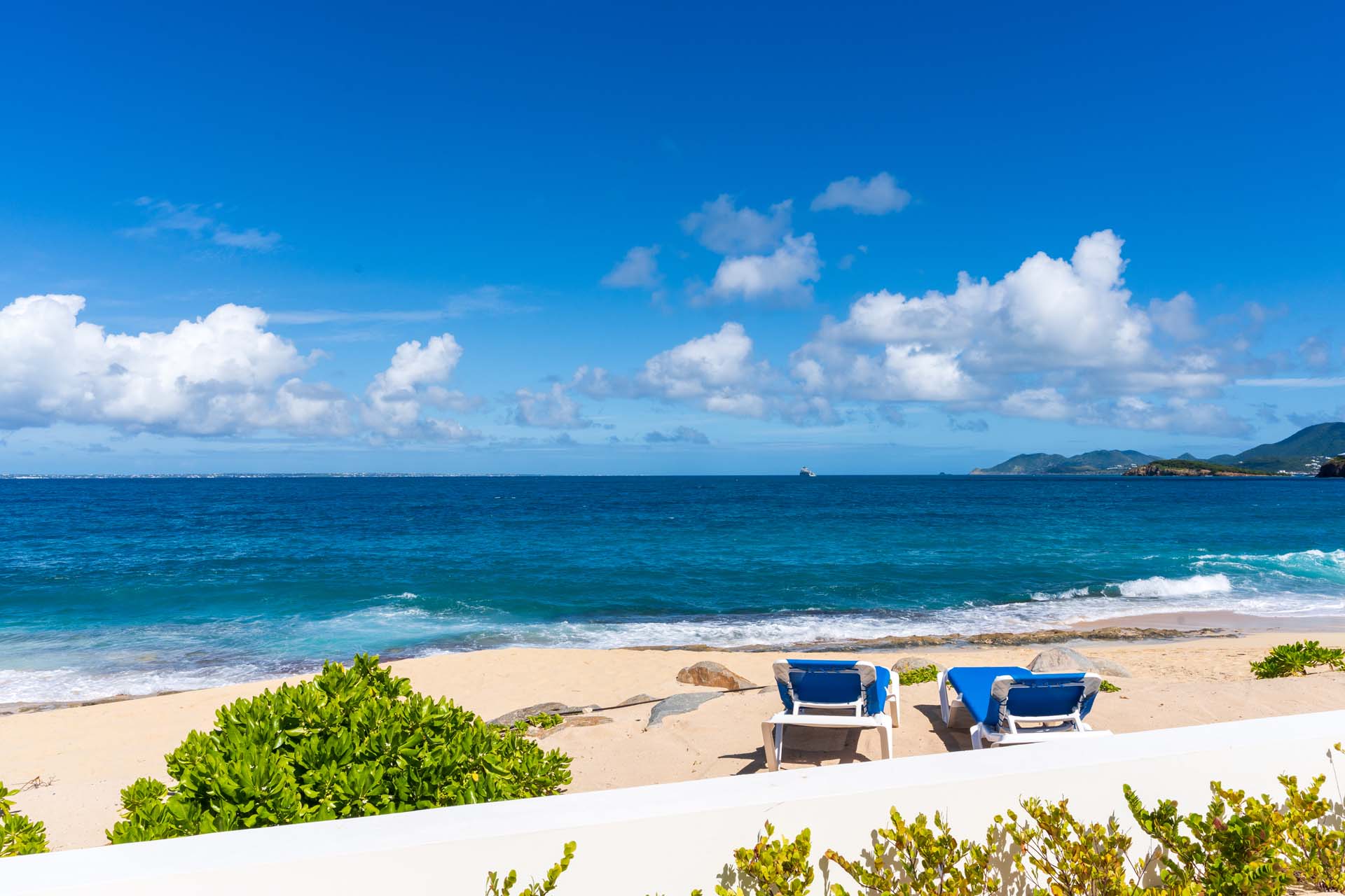 During the day, enjoy the changing ocean hues from the terrace, dip in the mosaic glass-trimmed pool, or relax on loungers by the beach. As the sun sets, unwind on the daybed with cocktails, enjoying the Caribbean's vibrant sunset colors. For meals, use the well-equipped kitchen, BBQ area, or opt for a private chef to prepare romantic dinners by the sea.