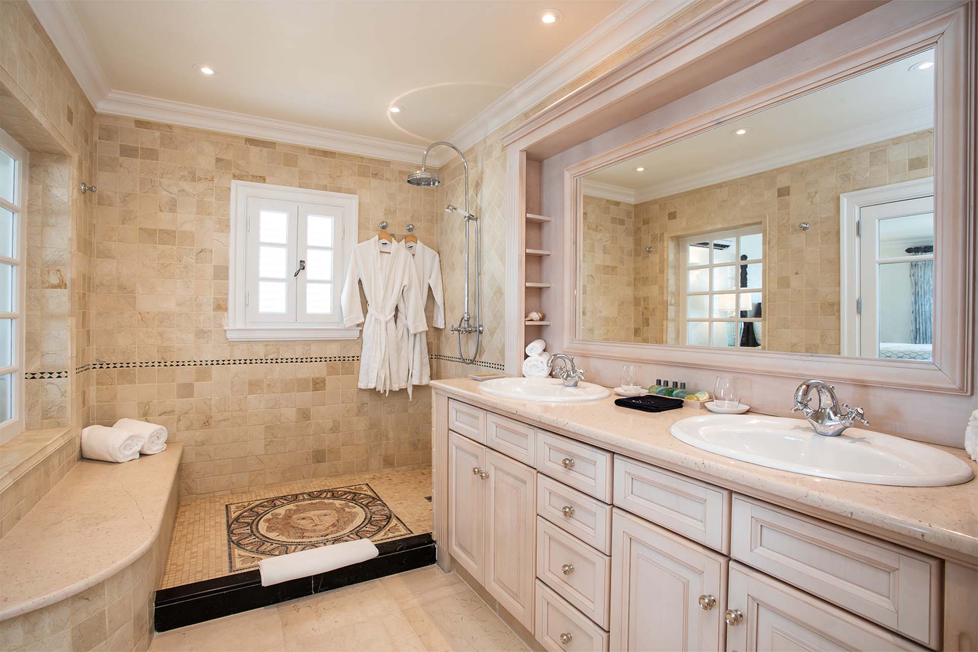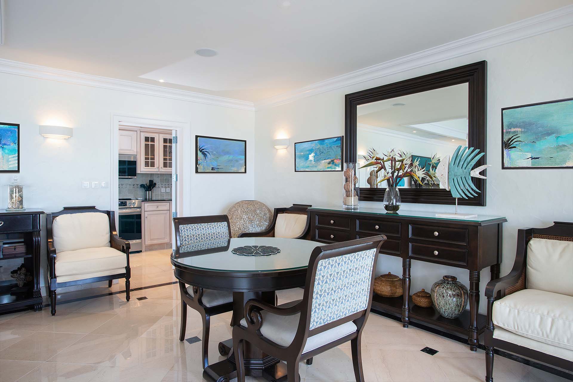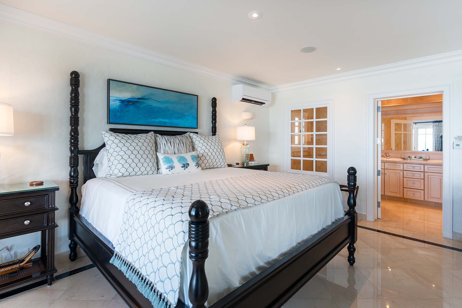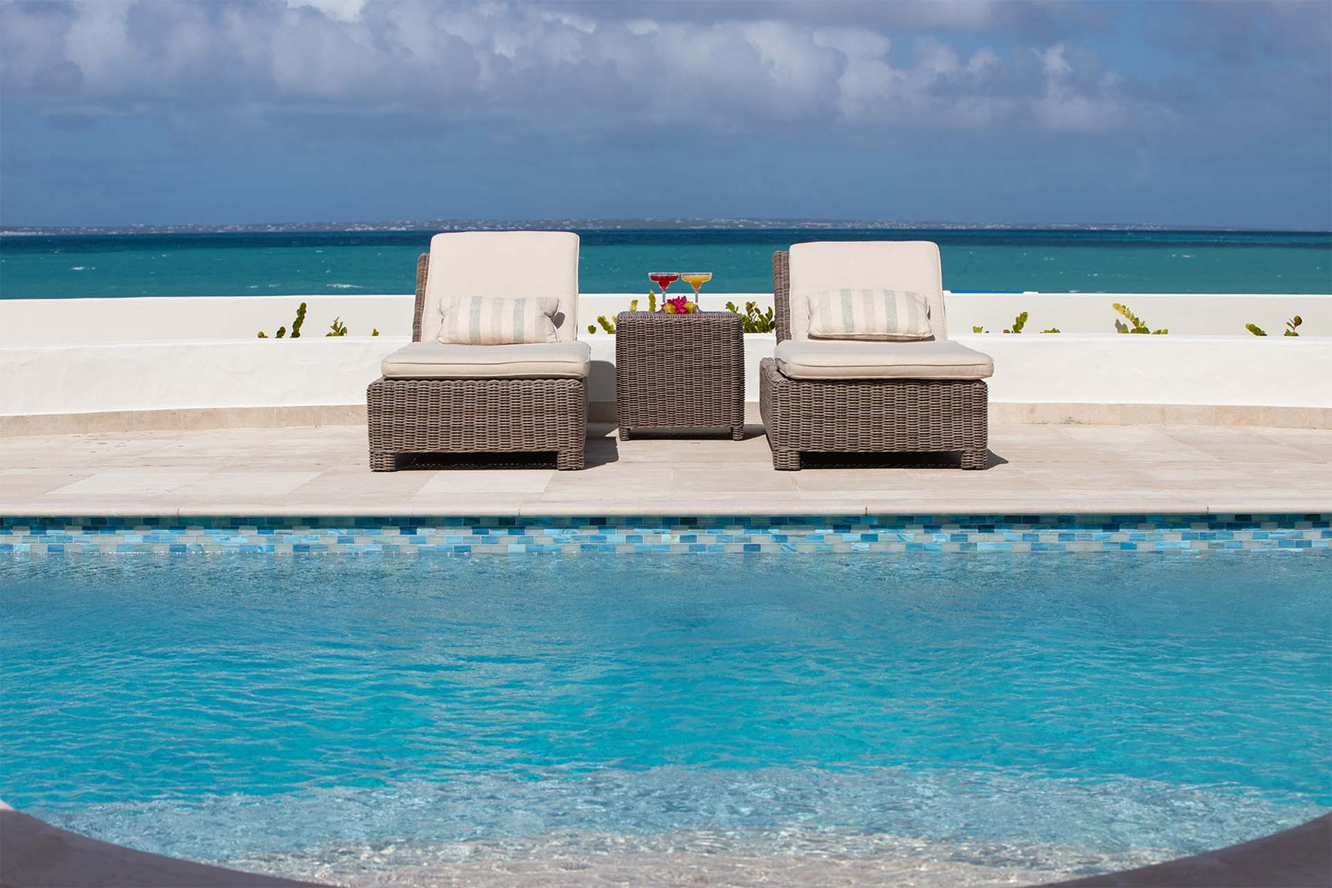 During the day, enjoy the changing ocean hues from the terrace, dip in the mosaic glass-trimmed pool, or relax on loungers by the beach. As the sun sets, unwind on the daybed with cocktails, enjoying the Caribbean's vibrant sunset colors. For meals, use the well-equipped kitchen, BBQ area, or opt for a private chef to prepare romantic dinners by the sea.