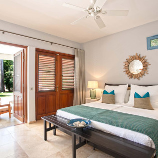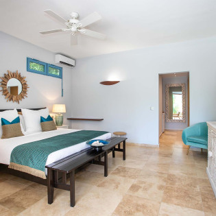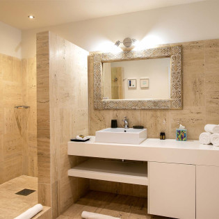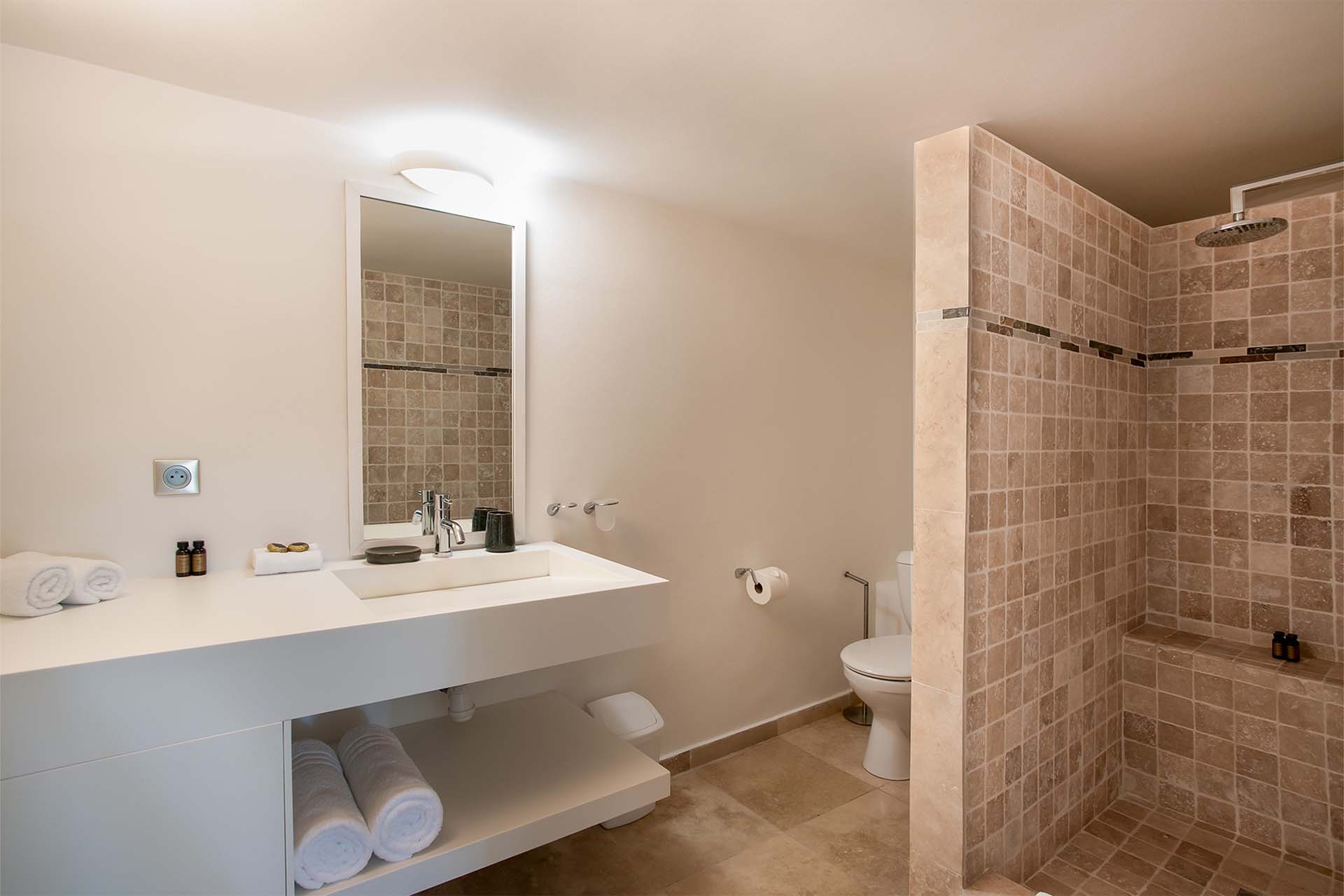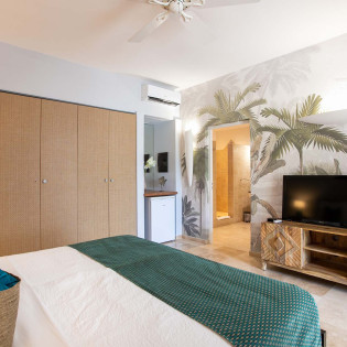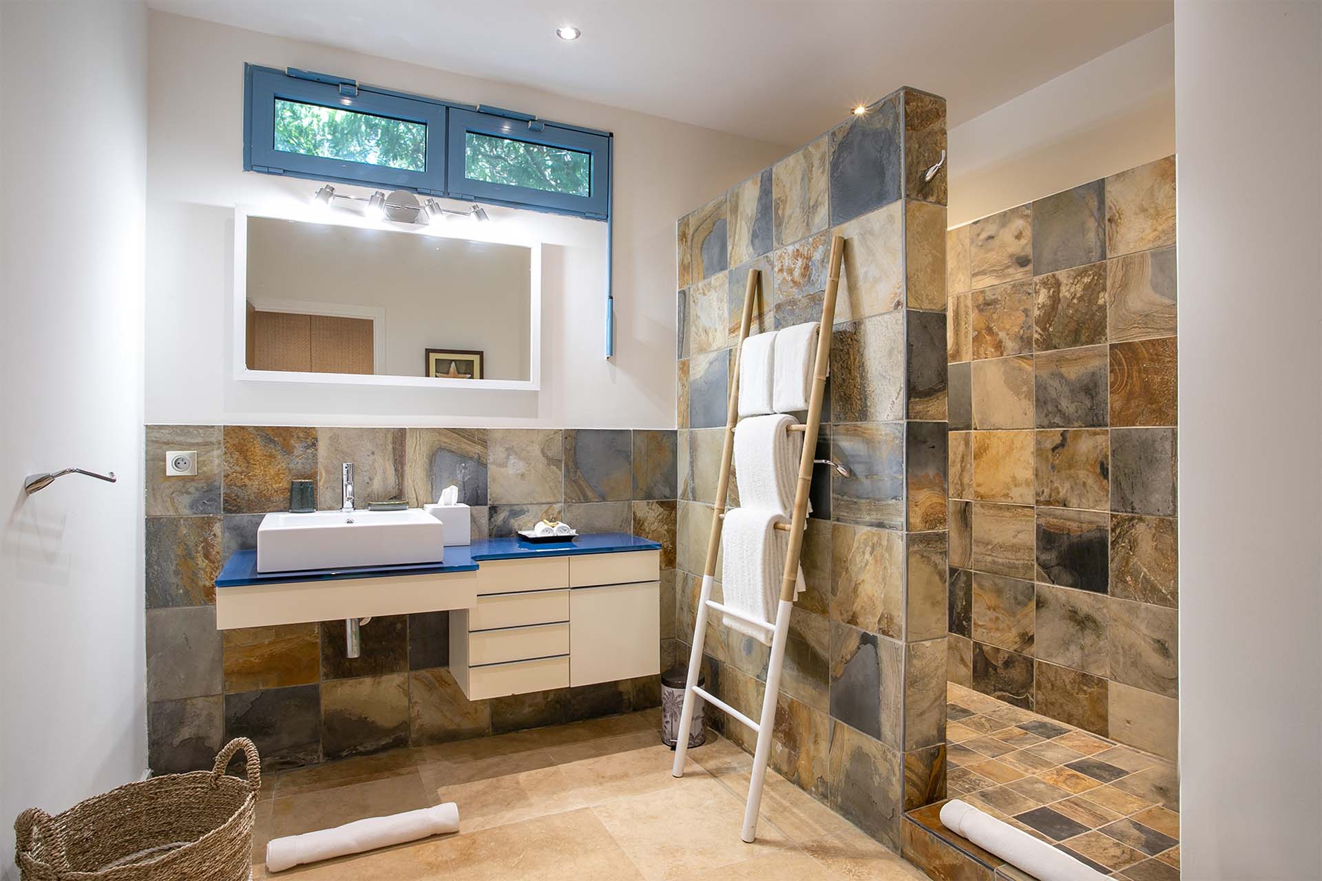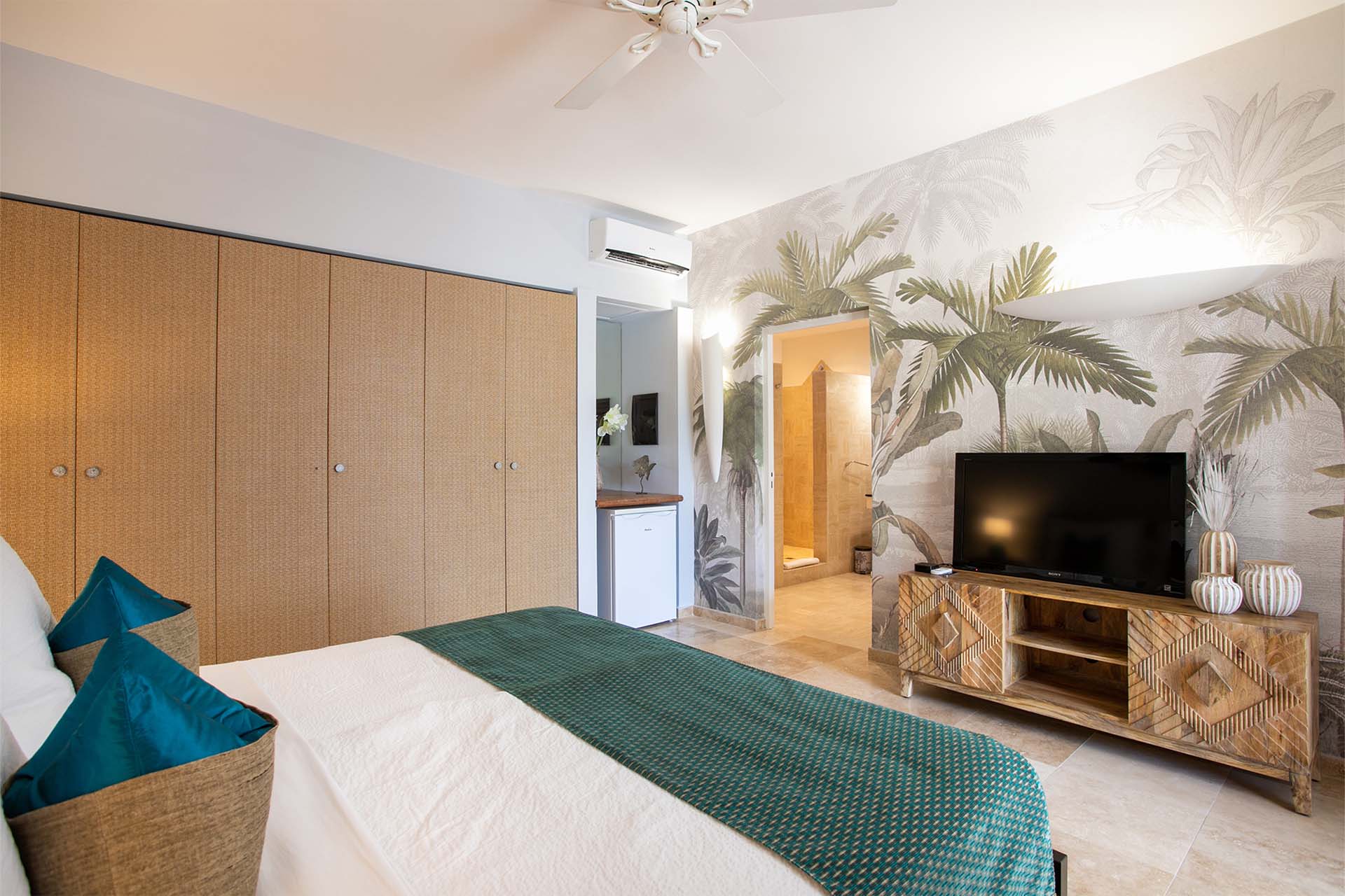 Fully air-conditioned, Villa Les Palmiers Bleus spacious bedrooms each have an ensuite bathroom and there’s a studio as the 5th bedroom with its ensuite bathroom. The 3rd and 4th bedrooms open to the exterior and have a view of the garden.