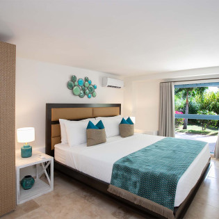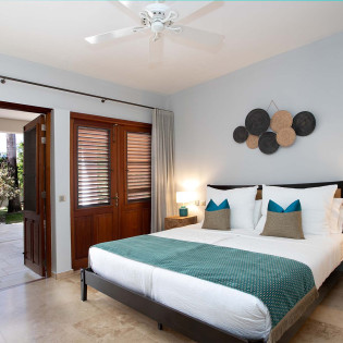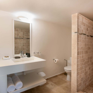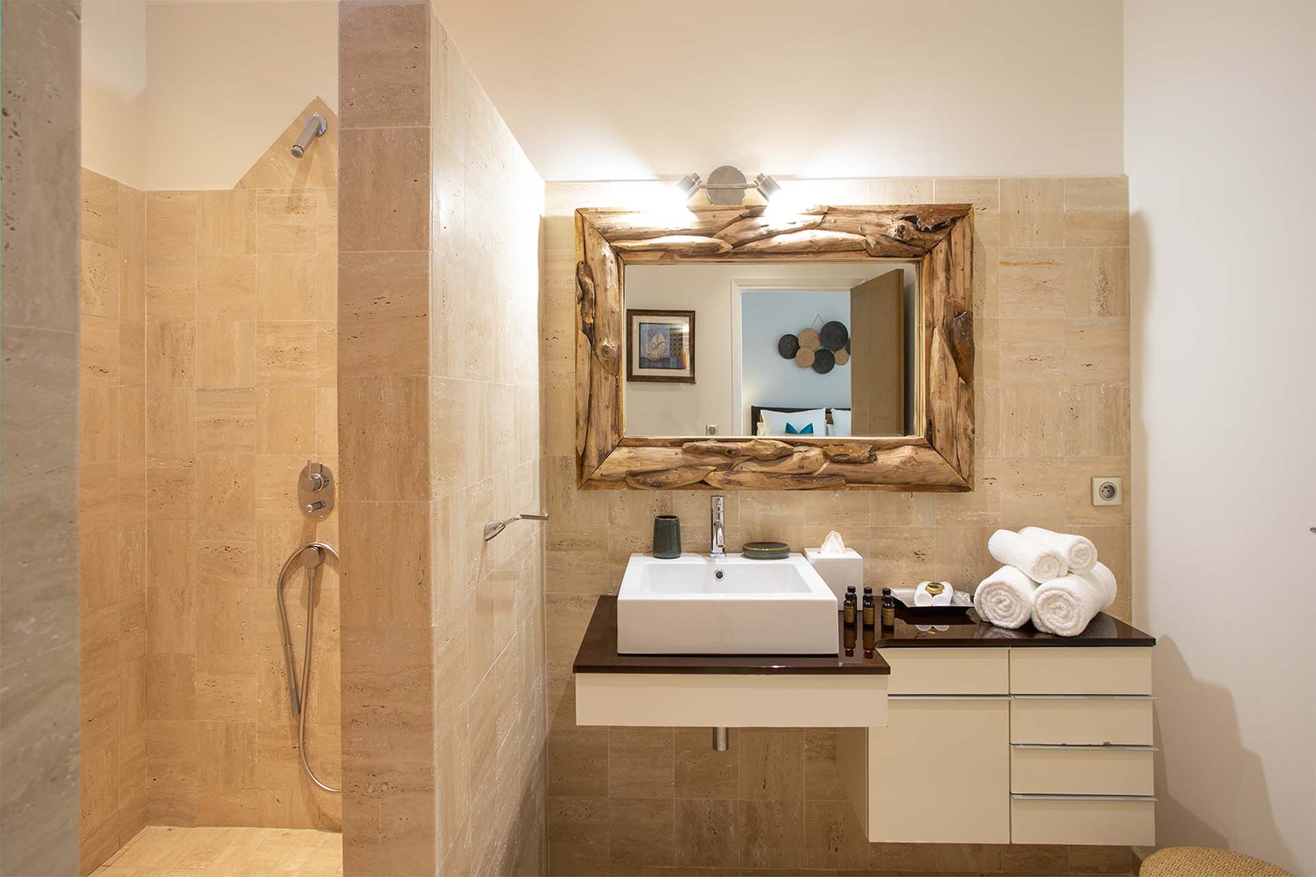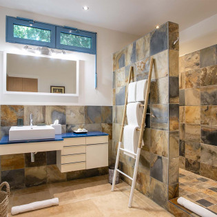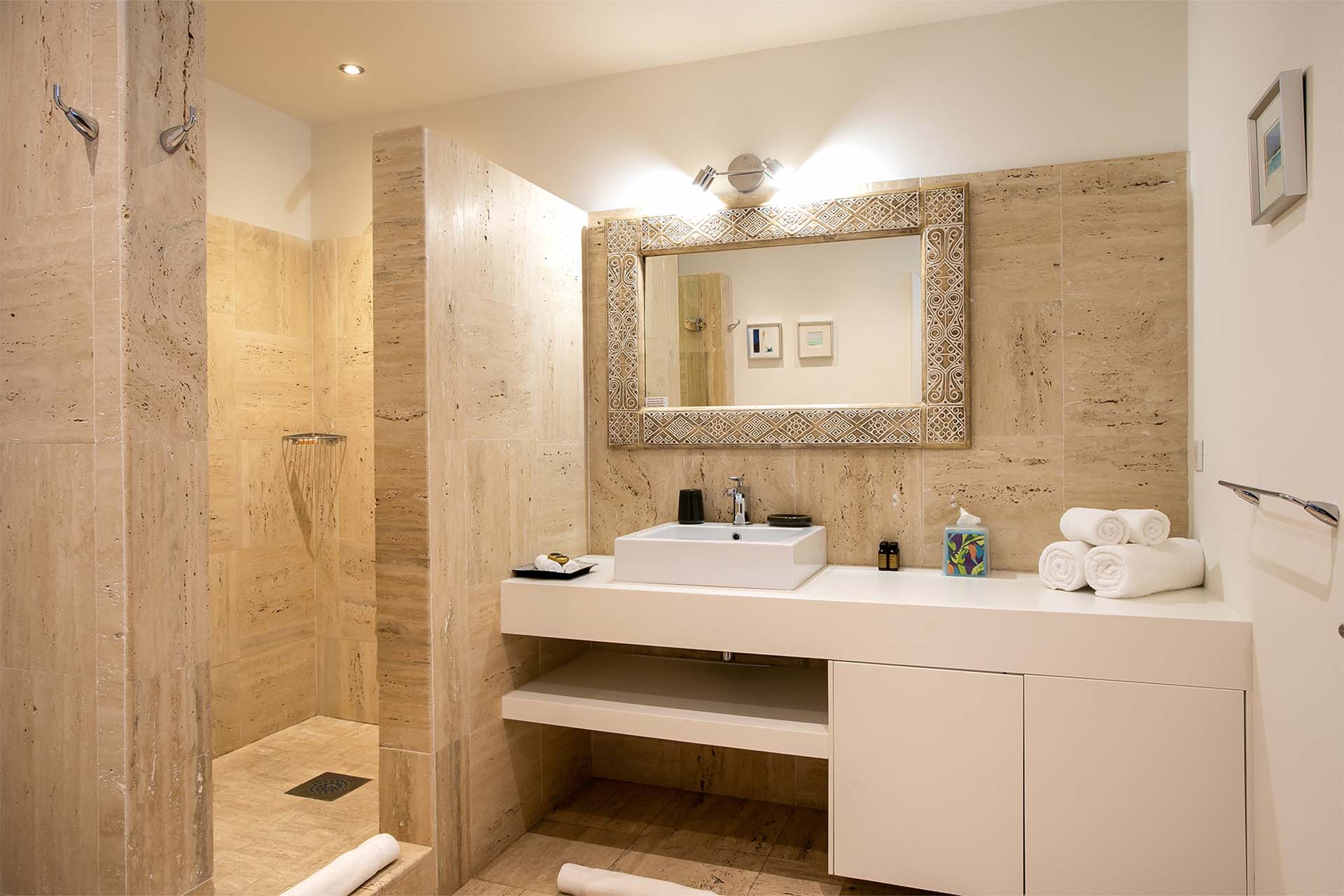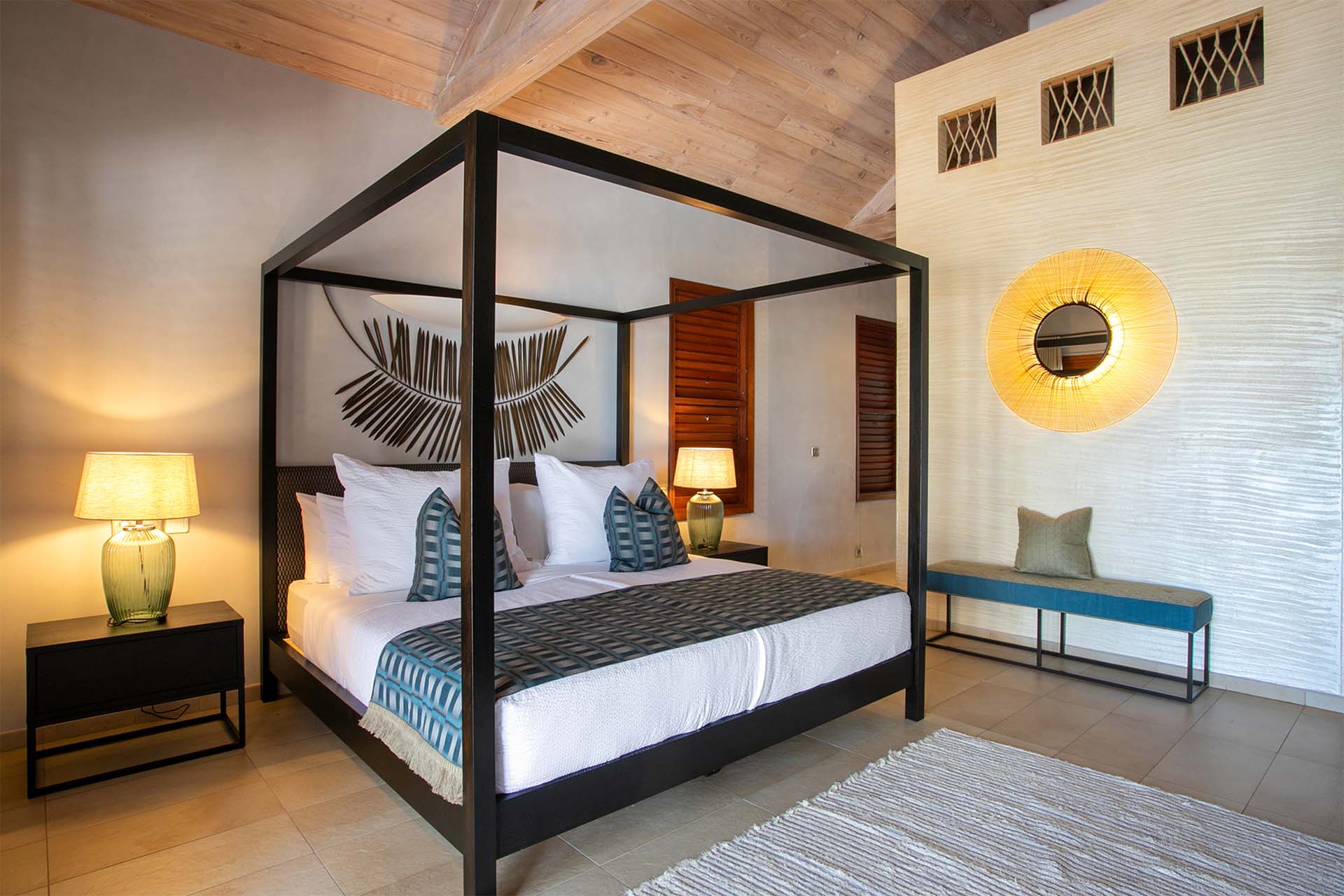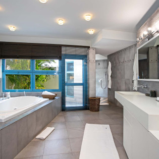 Fully air-conditioned, Villa Les Palmiers Bleus spacious bedrooms each have an ensuite bathroom and there’s a studio as the 5th bedroom with its ensuite bathroom. The 3rd and 4th bedrooms open to the exterior and have a view of the garden.