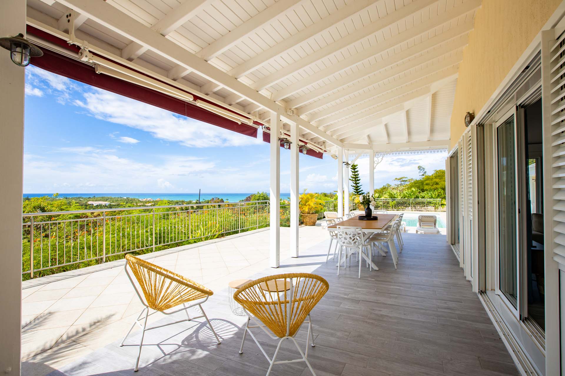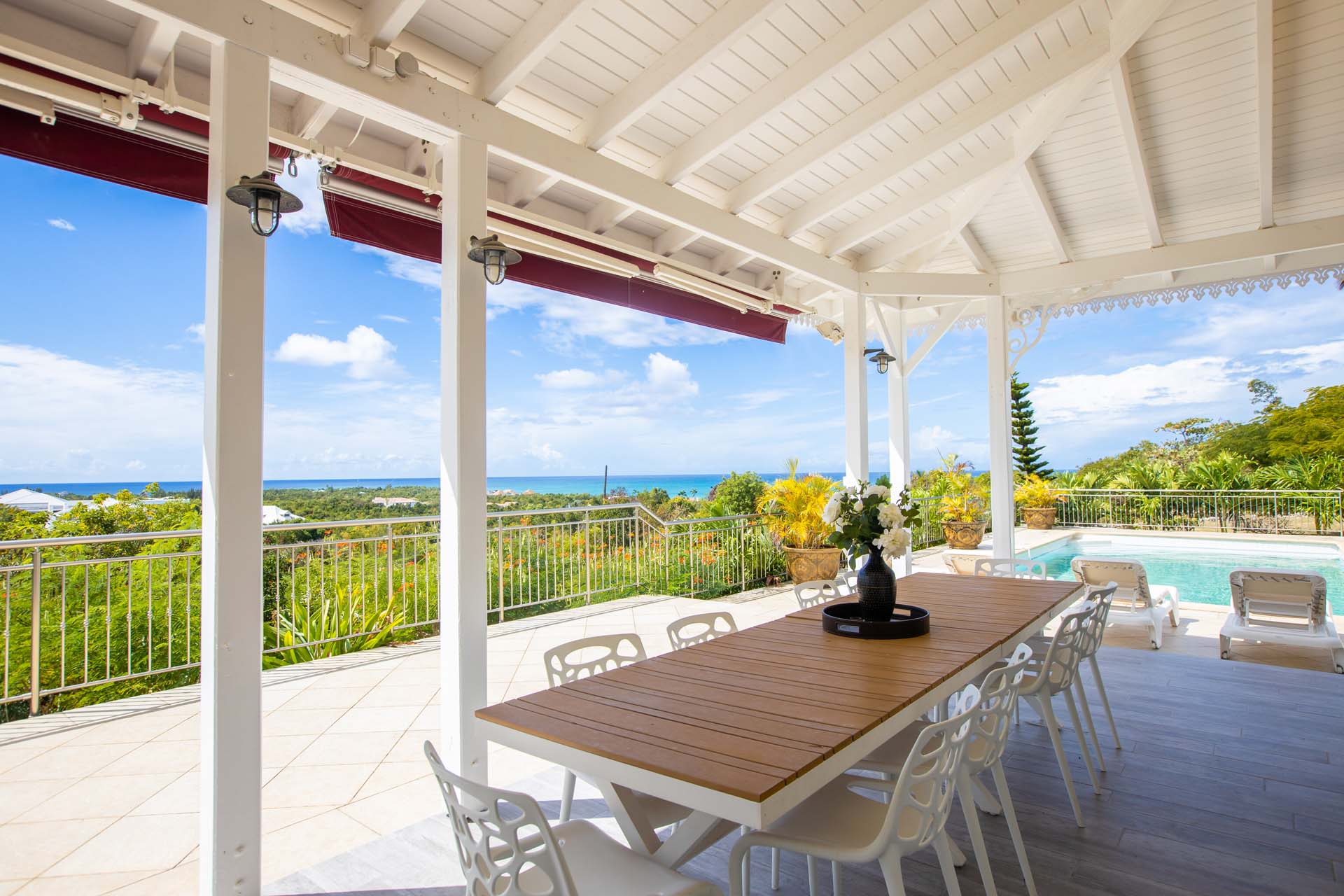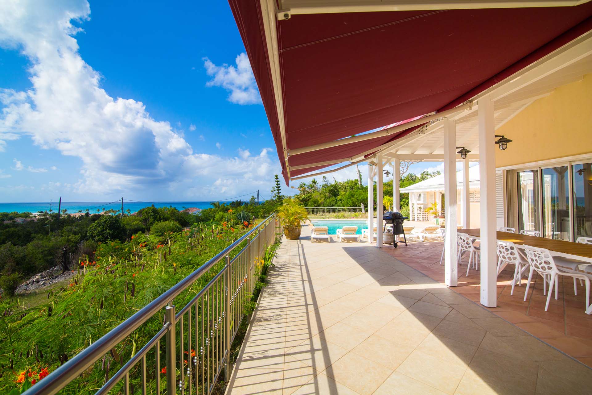 You will enjoy the great views of Baie aux Prunes from the spacious terrace around the pool, the covered sitting area, as well as the kitchen and living area.