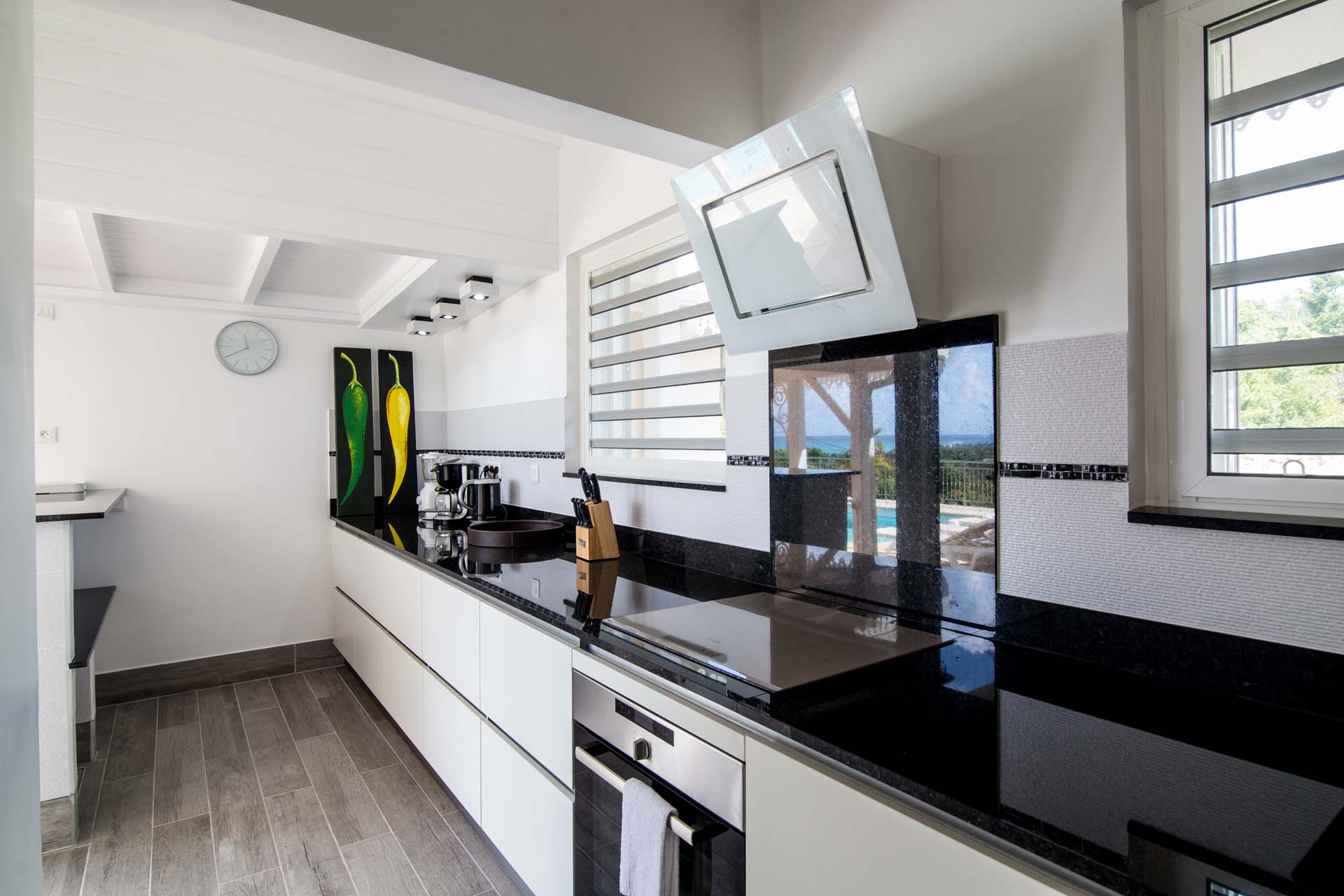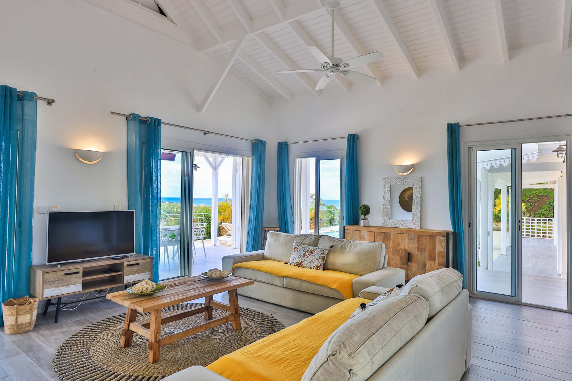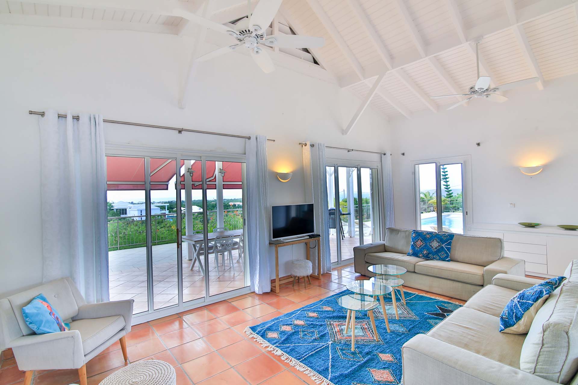 You will enjoy the great views of Baie aux Prunes from the spacious terrace around the pool, the covered sitting area, as well as the kitchen and living area.
