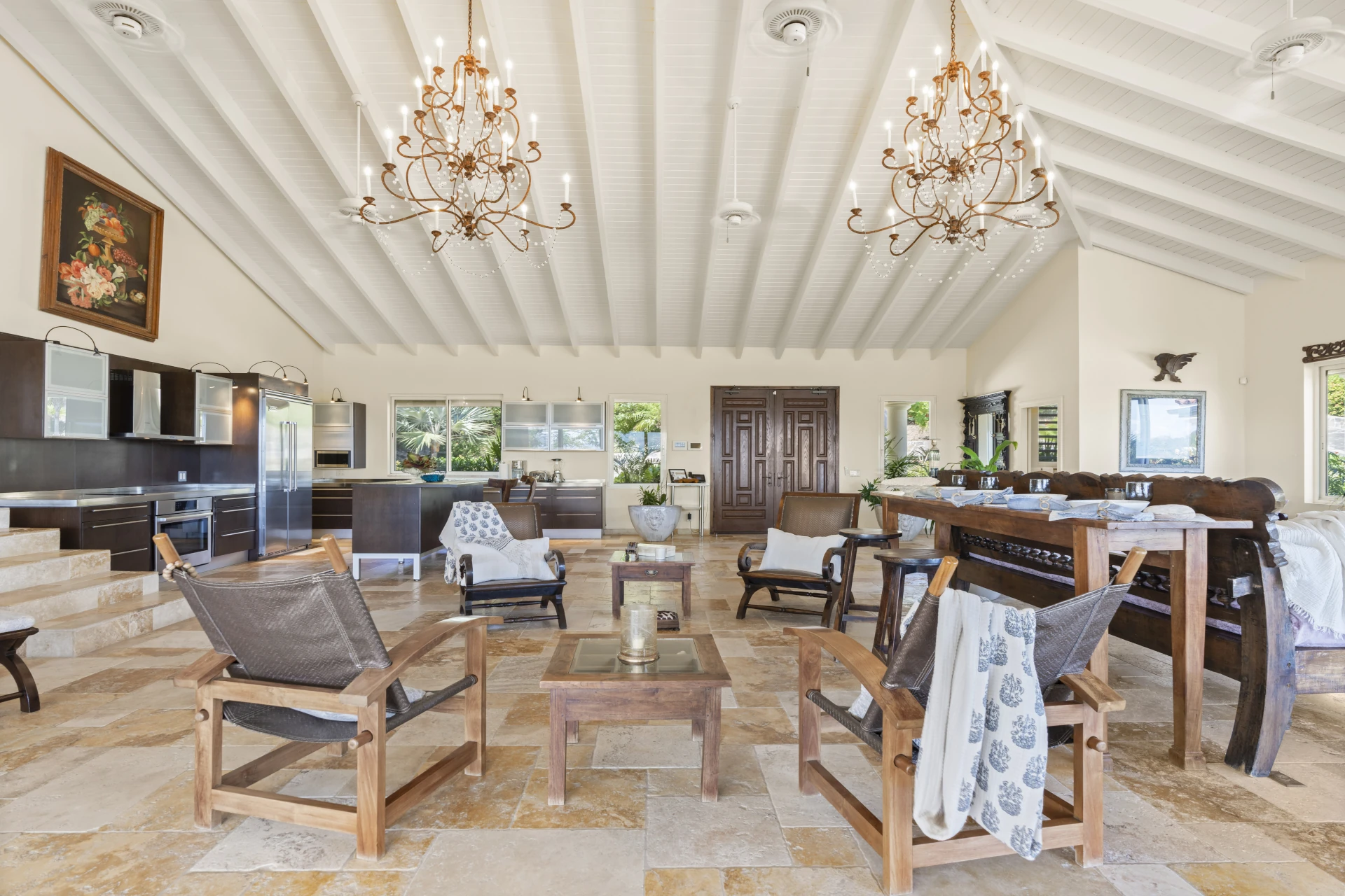 Bedrooms include two off the living room, one upper and one lower, each with private sitting areas. Descent the outside stairs to the two bedroom suite with a shared media room and terrace. Two more bedrooms are in private casitas surrounded by lush gardens. Every bedroom is furnished Indonesian style in soft creams, whites and sand beige tones. Each has a soothing marble, spa-style bathroom featuring big walk-in showers and carved stone sinks.