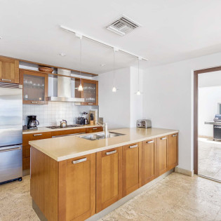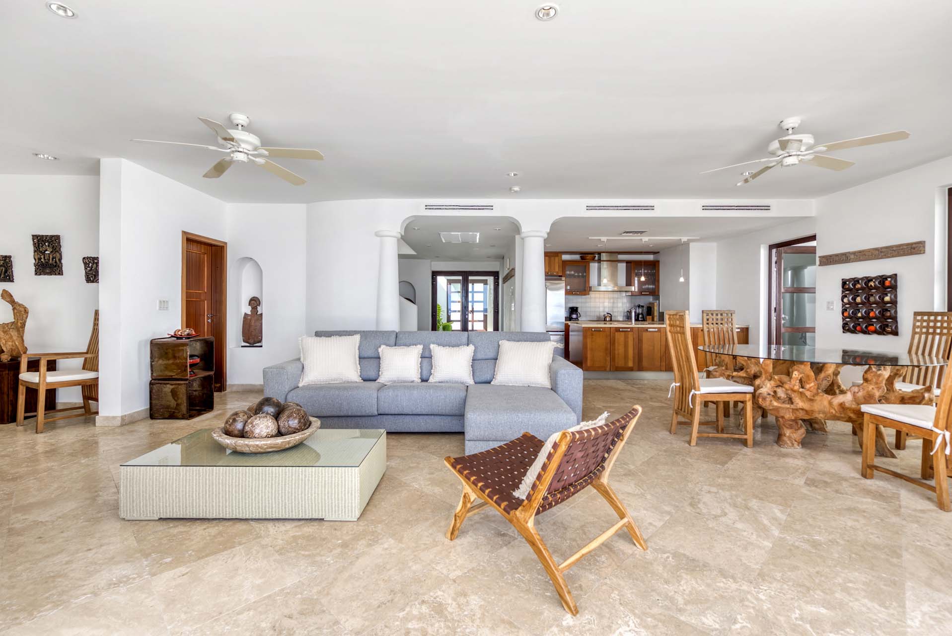 The spacious great room comprises a living area, small indoor dining area, and well-equipped kitchen with barbecue. A second dining area with barbecue is located underneath the covered terrace. The living area is furnished with a sectional sofa, flat screen satellite TV, and an office nook with a Mac computer. The great room opens to the covered terrace.