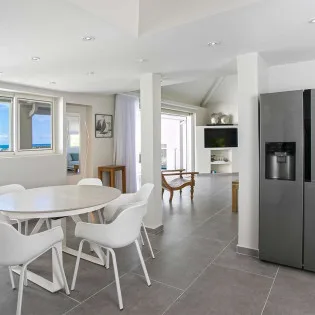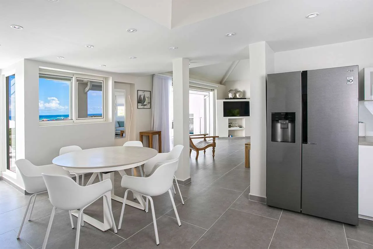 This recently remodeled villa has a spacious living area that opens out to a covered terrace with a dining area, large sun deck, and pool. The eat-in kitchen is well-equipped and has a dining table that seats 8 guests. A gas grill is located adjacent to the kitchen.