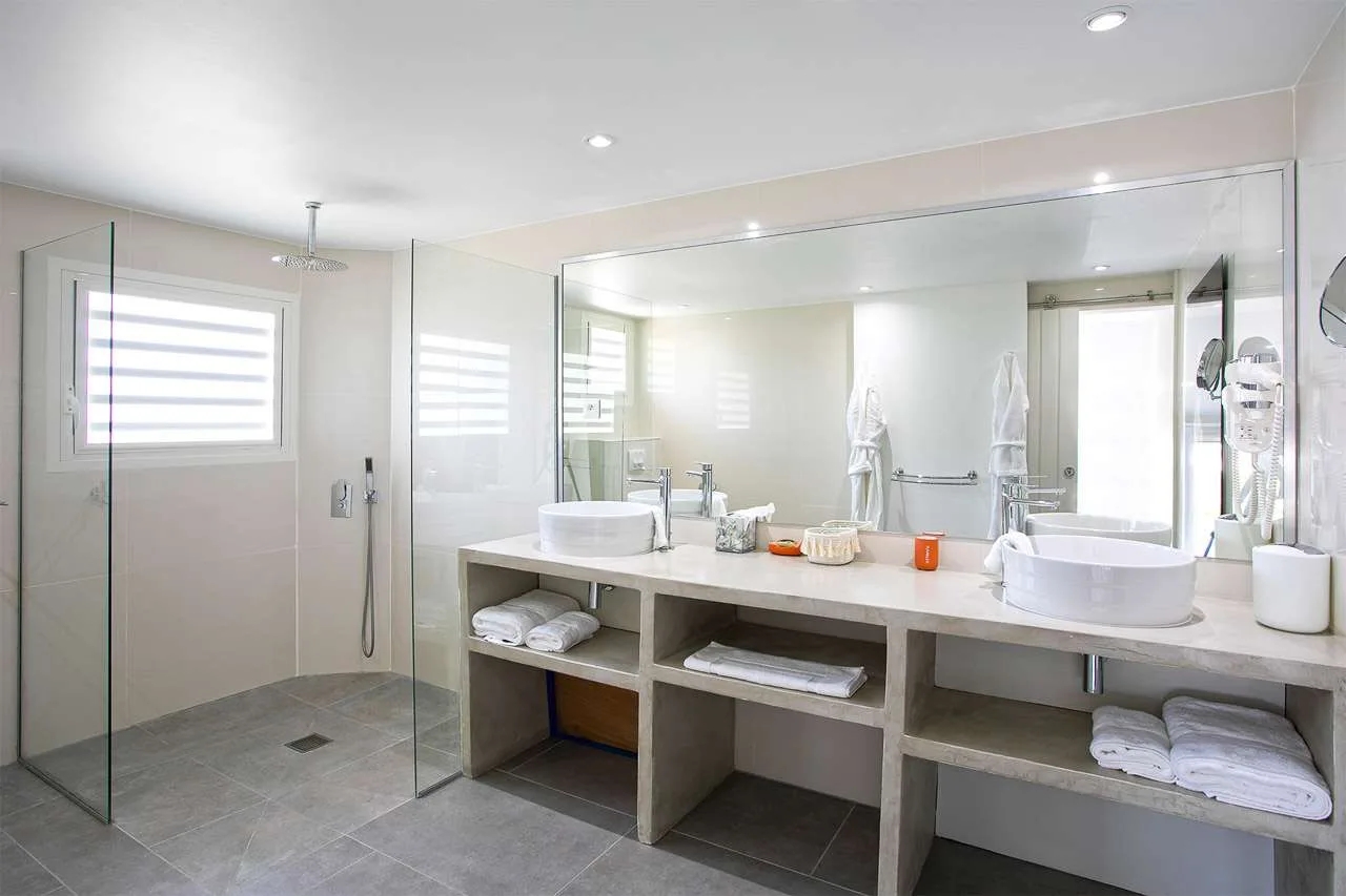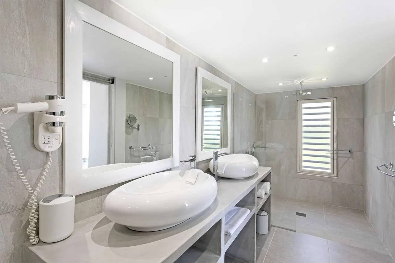 Each bedroom has a king-size bed, ensuite bathroom with shower, and satellite TV. One bedroom opens to a private terrace, while the other 2 bedrooms have direct access to the pool.