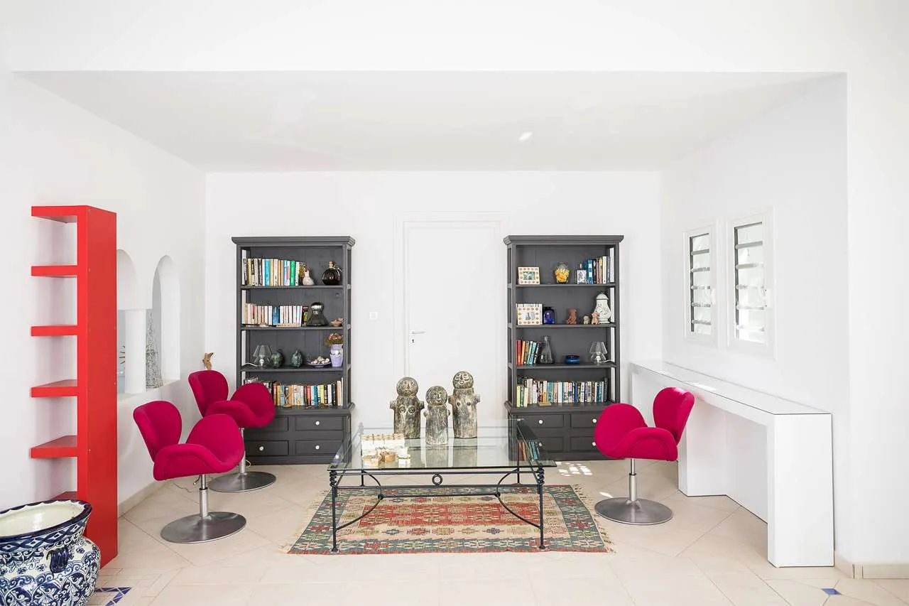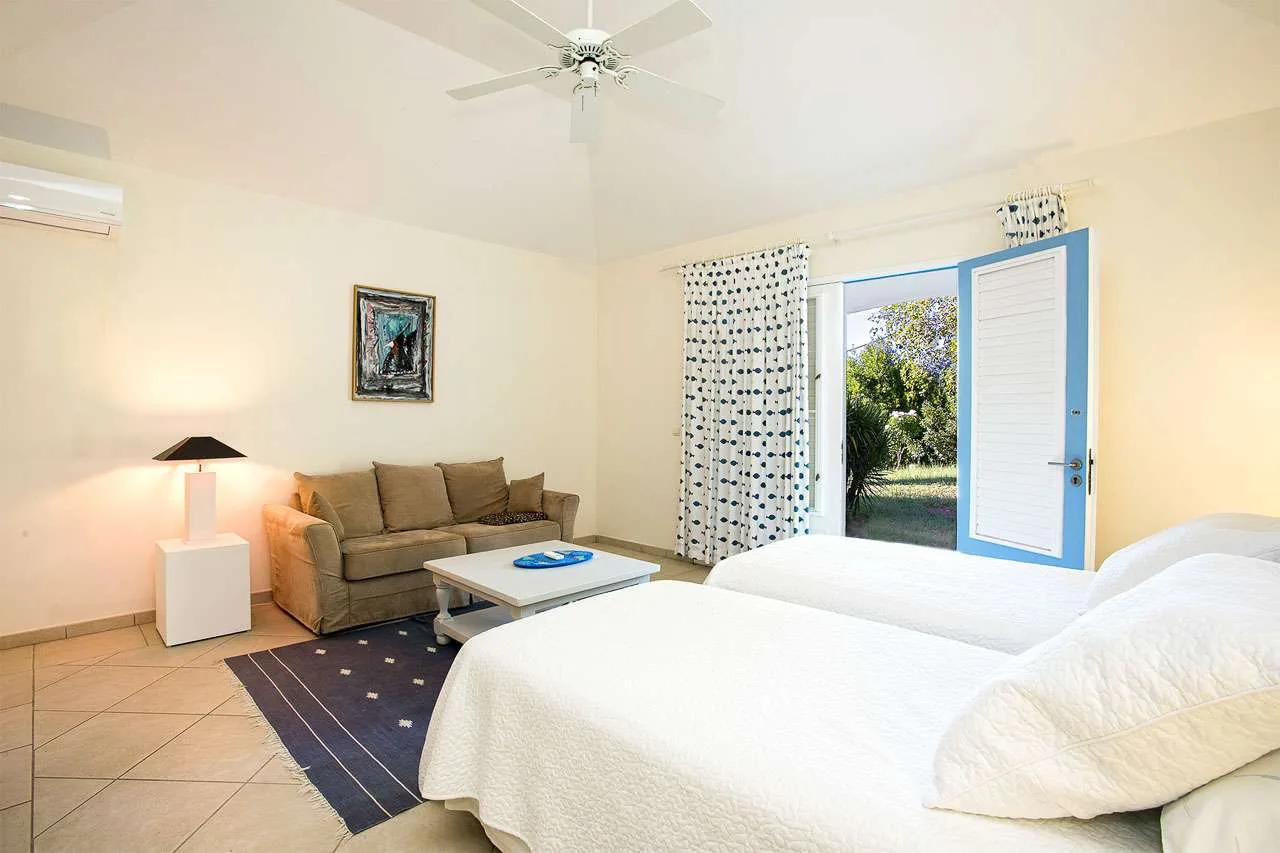 The spacious living room with sink-into couches opens to a covered terrace with a bright yellow cushioned lounge area next to the pool. The covered terrace also houses a dining table with seating for up to 6 guests. The living room shares its space with a small dining area and leads to a second living area with striped couches and shelves lined with books. The colorfully tiled, well-equipped kitchen has a pass-through window to the pool deck. Each air-conditioned bedroom has a ceiling fan, screens, and ensuite bathroom with shower. One bedroom has twin beds (ideal for children), while the other 3 bedrooms have king-size beds.
