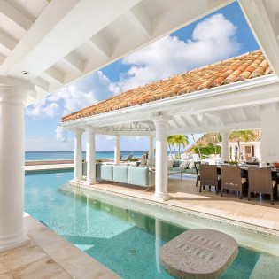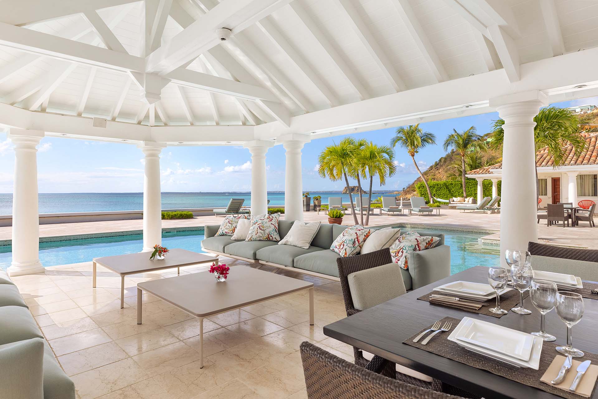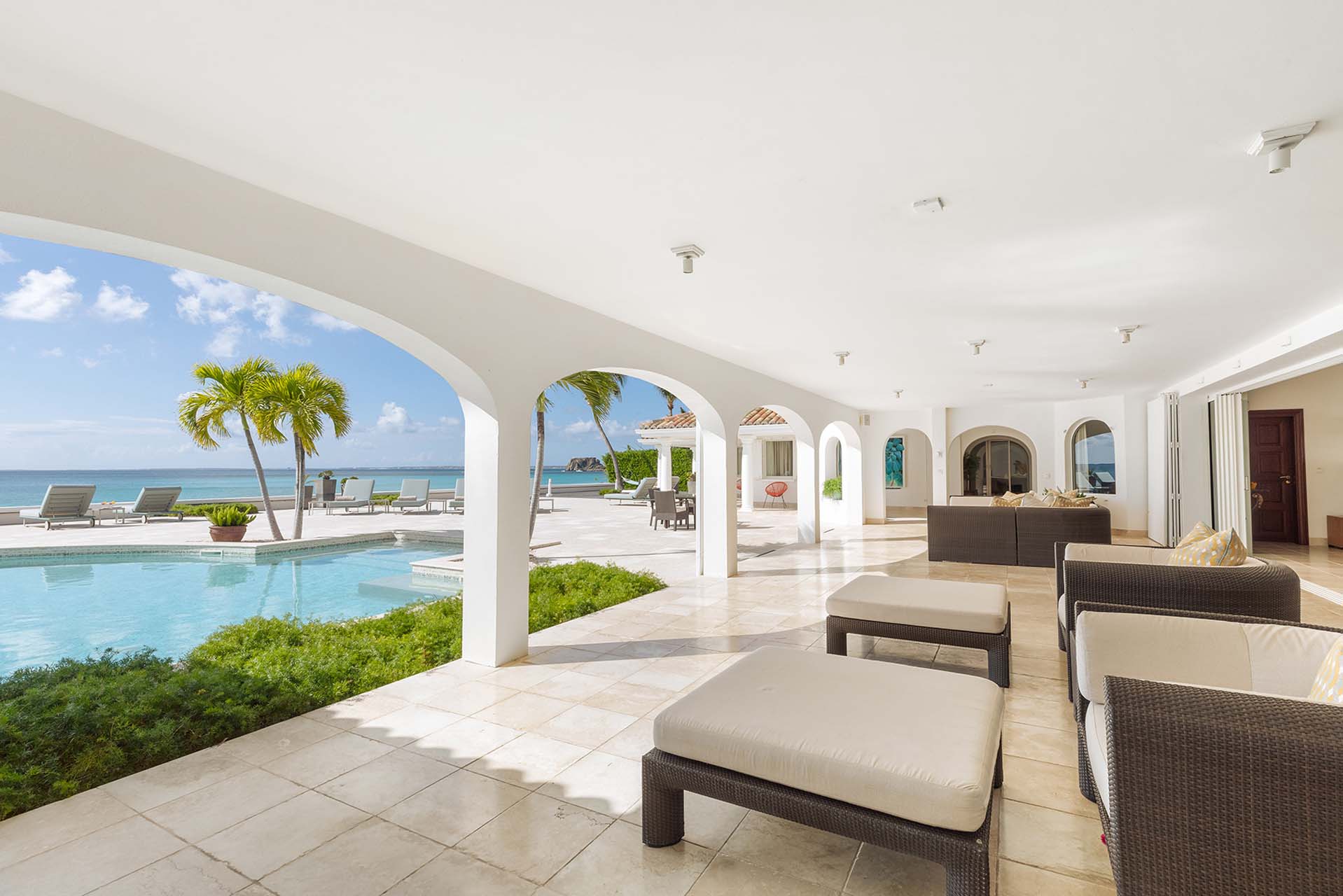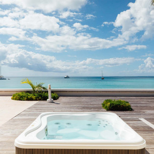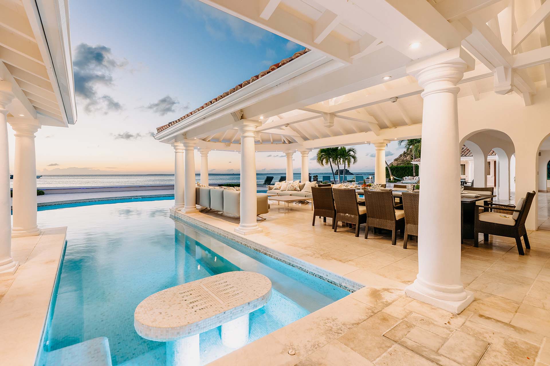 A large deck with loungers and palm trees frames the unique, large swimming pool, which surrounds the covered lounge and dining area. The swimming pool is partially covered and is heated. Adjacent to the beach is a Jacuzzi and sitting area with cushioned Rattan chairs.