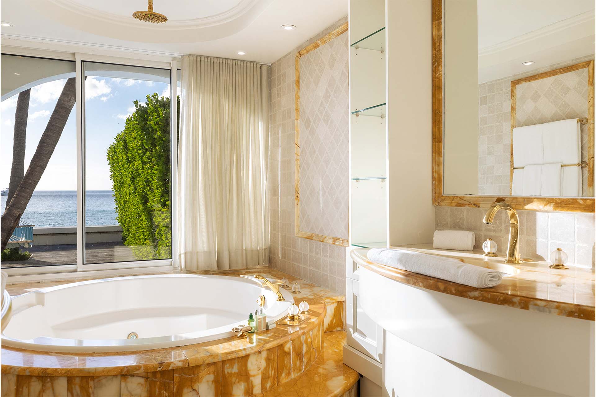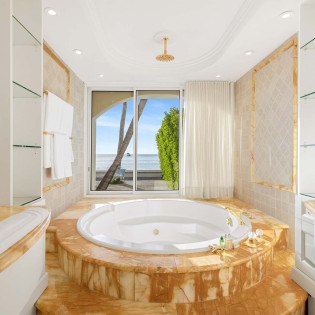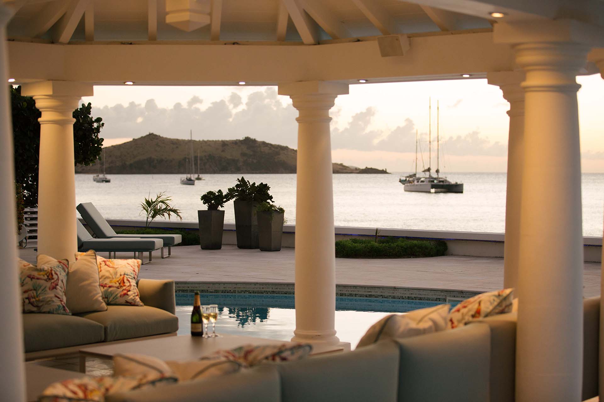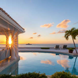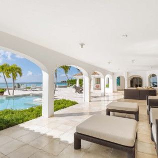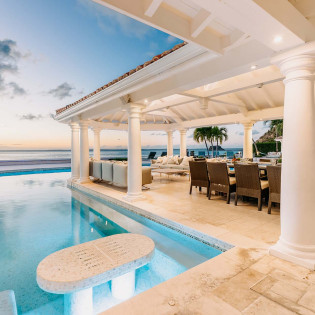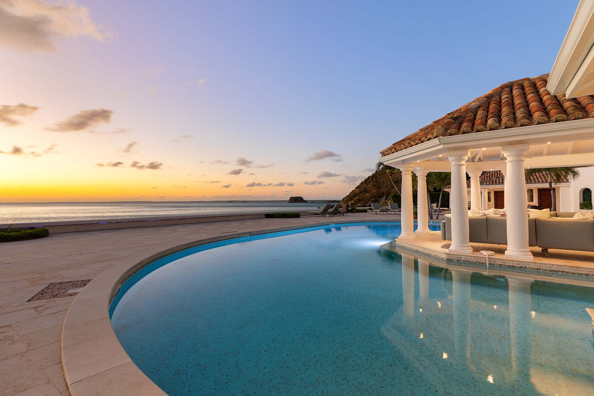A large deck with loungers and palm trees frames the unique, large swimming pool, which surrounds the covered lounge and dining area. The swimming pool is partially covered and is heated. Adjacent to the beach is a Jacuzzi and sitting area with cushioned Rattan chairs.