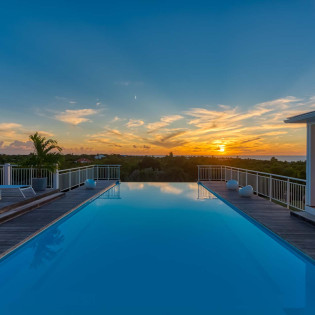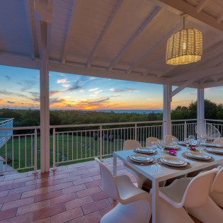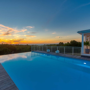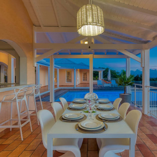 As you enter the villa and out to the terrace, the richly variegated scenery expands into a panoramic view filled with a profusion of color and texture. The blues of the Caribbean and tropical sky are accented by white clouds, Anguilla’s green silhouette and colorful tropical foliage. Below are the elegant villas and gardens of Terres Basses. At dusk, brilliant sunsets create colorful backdrops for evening entertainment.
