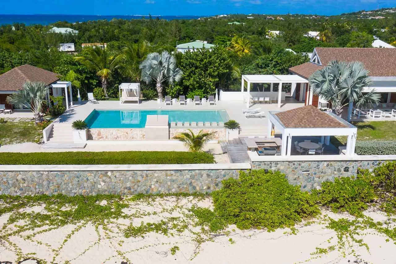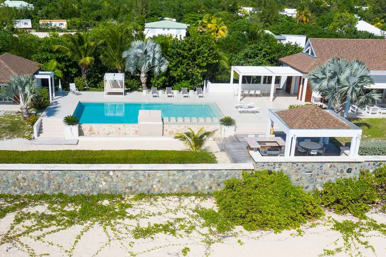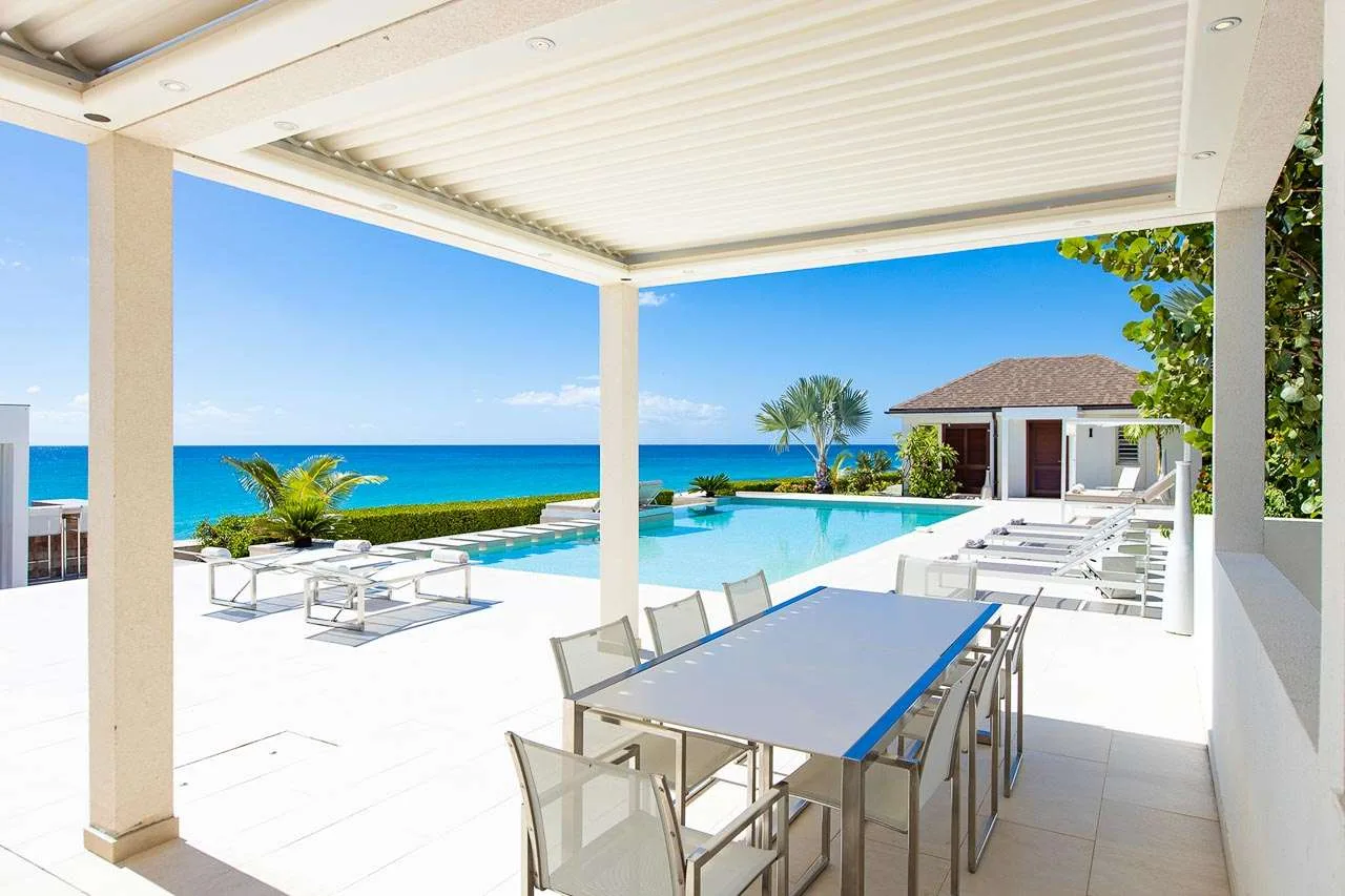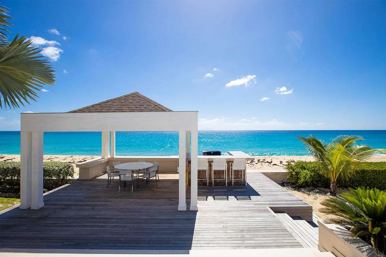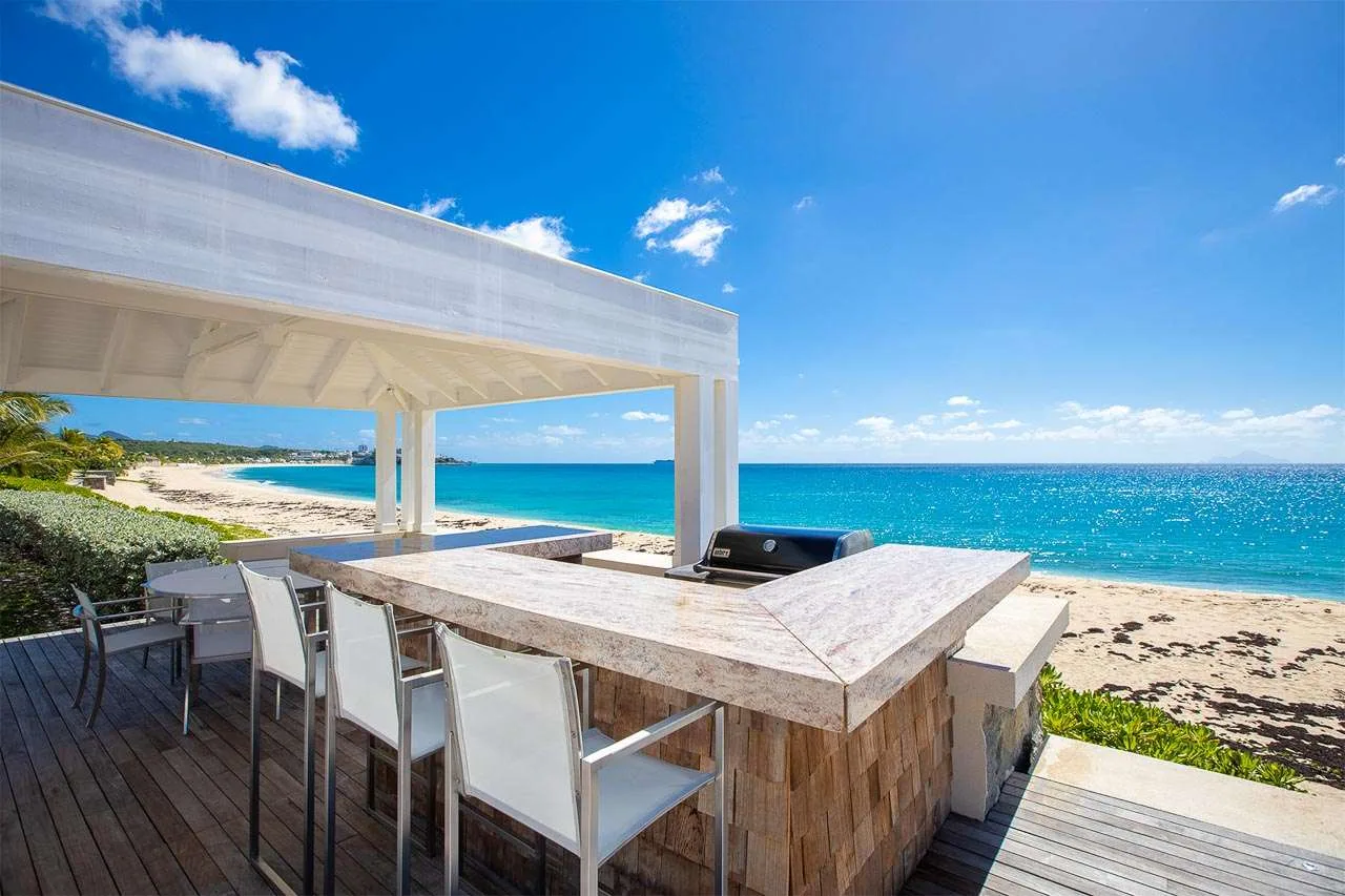 The open concept main house extends to the terrace, which has a covered dining patio, a gazebo with beach bar, and an outdoor living area with views of the beach. Daybeds and loungers surround the large infinity edge pool.