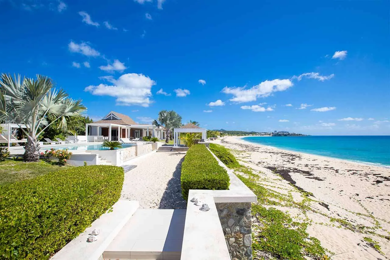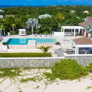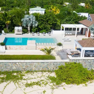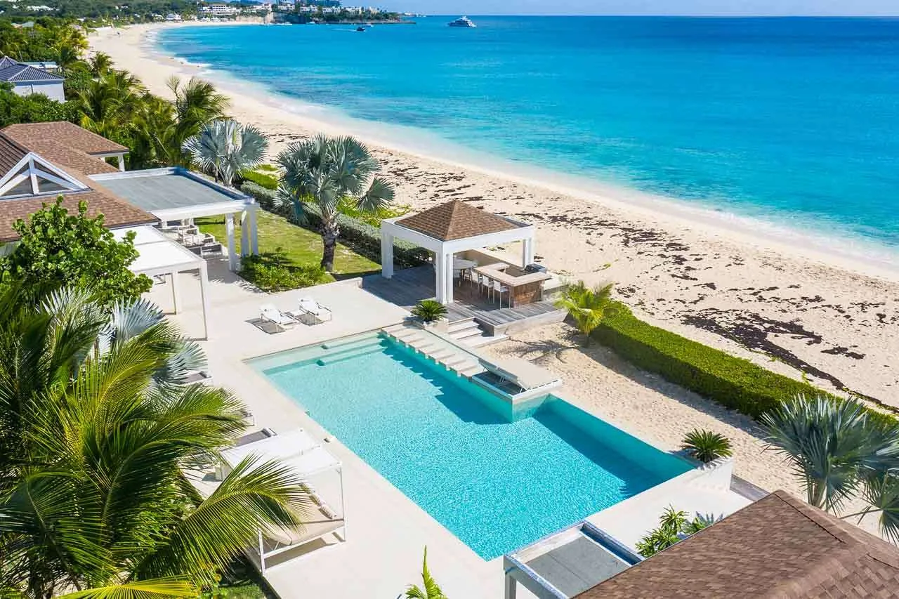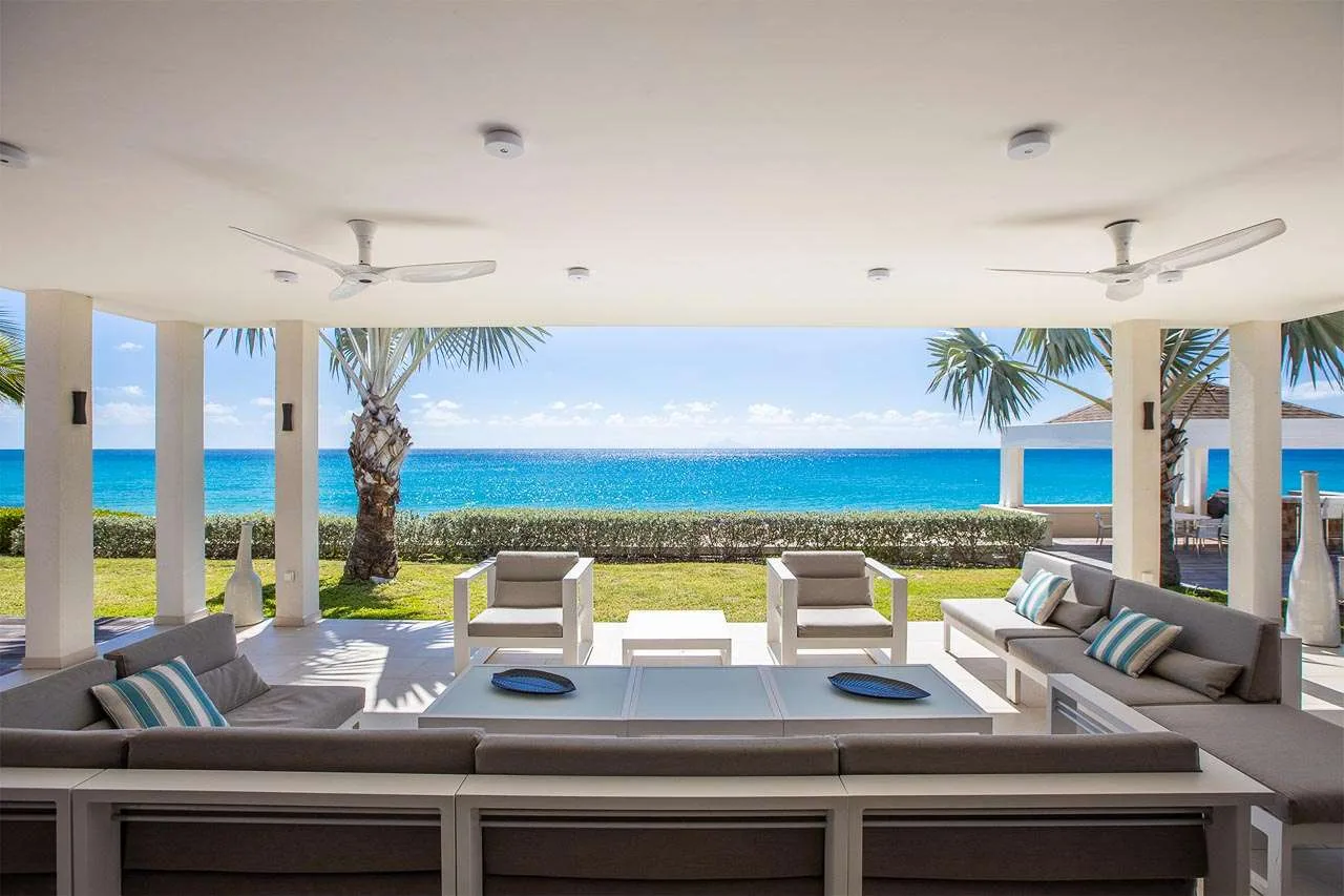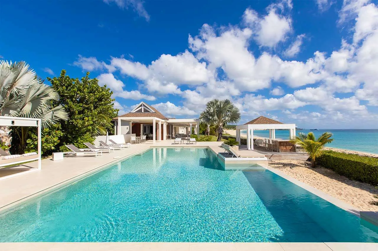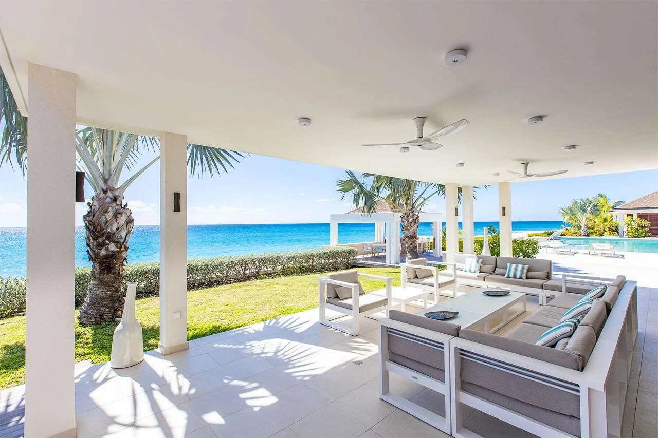 The open concept main house extends to the terrace, which has a covered dining patio, a gazebo with beach bar, and an outdoor living area with views of the beach. Daybeds and loungers surround the large infinity edge pool.