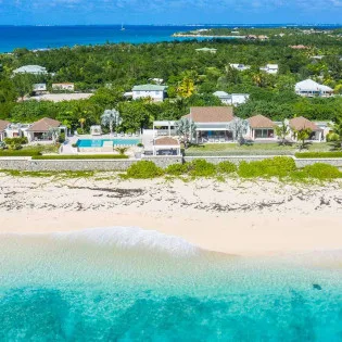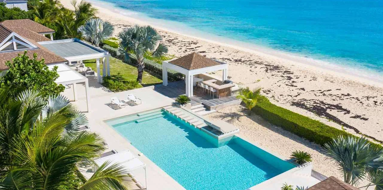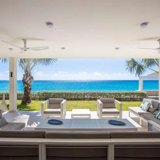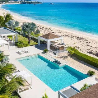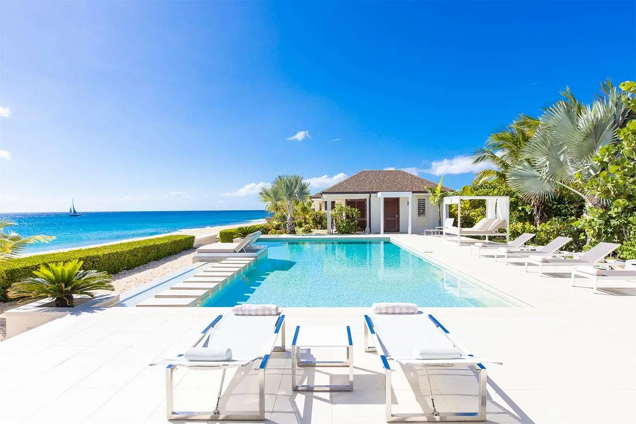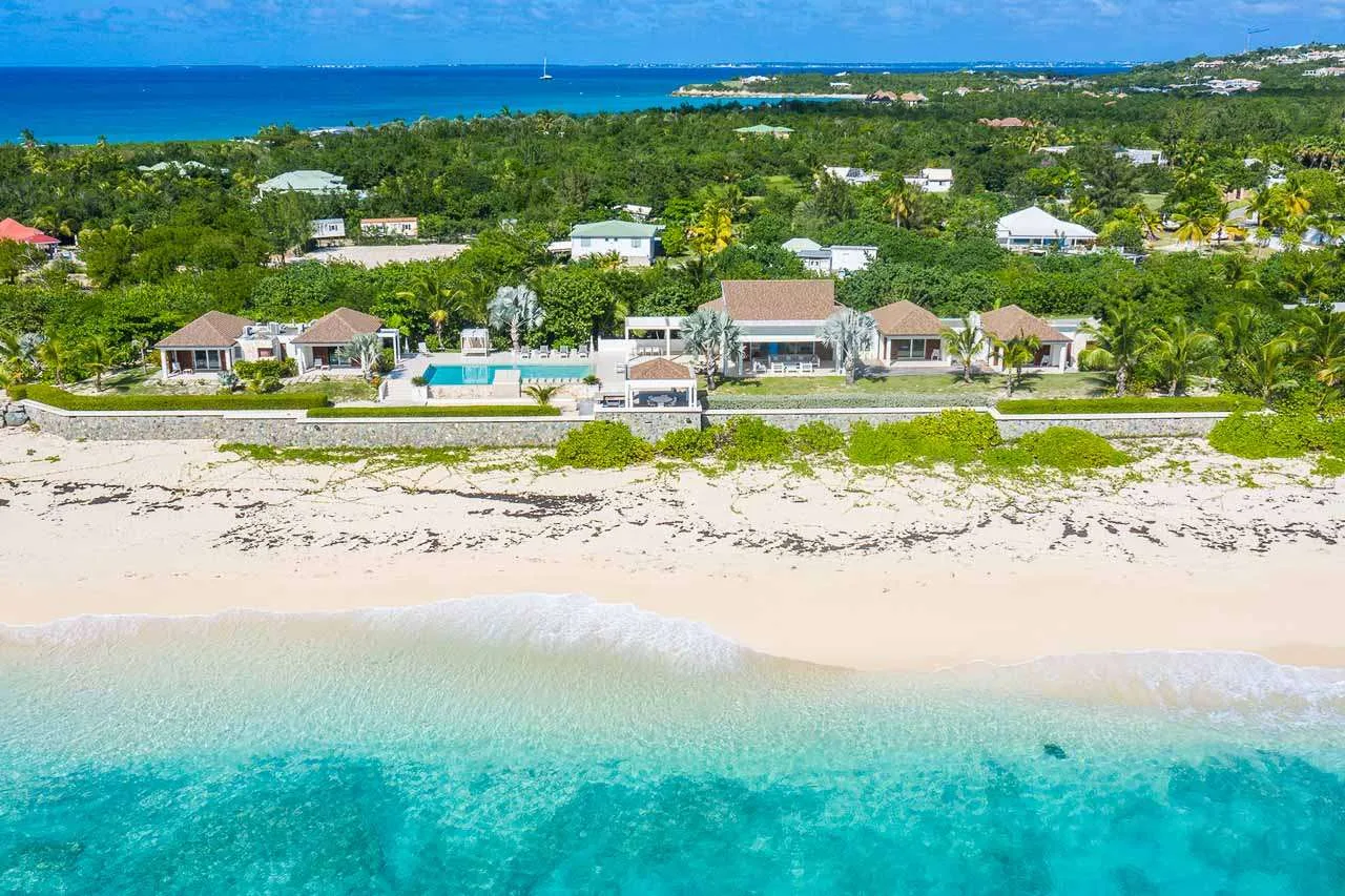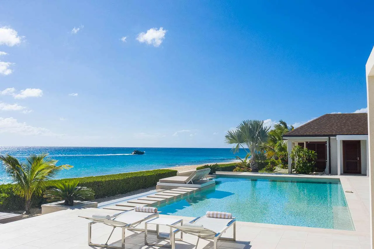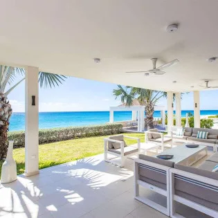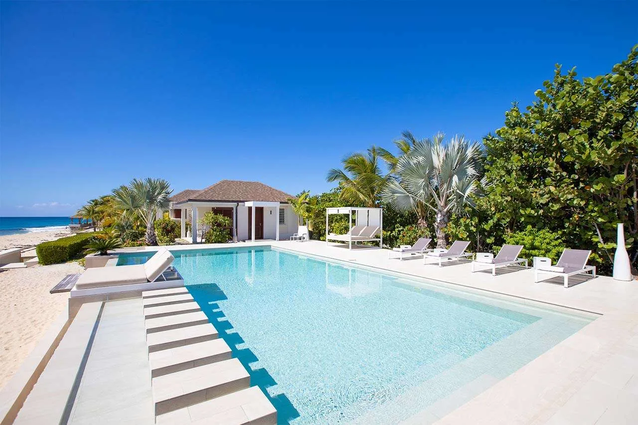 The open concept main house extends to the terrace, which has a covered dining patio, a gazebo with beach bar, and an outdoor living area with views of the beach. Daybeds and loungers surround the large infinity edge pool.